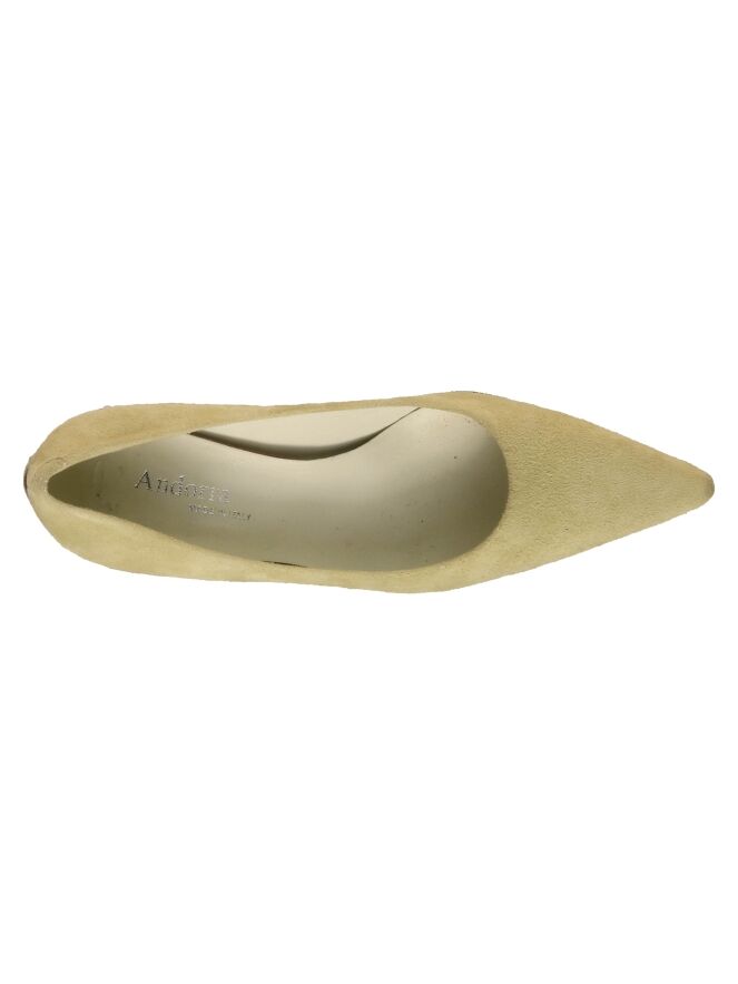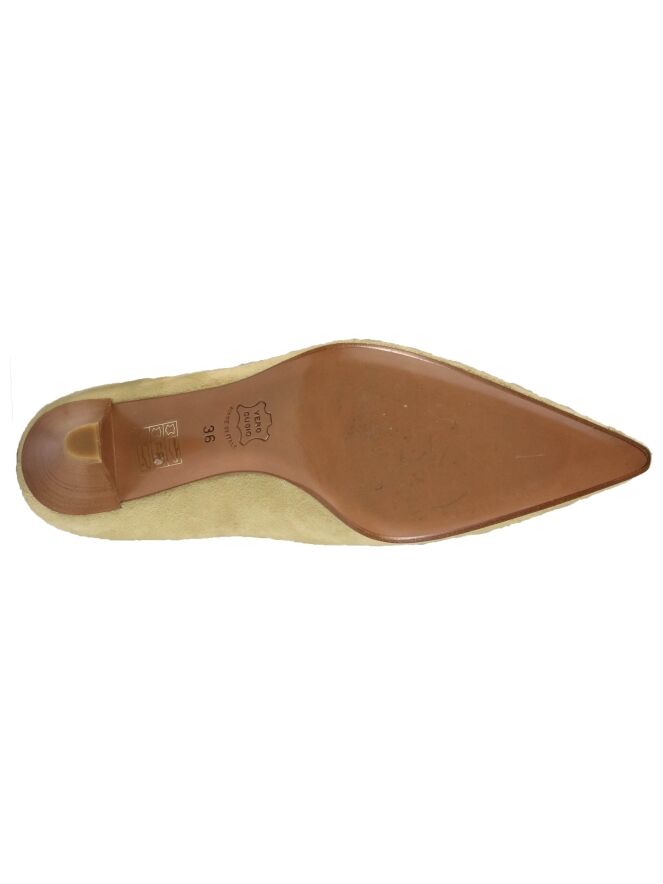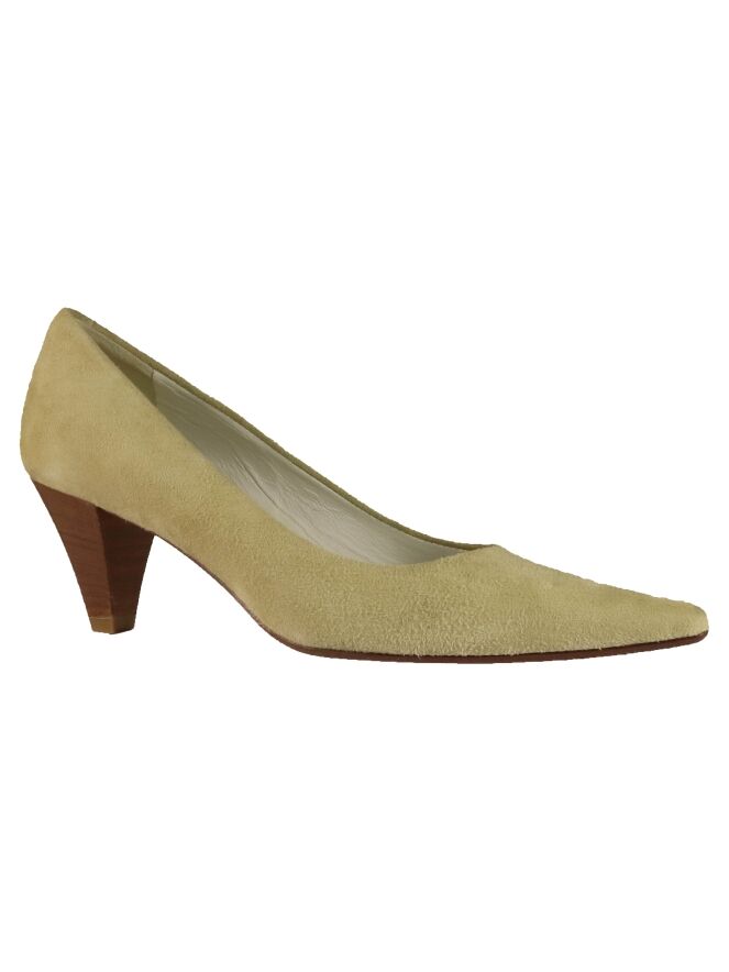 Een pump van het merk Even and Odd in de kleur zand. De elegante hak is in een hout kleur. De pump heeft een spitse neus. De binnenkant van de pump is met leder gevoerd.