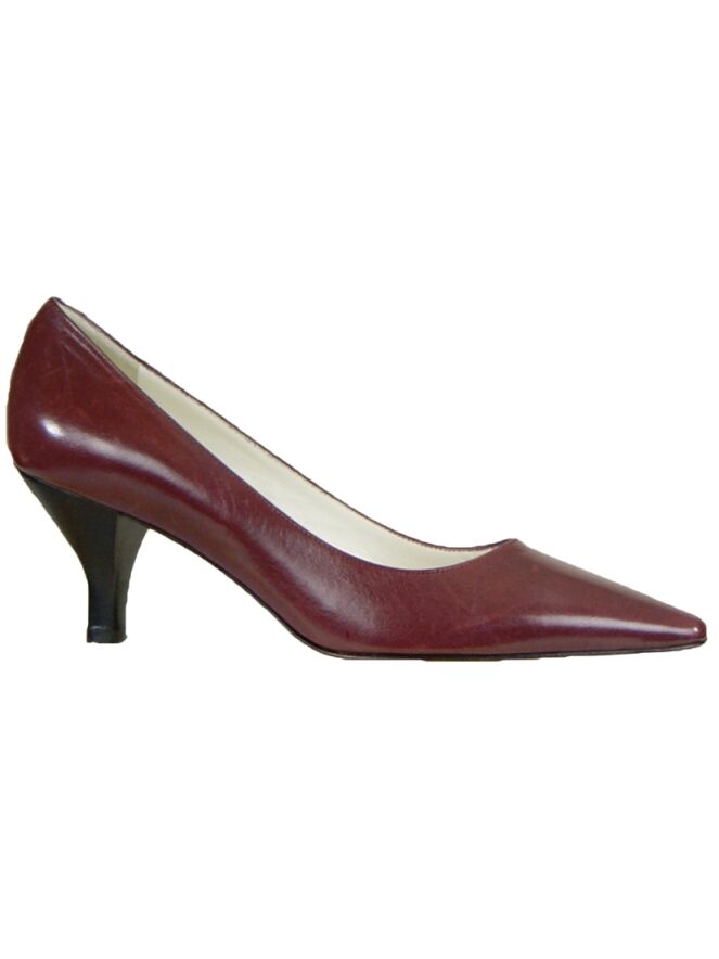 Een pump van het merk Even & Odd in de kleur paars. De pump heeft een spitse neus en de hak is in de kleur zwart. De binnenkant van de pump is met leder gevoerd.