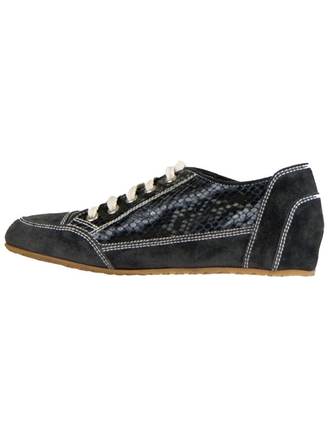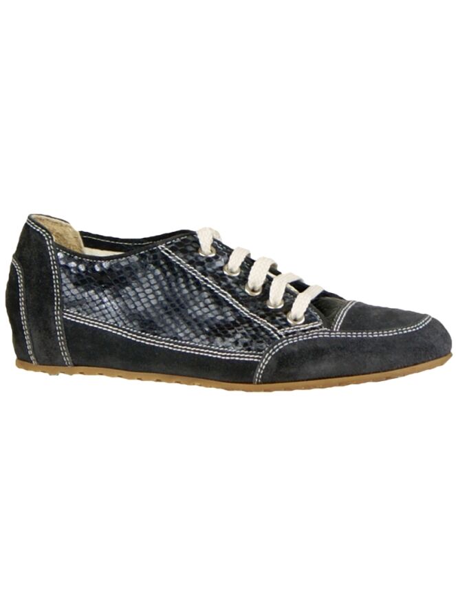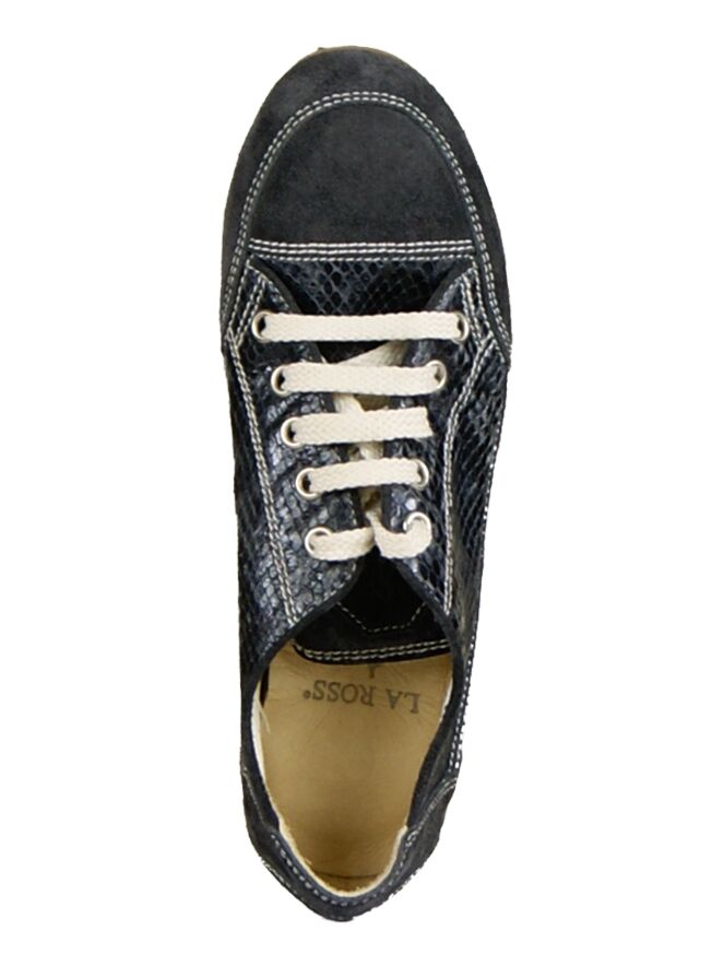 Deze lage sneaker van Even & Odd is gemaakt van een soepele camoscio suède op de neus, hiel en zijkanten. De kleur hiervan is mat zwart. Vanaf de boven zijkanten en op het voorpand van de sneaker is een parelmoer metallic gekleurde slangeprint in parelmoer zwart. De zool is een anti slip flex zool. De veter van deze sneaker is in kleur off white.