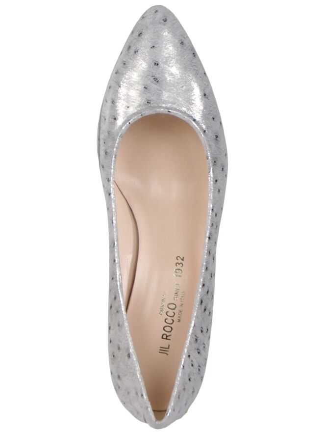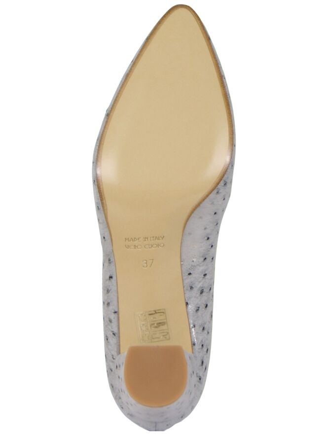 Een pump van het merk Even & Odd in een struisvogel print in een grijze kleur met zilver. De pump heeft een spitse neus. De hak is in hetzelfde leder als de pump. De binnenkant is met leder gevoerd.
