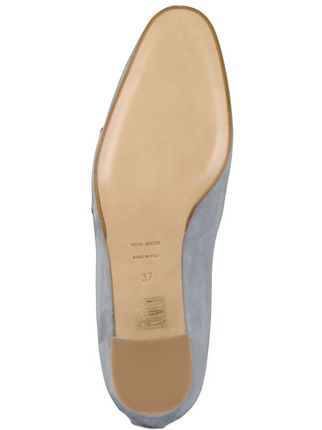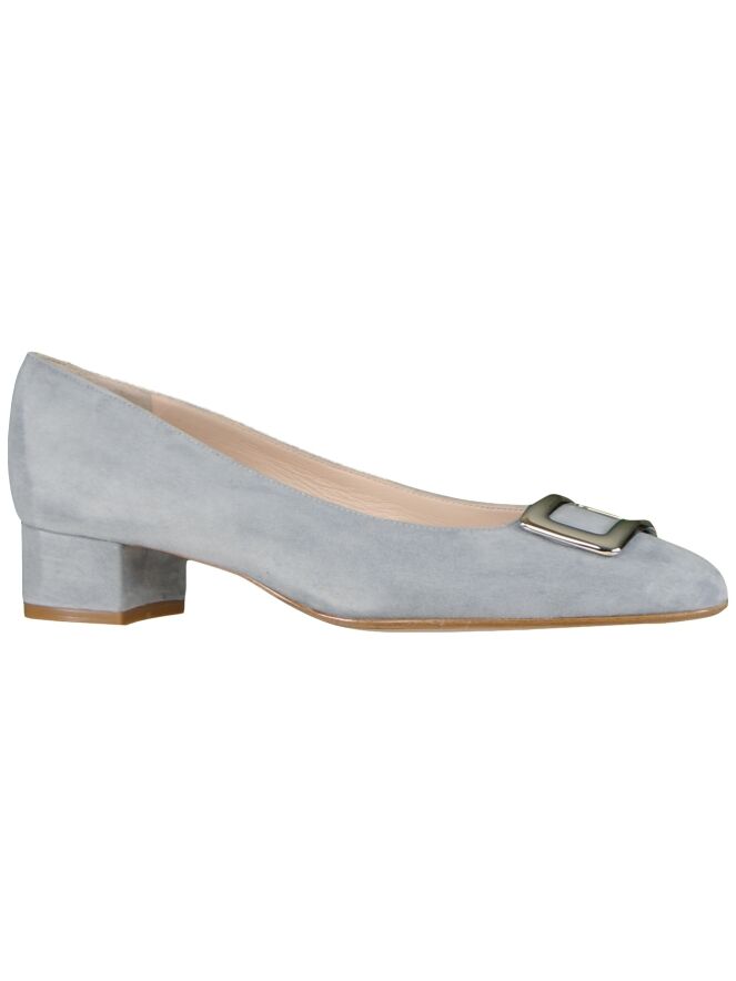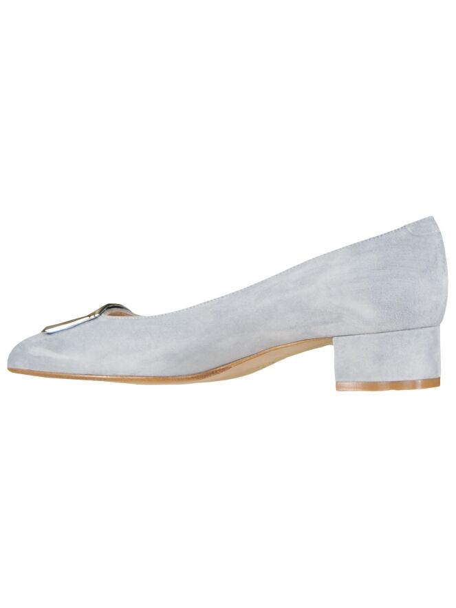 Een pump van het merk Even & Odd in een licht grijze kleur. De pump heeft een ronde neus en op de voorvoet is een rechthoekige zilver kleurige gesp. De hak is in hetzelfde suède bekleed als de pump. De binnenkant is met leder gevoerd.