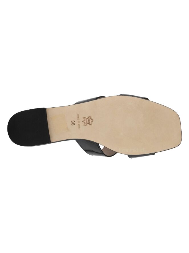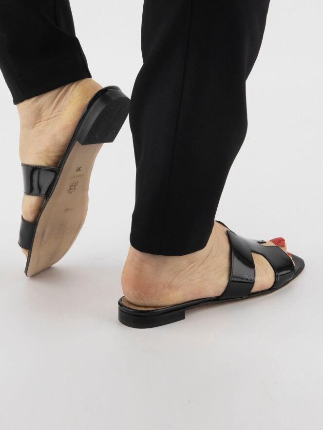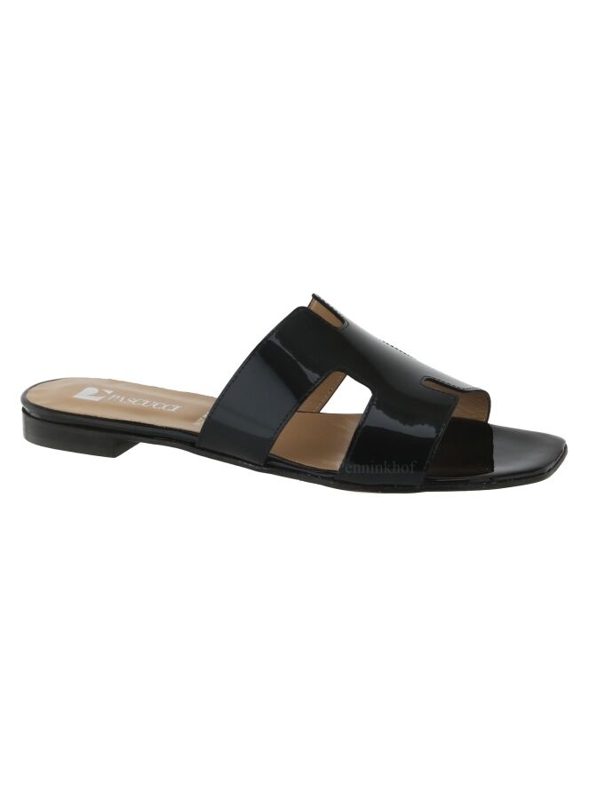 Een slipper van Even and Odd (Pascucci) in zwart lak leder. Het lakleder heeft aan de zijkanten 2 openingen. Het voetbed is deels van leder en aan de voorkant in zwart lak leder.
