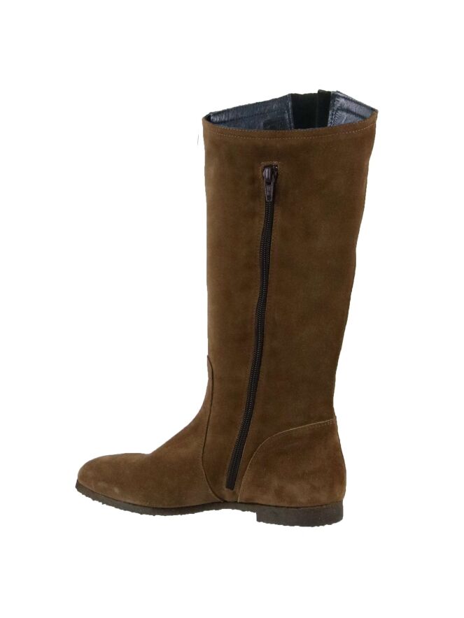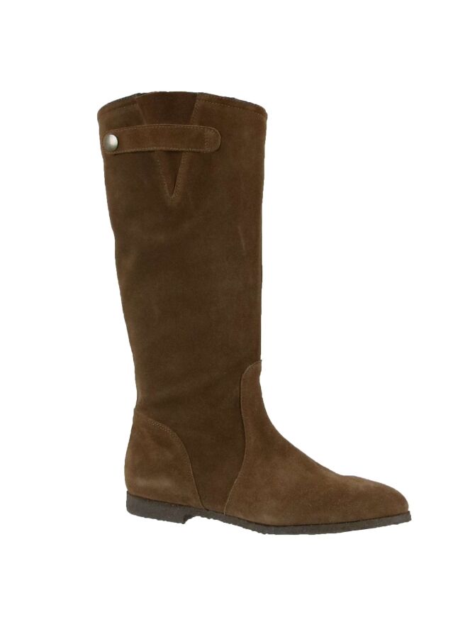 Een laars van "Even and Odd" in de kleur cognac. De laars heeft een spekzool. De bovenkant van de schacht heeft een split met hier overheen een decoratieve bies met een stud. De binnenkant is met leder gevoerd.