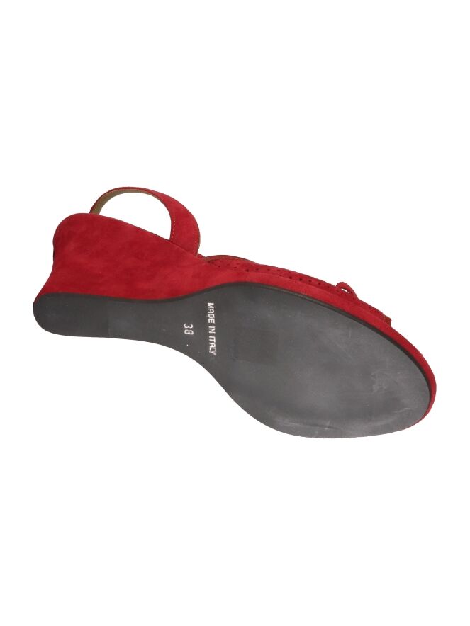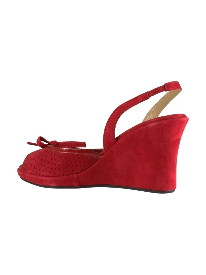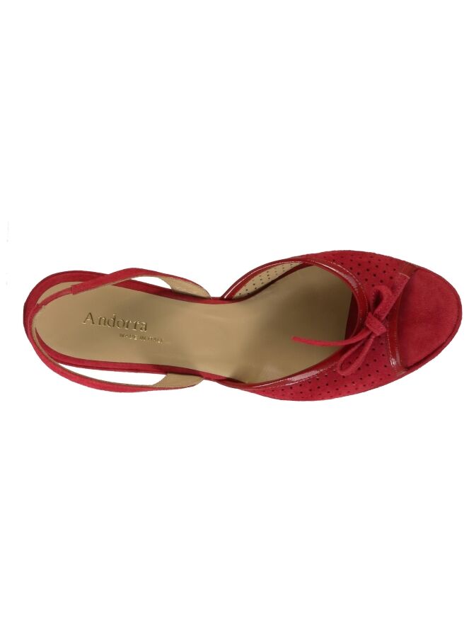Een open pump van Even & Odd in de kleur rood. Het suède is fijn geperforeerd en de randen hebben een zwarte lak bies. Op de voorvoet is een fijn suède strikje.