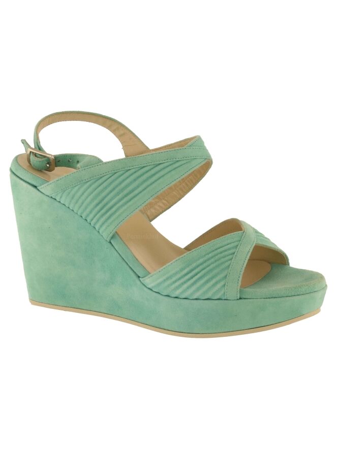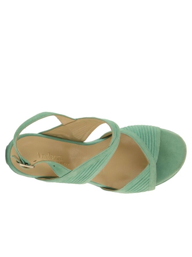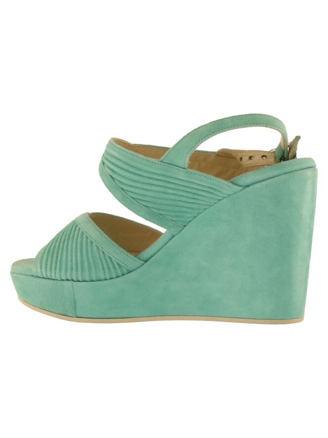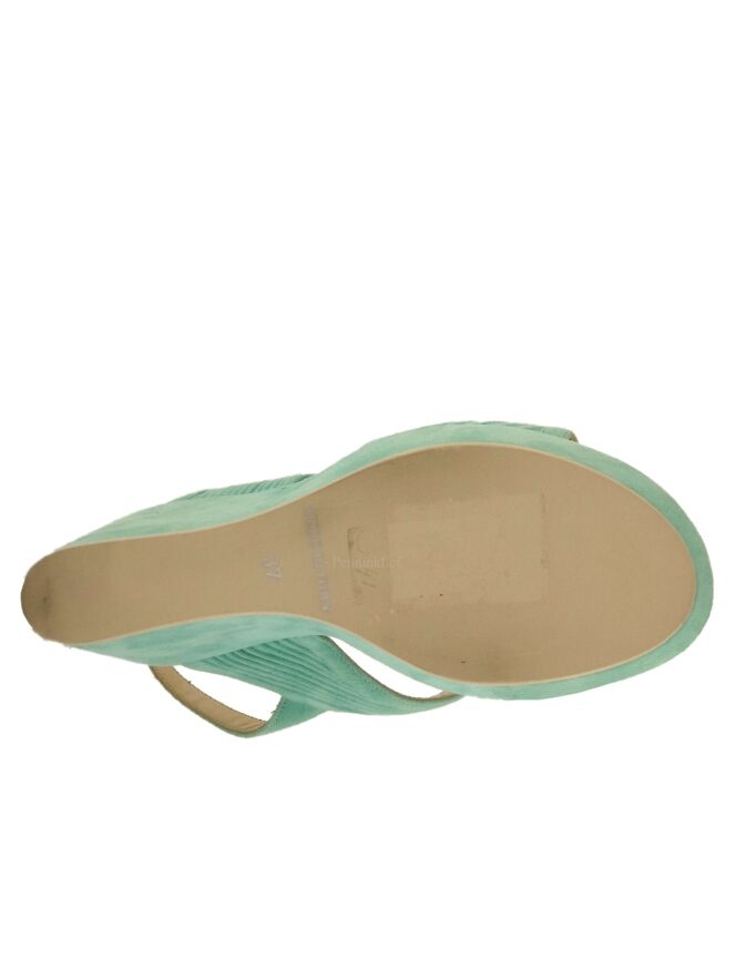 Een sandaal van het merk Even & Odd in de kleur turquoise met een sleehak. De sandaal heeft een open hiel en een open neusje. Het suède is fijn geplooid. De binnenkant van de pump is met leder gevoerd.