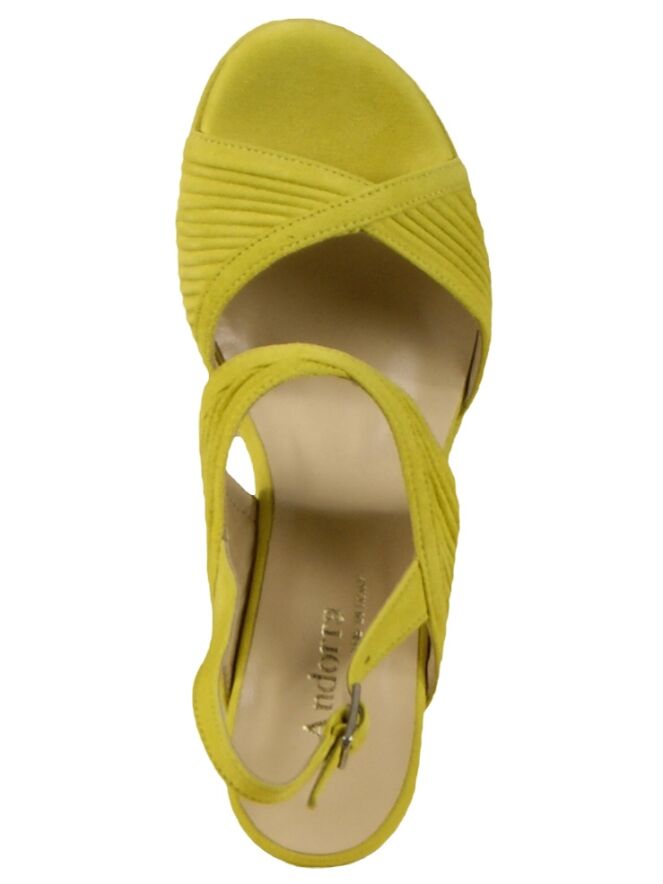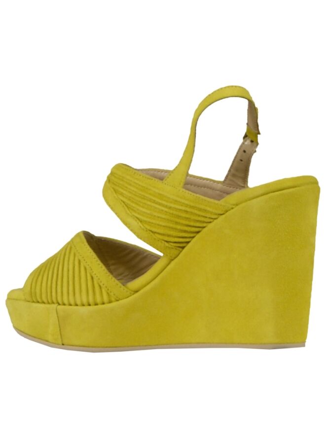 Een sandaal van het merk Even & Odd in de kleur citroen geel met een sleehak. De sandaal heeft een open hiel en een open neusje. Het suède is fijn geplooid. De binnenkant van de pump is met leder gevoerd.