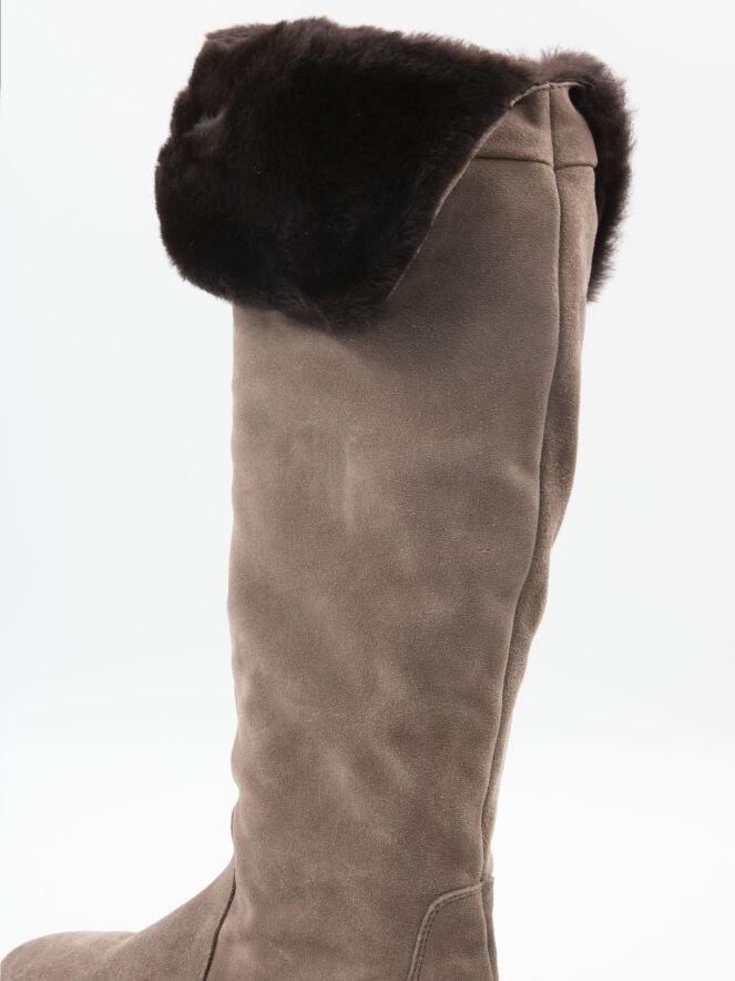 Een laars van "Even and Odd" in de kleur camel. Aan de binnenzijde van de schacht is een rits. Aan de bovenkant van de schacht is een omslag van imitatiebont in de kleur donkerbruin. De binnenkant is met leder gevoerd.