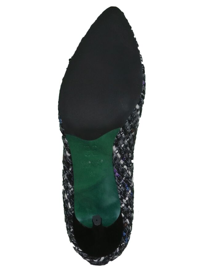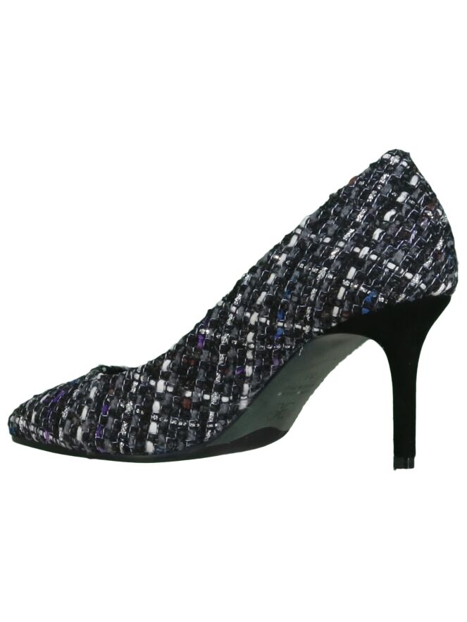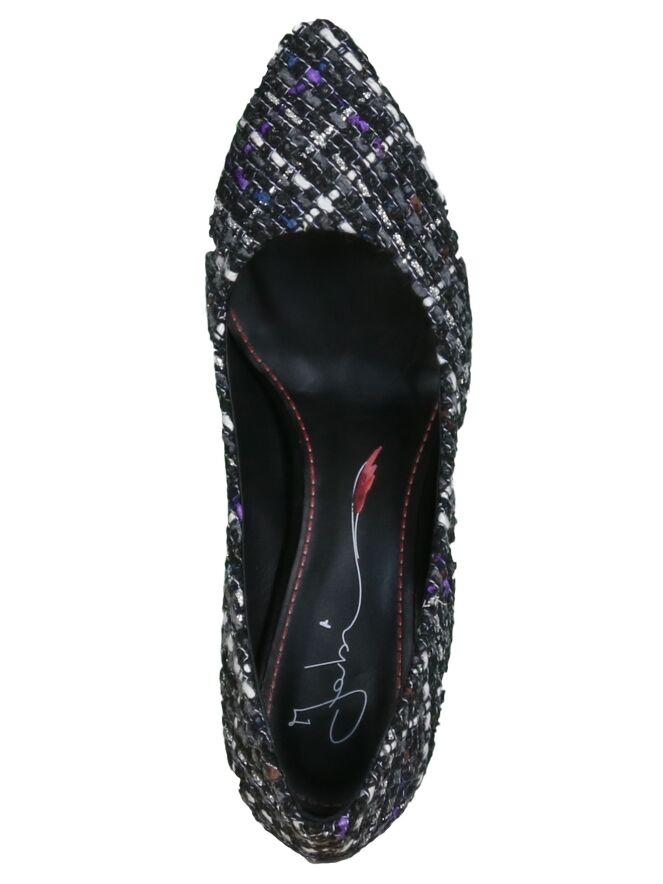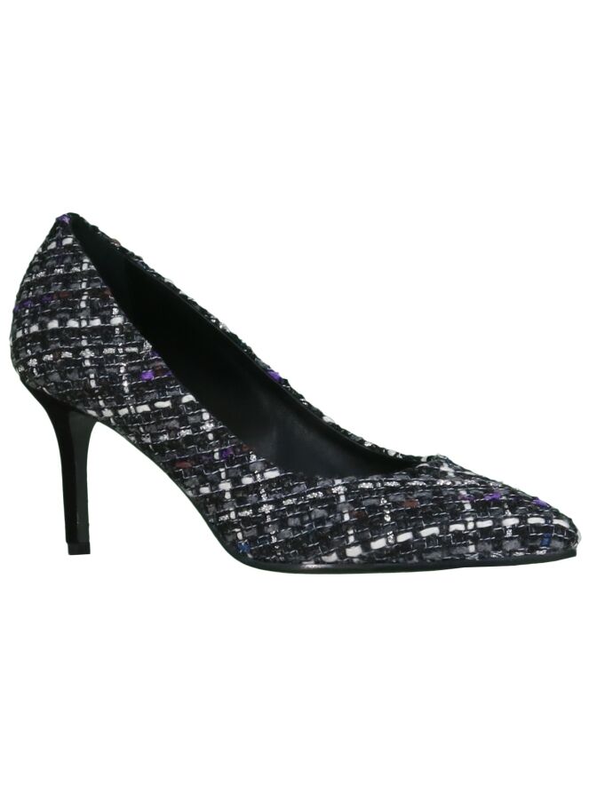Een pump van het merk Fabi in een tweedstof met de kleuren zwart, grijs, wit en paars. De pump heeft een spitse neus en heeft een smalle elegante hak in de kleur zwart. De binnenkant is met leder gevoerd. Bij deze pump hoort een tas met artikelnummer: 404086094