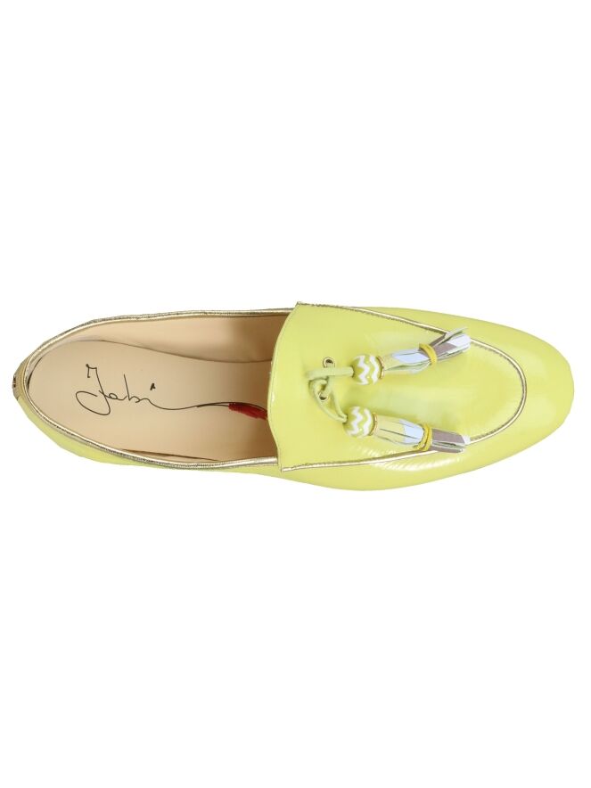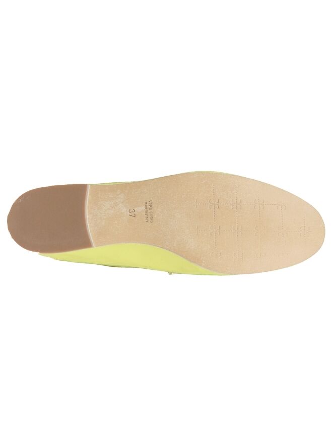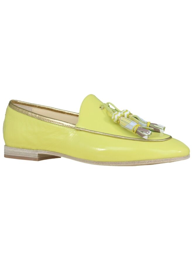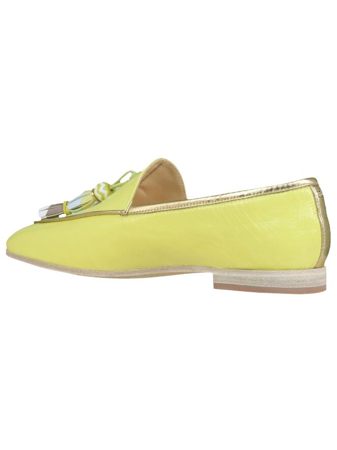 Een luxe instapper van Fabi in een limoen pistache kleur. De bies over de voorvoet en de rand van de schoen zijn in een goud kleur. Op de voorvoet zijn 2 kwastjes in de kleuren limoen, lavendel en taupe. De binnenzool is uitneembaar en de binnenkant is met leder gevoerd.