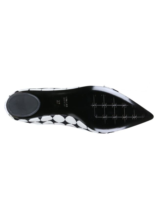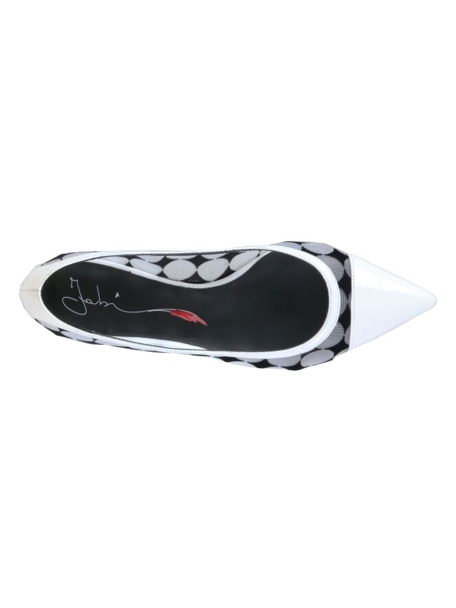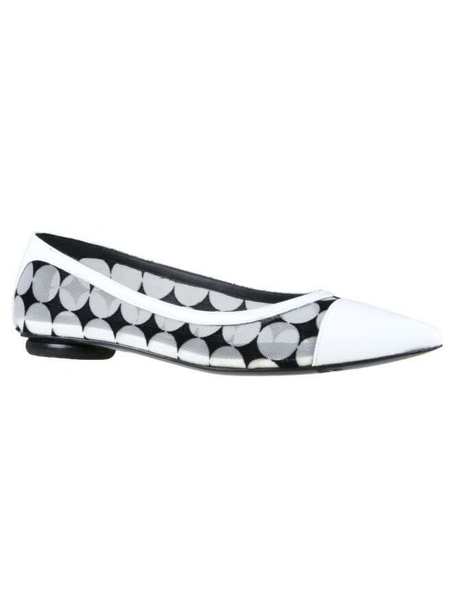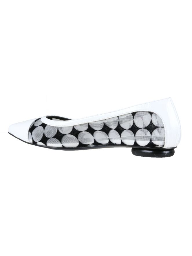 Een ballerina van Fabi in de kleur wit. Het spitse neusje en de rand is in spazzolato leder. De zijkanten en over de voorvoet is een zacht transparant gaas in een grafische print met zwart.