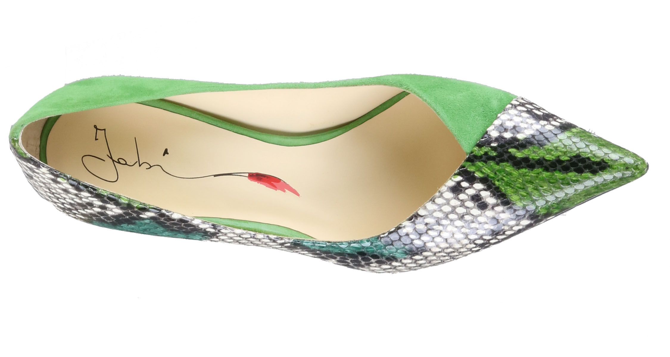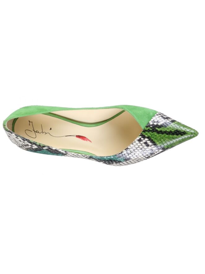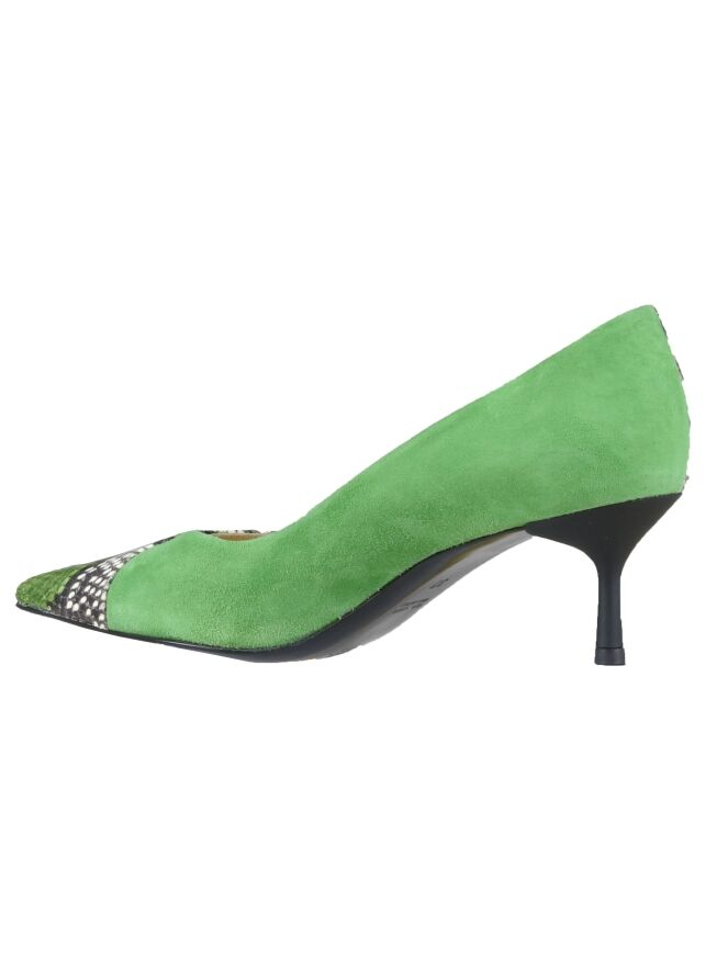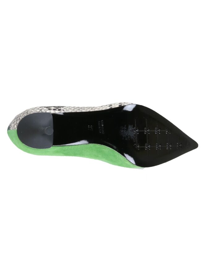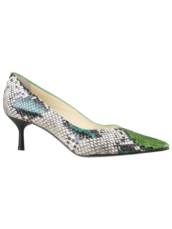 Een pump van Fabi waarvan de buitenzijde en de voorvoet in een reptielprint is met de kleuren roomwit, groen en zwart, en de binnenzijde in een camoscio suède. De pump heeft een spitse neus en een queeny hakje in de kleur zwart. De binnenkant is met leder gevoerd.
