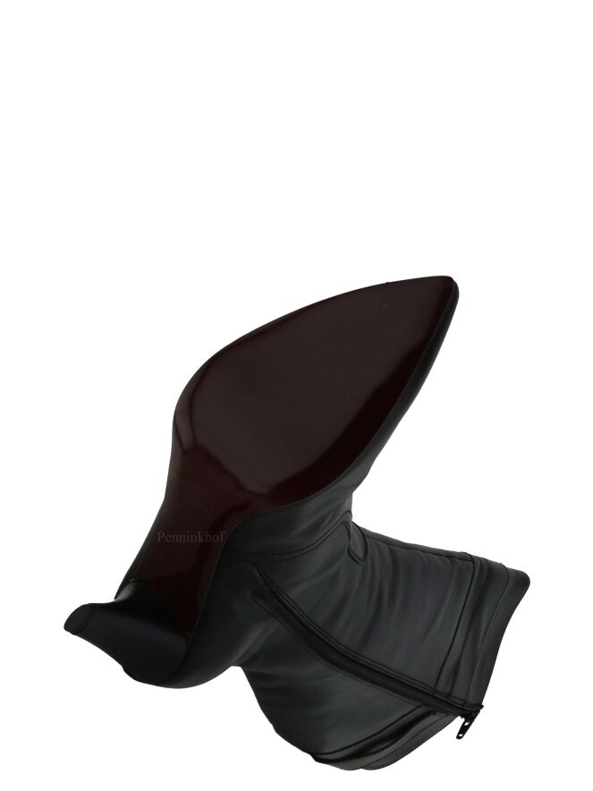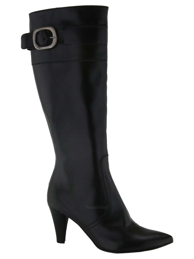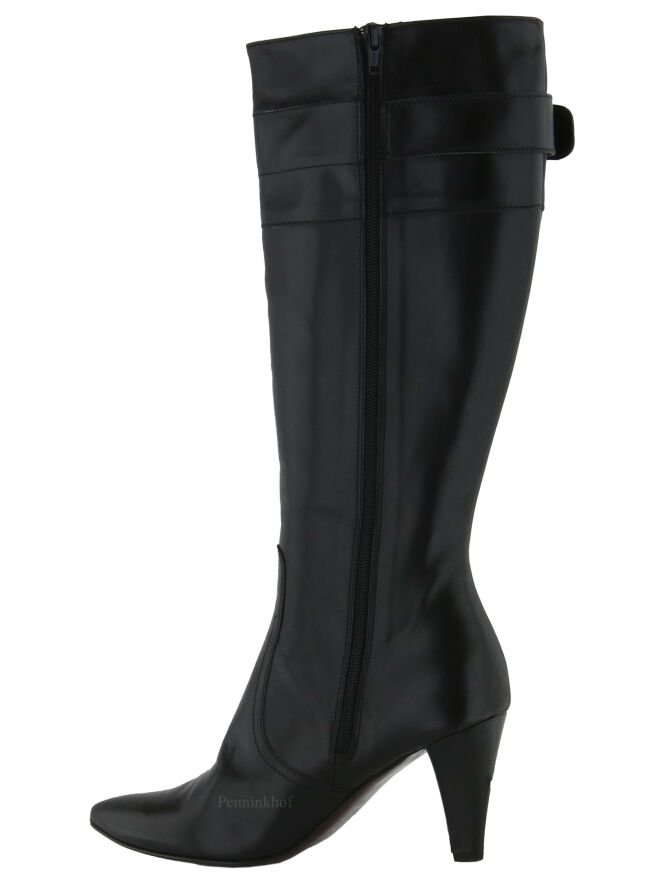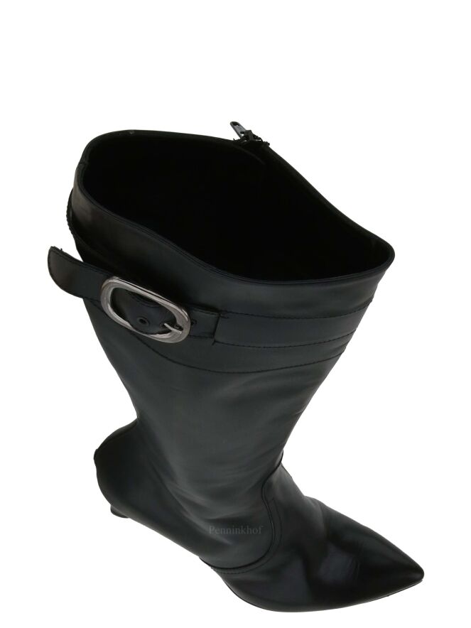 Een elegante hoge laars van Franco Troise in een zwarte kleur. De laars heeft een slanke zwarte hak en een donker rode zool. Aan de bovenkant van de schacht is een brede decoratieve bies met een zilver kleurige gesp. De laars heeft een spitse neus en de binnenkant van de schacht is met leder gevoerd.