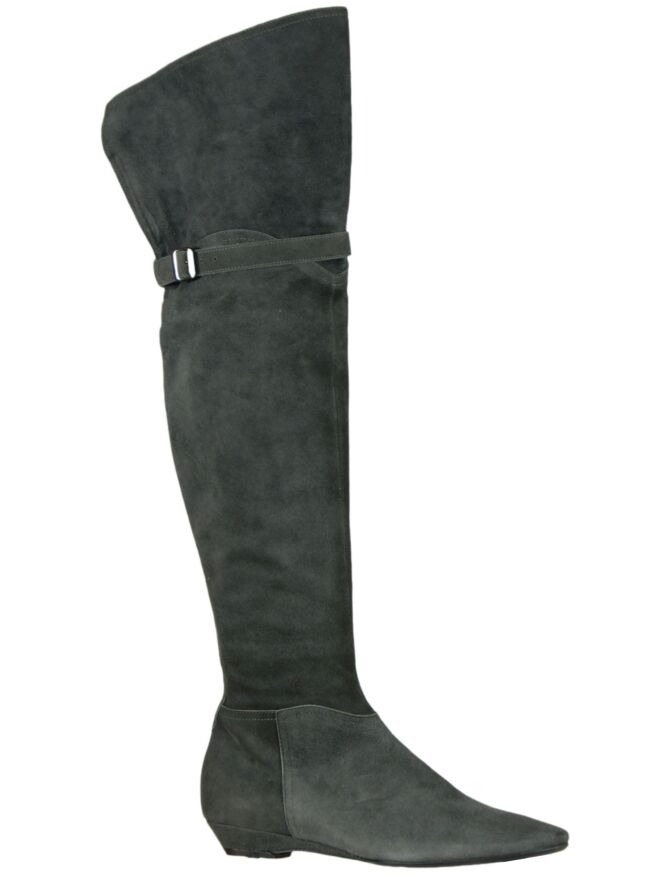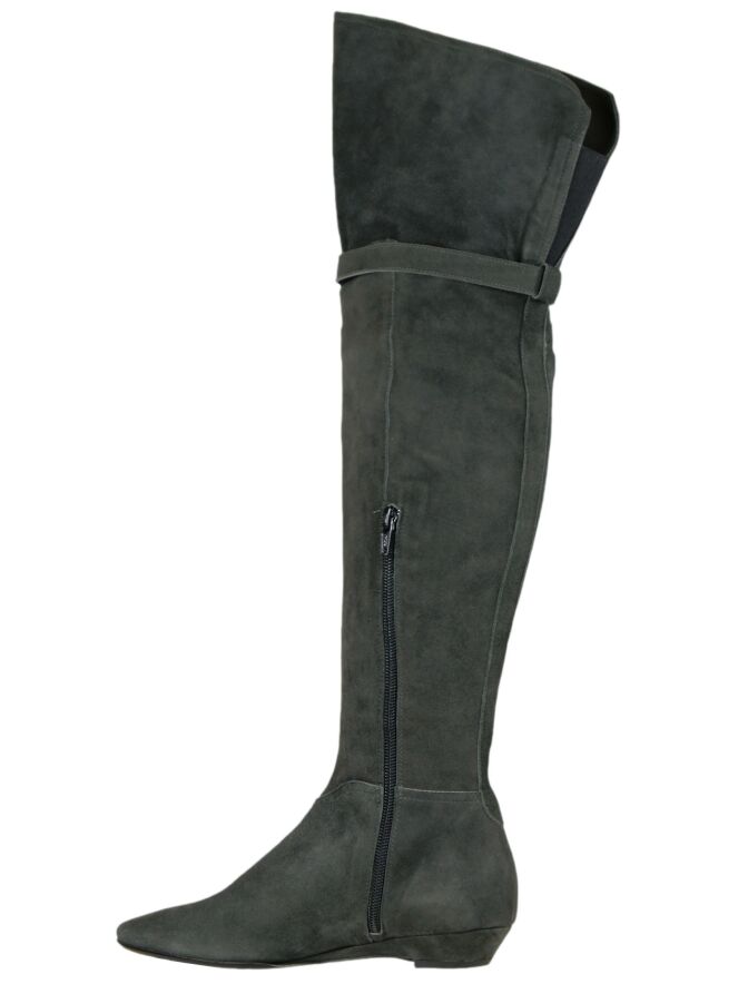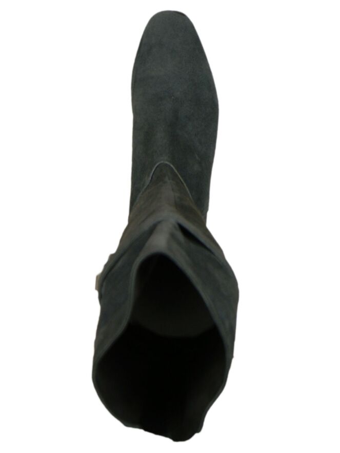 Een kuiplaars van het merk Franco Troise in een donker grijze kleur met een lage sleehak. De laars heeft een smalle leest en heeft een schacht hoogte van 41 cm met een kniestuk van 10 cm die kan worden omgeslagen. De omtrek van de schacht is 35 cm.Vanaf de zool tot halverwege de schacht is aan de binnenzijde van de laars een rits ingezet.