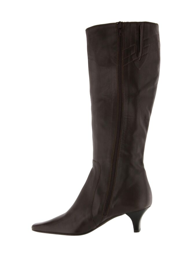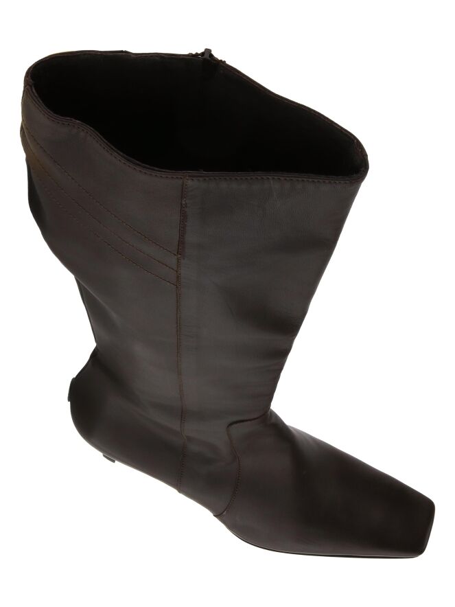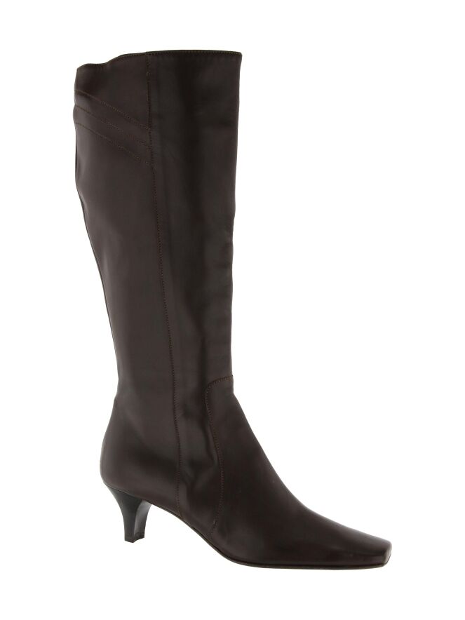 Een hoge laars van het merk Franco Troise in een mokka bruine kleur. De laars heeft een vierkante neus en een slanke hak. Aan de bovenzijde van de schacht is een inkeping met een verborgen elastieken stuk ingezet. Vanaf de zool tot aan de bovenzijde van de laars is aan de binnenzijde een rits ingezet.