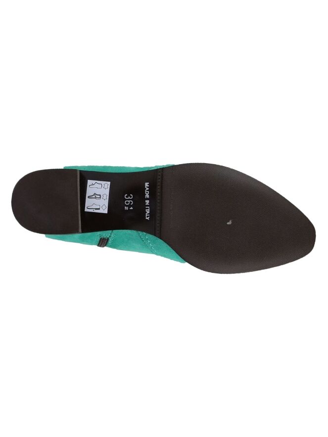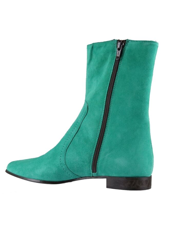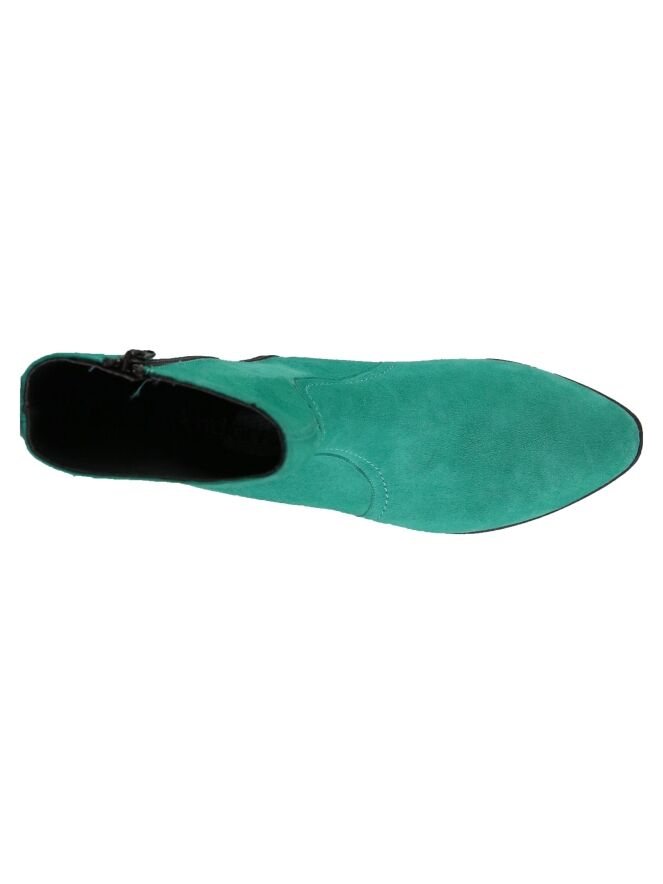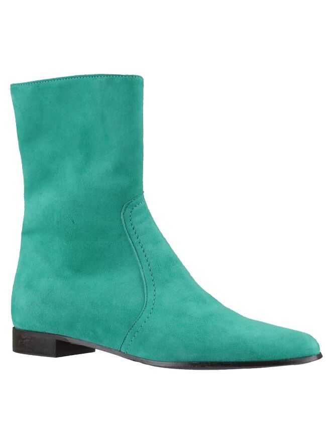 Een enkellaarsje van Franco Troise in de kleur smaragdgroen. Het laarsje heeft een iets spitse neus. Aan de binnenzijde is een ritsje en de binnenkant is met leder gevoerd.