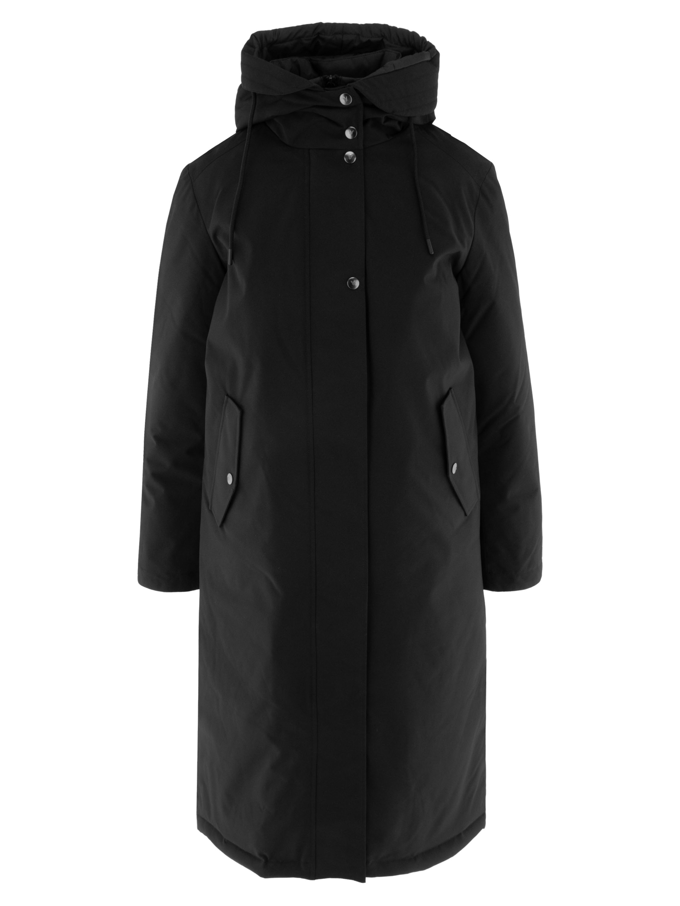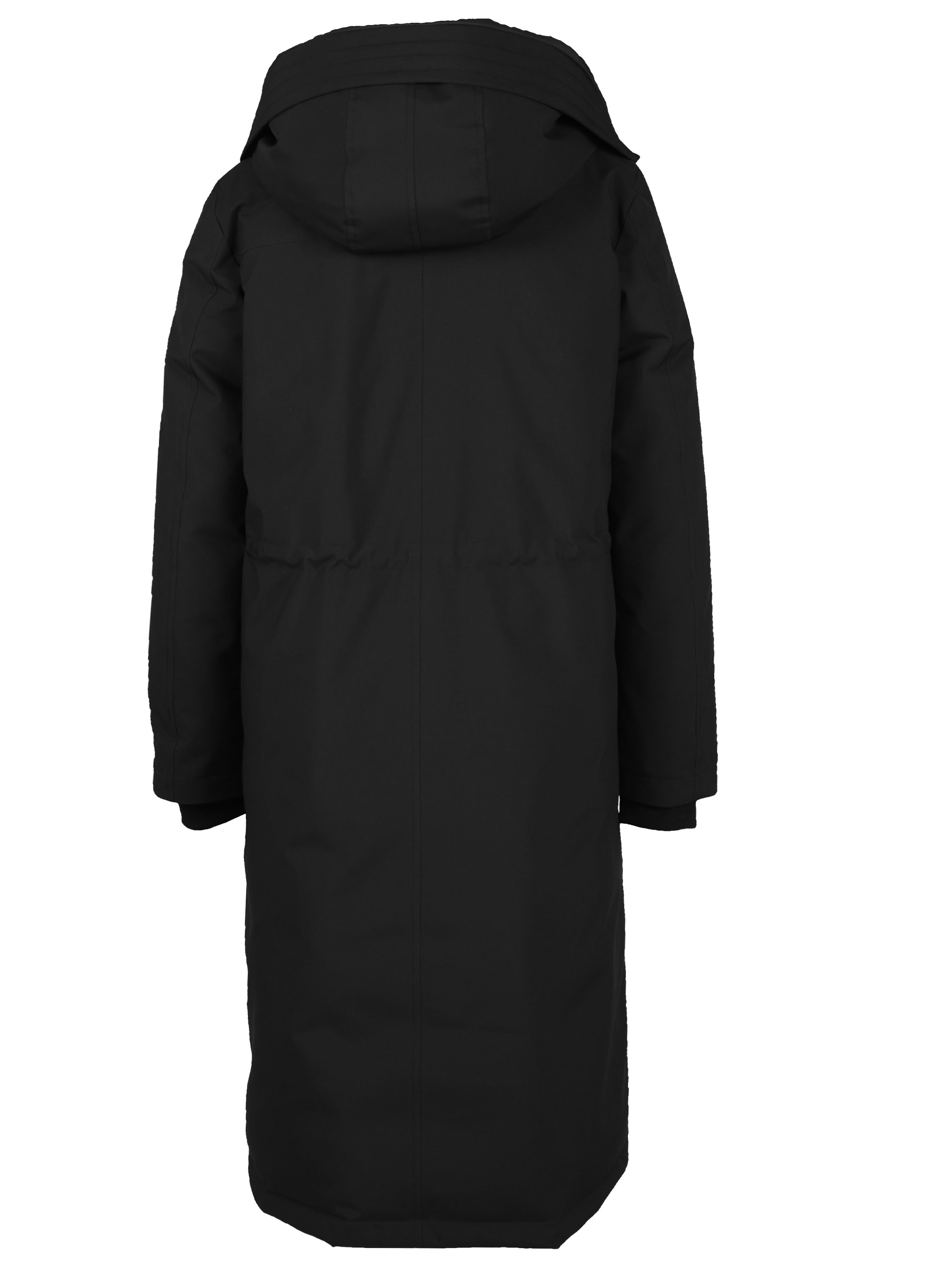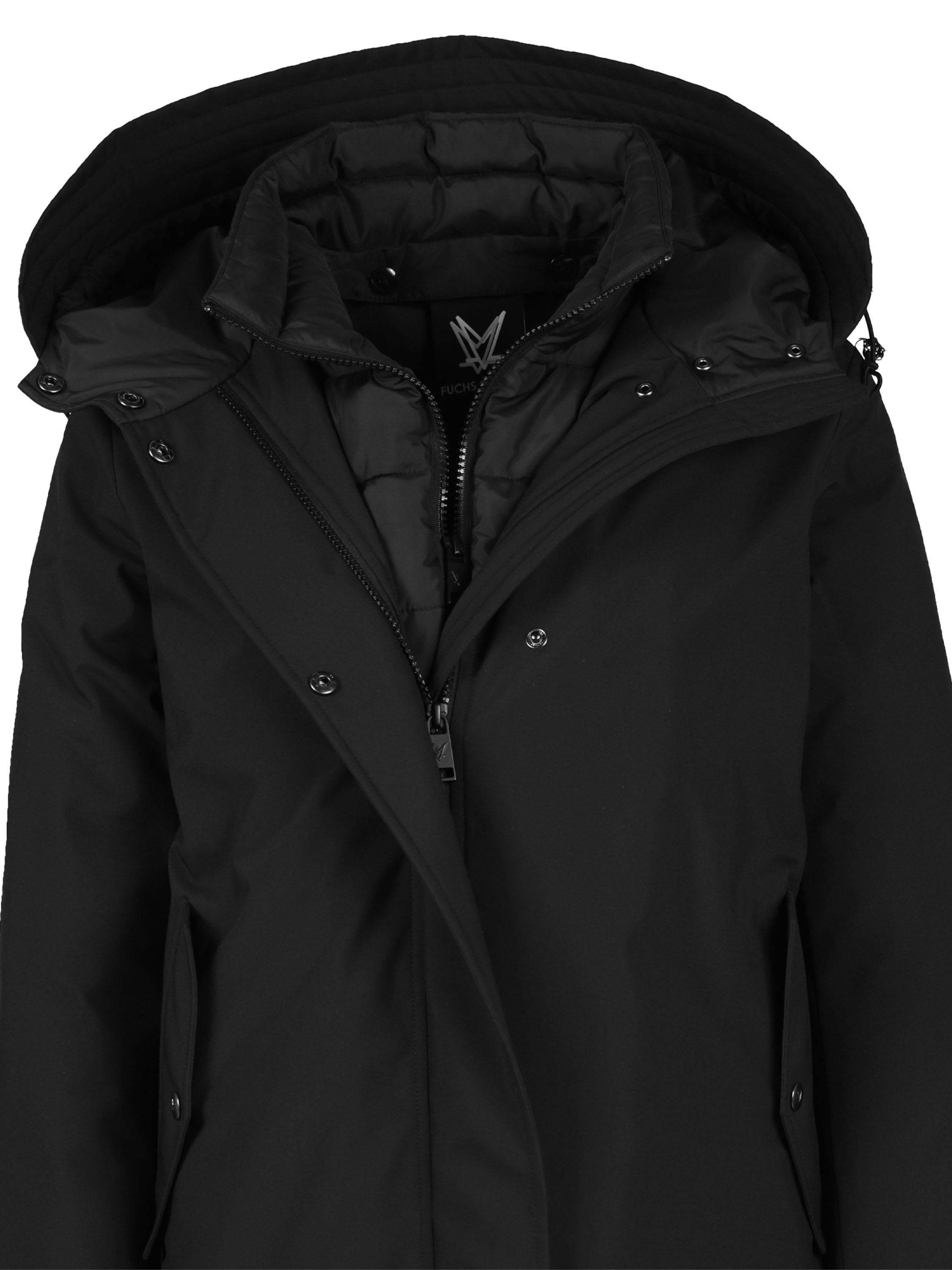 Een lange coat van Fuchs Schmitt in de kleur zwart. In de coat is een uitritsbare gestepte bodywarmer. In de rand van de capuchon is een koord waarmee deze kan worden aangetrokken. Over de ritssluiting is een tweede sluiting met drukknopen. De steekzakken hebben een omslag. Deze coat mag op 30 graden worden gewassen.