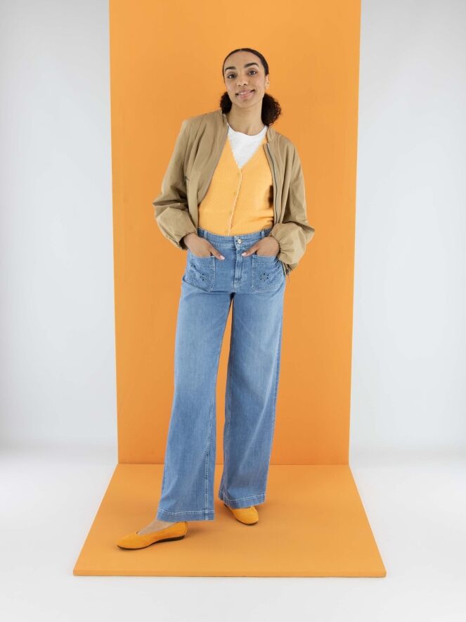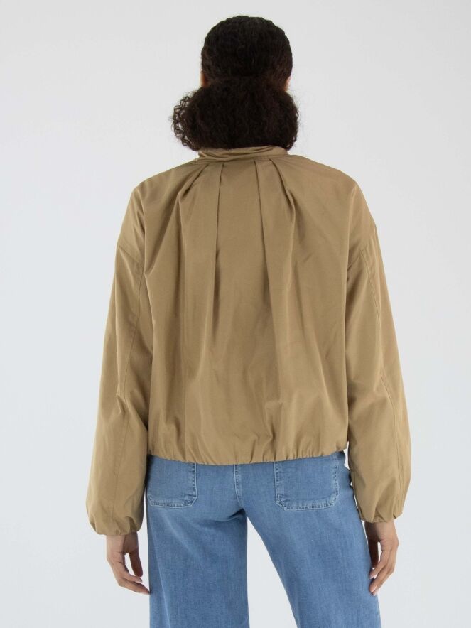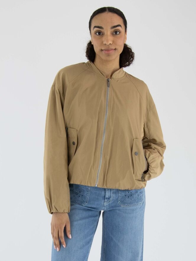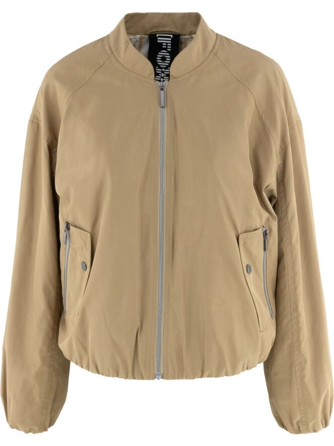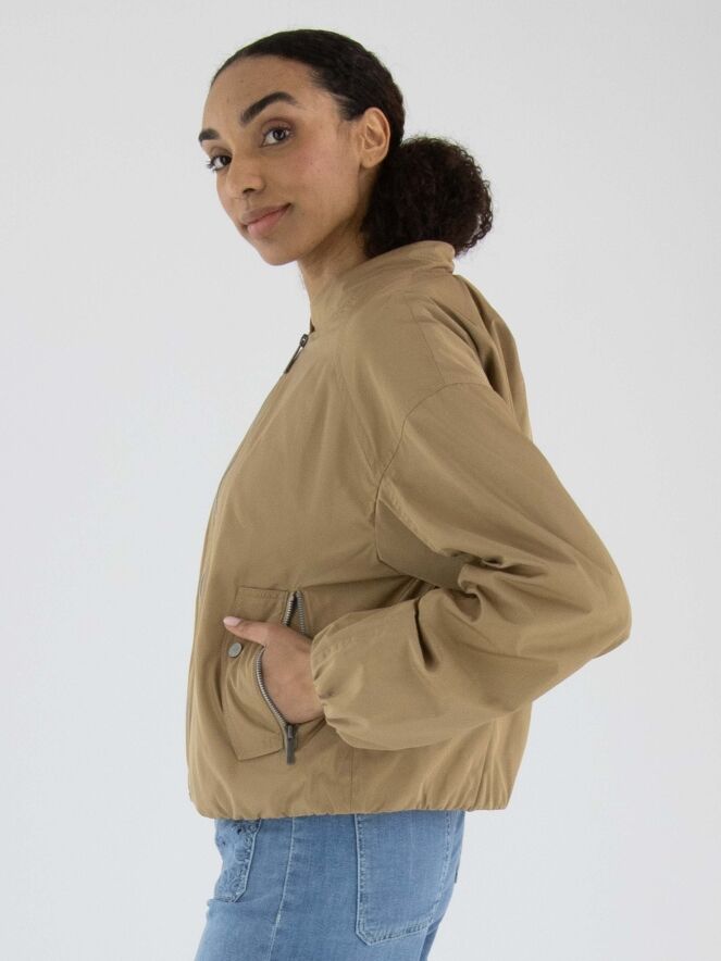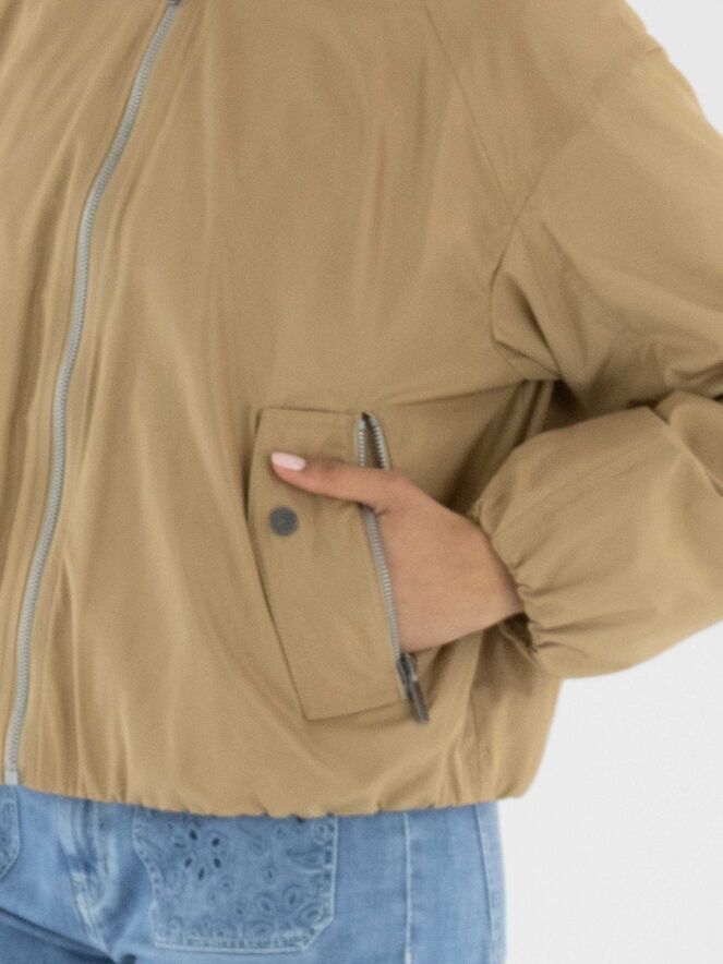 Een korte coat van Fuchs Schmitt in een camel kleur. De ritssluiting en de ritsen van de zakken zijn uitgevoerd in een lichtgrijze kleur. De zakken hebben een decoratieve omslag met een drukknoop. Aan de onderkant en de uiteinden van de lange mouwen bevindt zich een elastische boord. Deze coat kan op 30 graden worden gewassen.