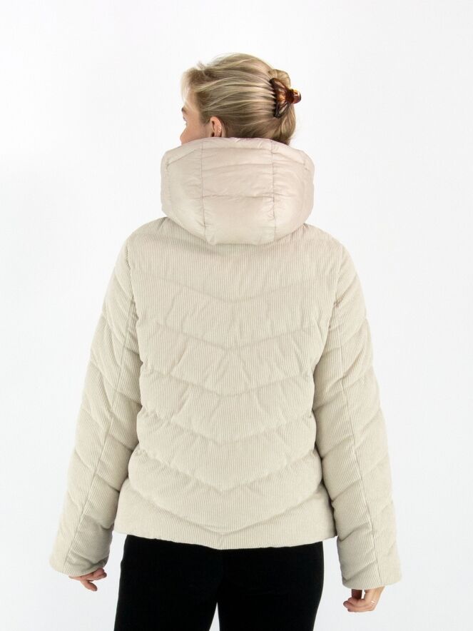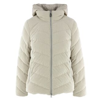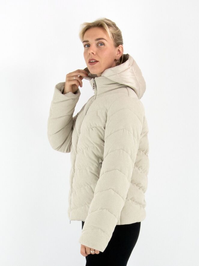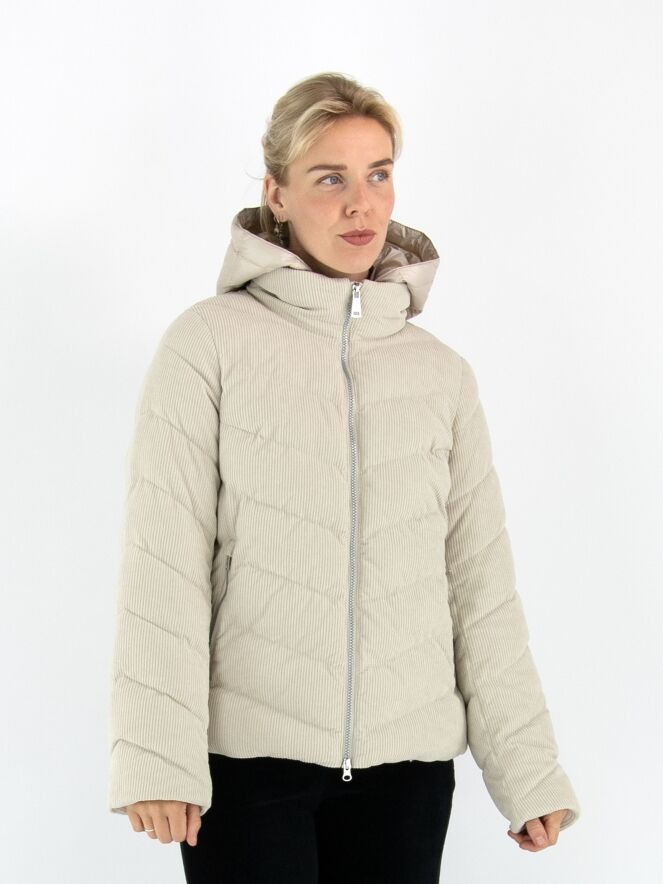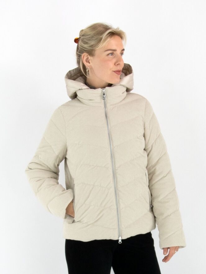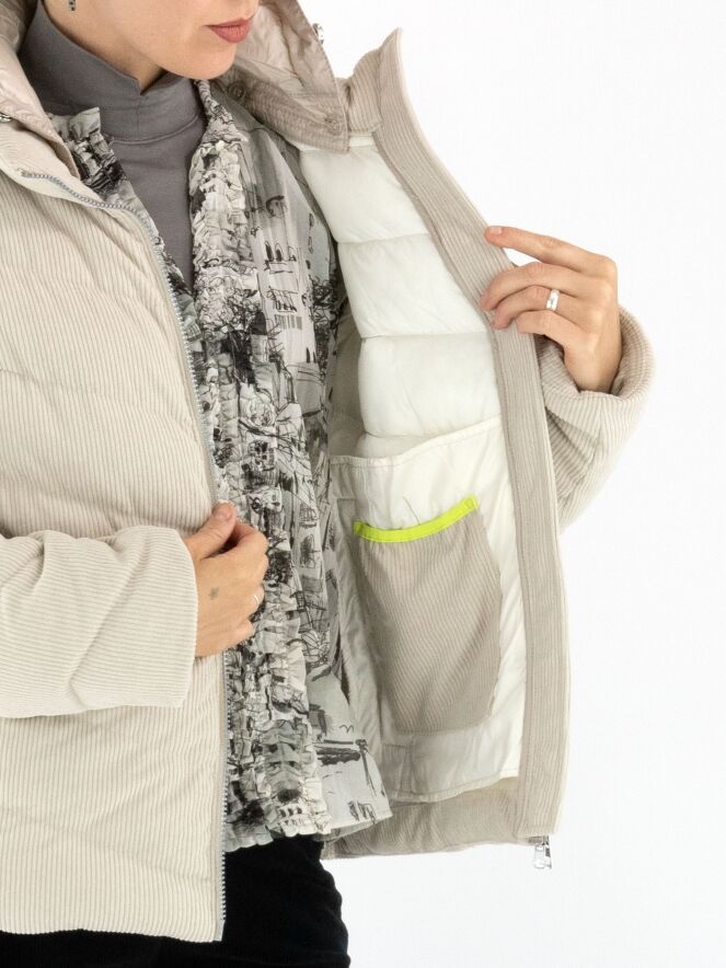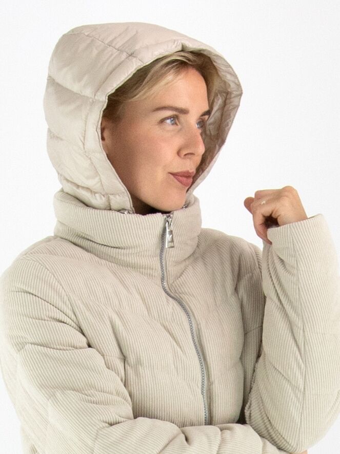 Een coat van Fuchs Schmitt in een ribcordkwaliteit in de kleur beige. De coat heeft een afneembare capuchon in parachutestof. De sluiting is met een rits en ook de zakken zijn voorzien van een ritssluiting. Deze coat mag op 30 graden worden gewassen.