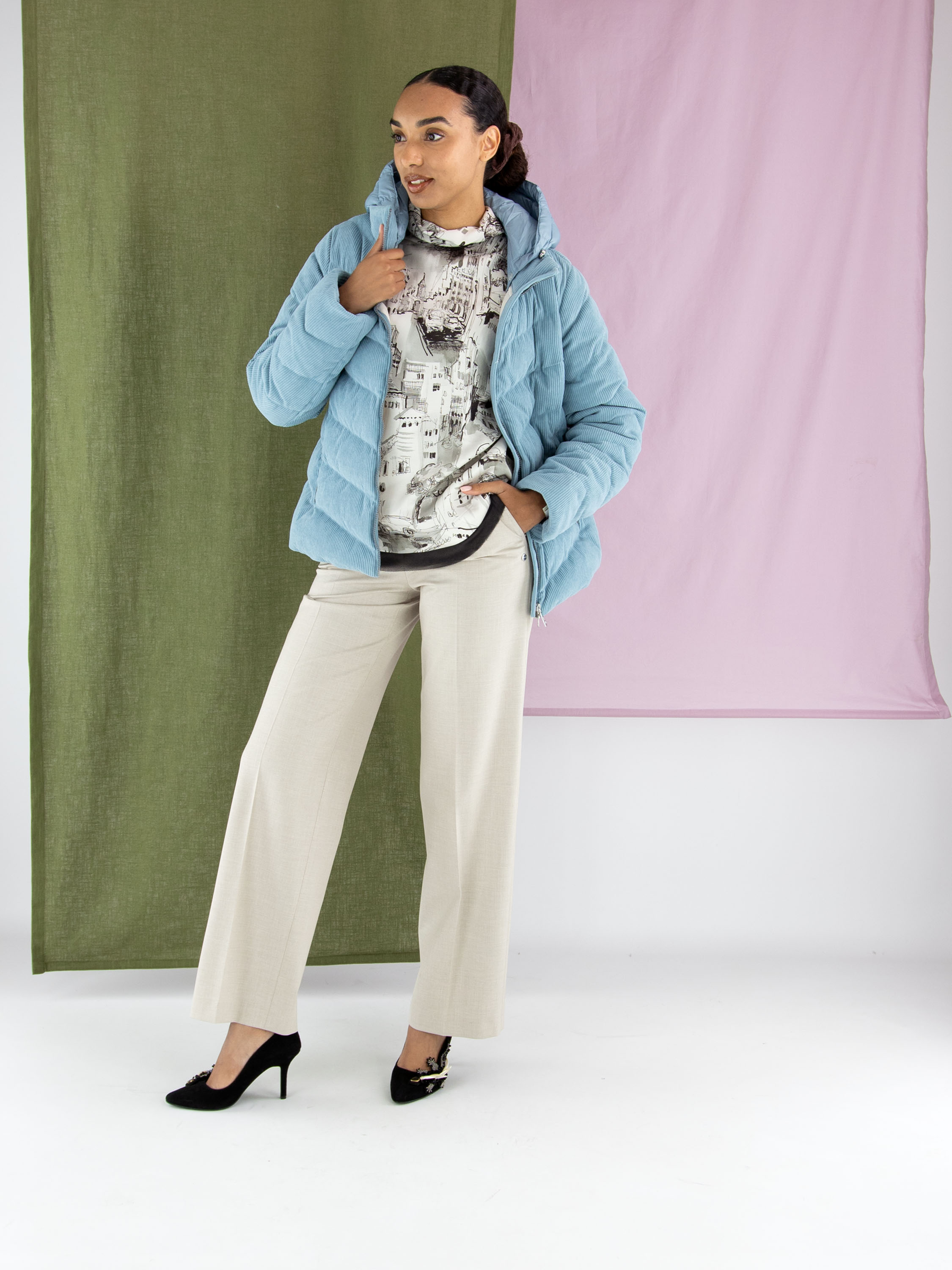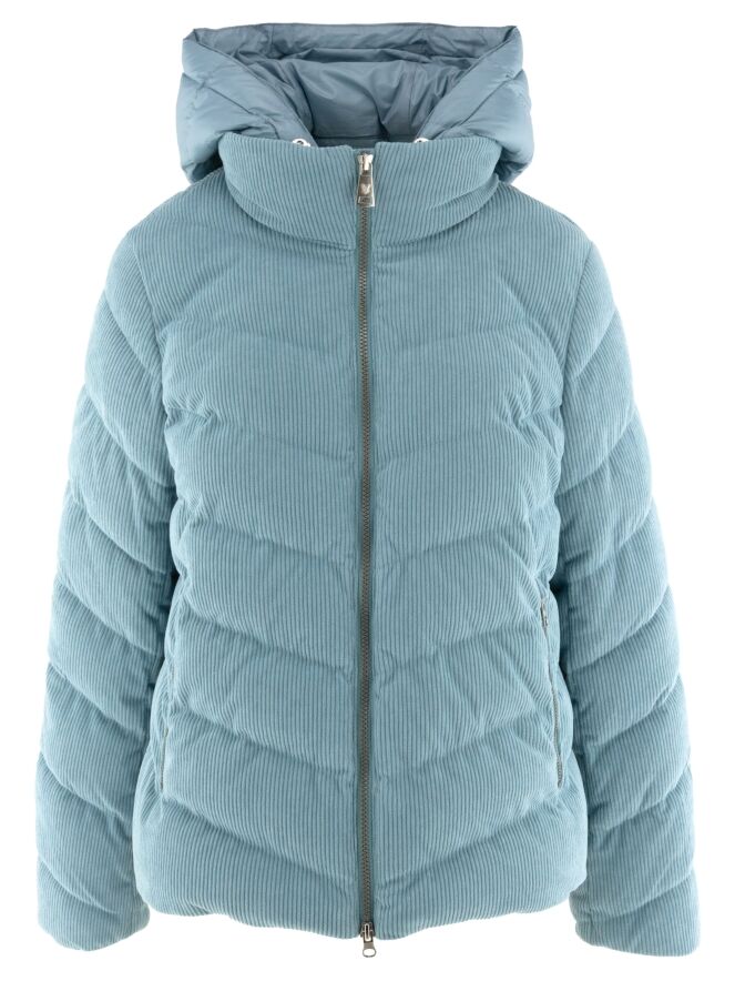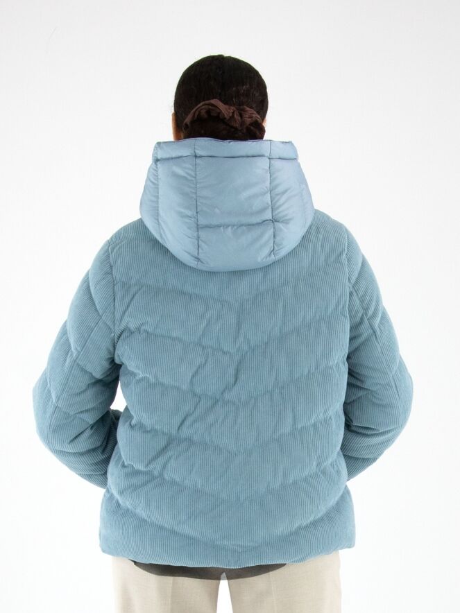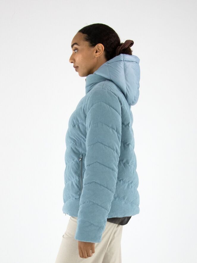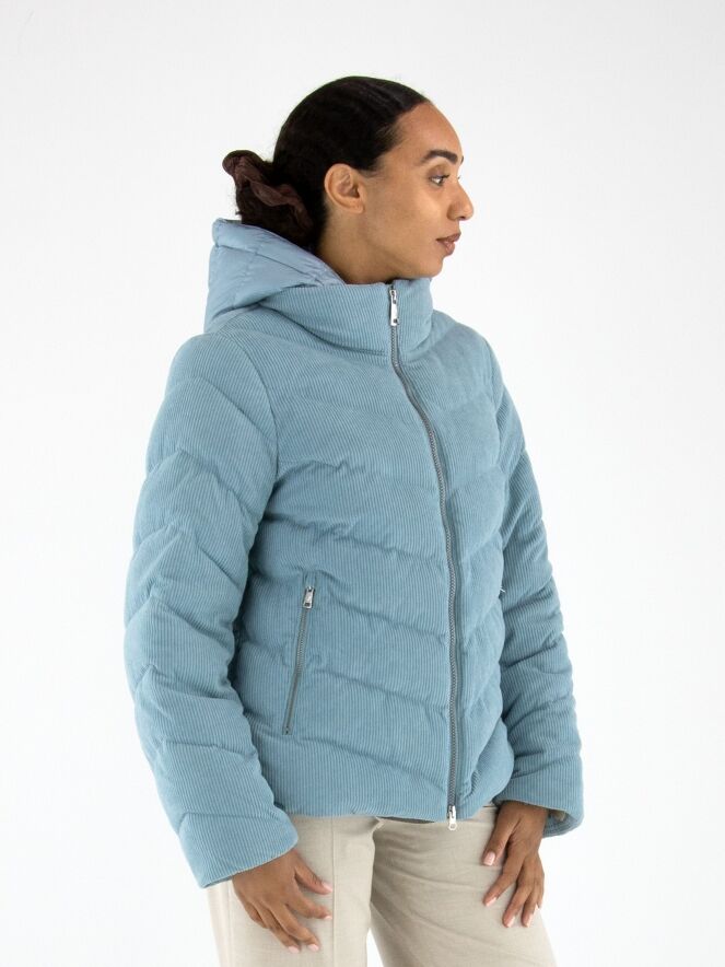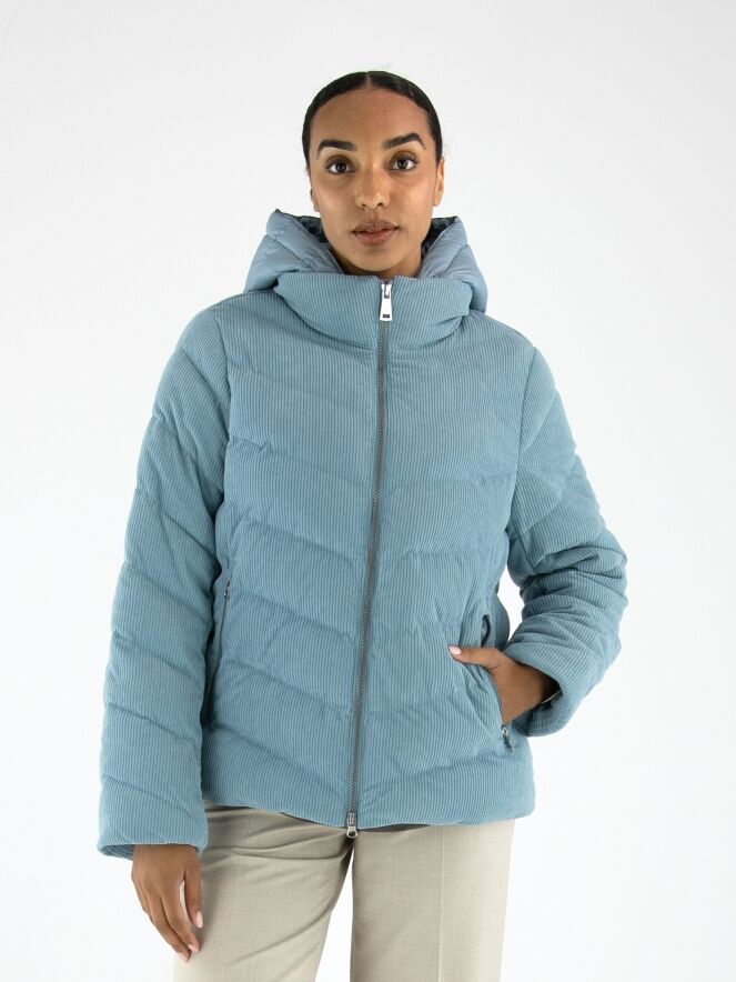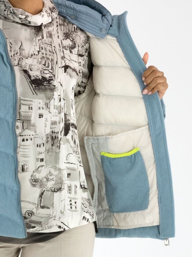 Een coat van Fuchs Schmitt in ribcordkwaliteit in de kleur blauw. De coat heeft een afneembare capuchon in parachutestof. De sluiting is met een rits en ook de zakken zijn voorzien van een ritssluiting. Deze coat mag op 30 graden worden gewassen.