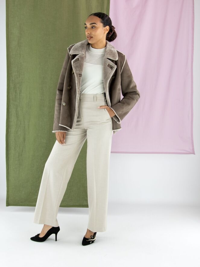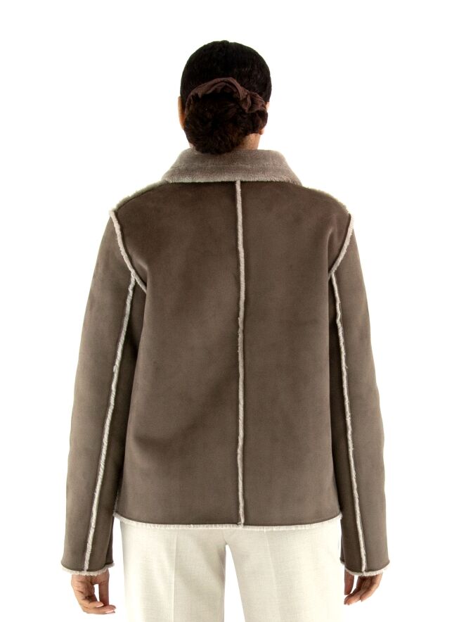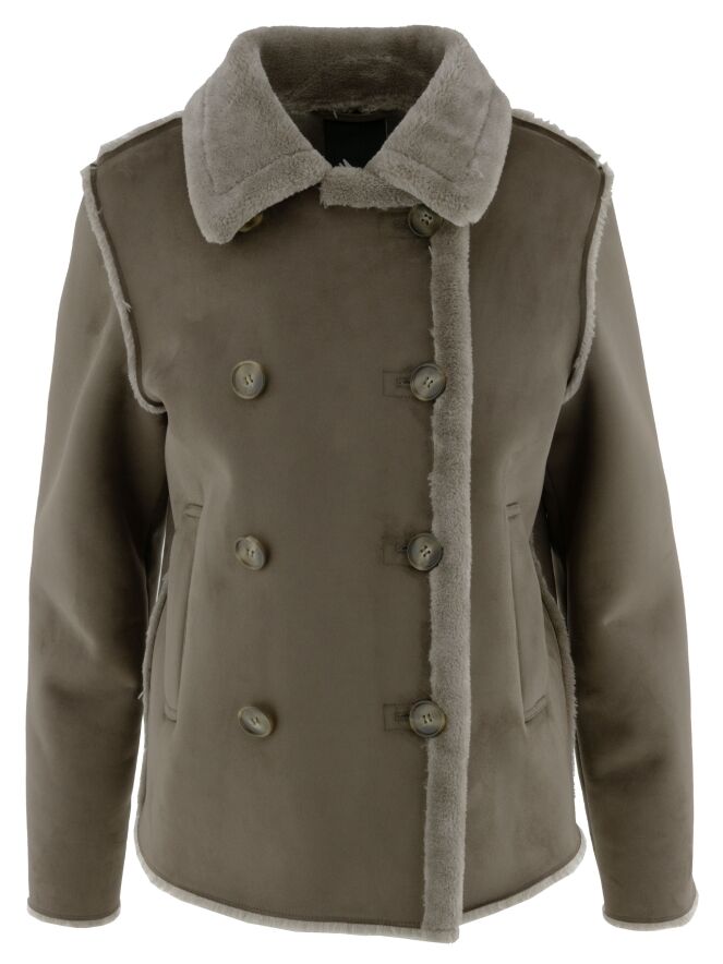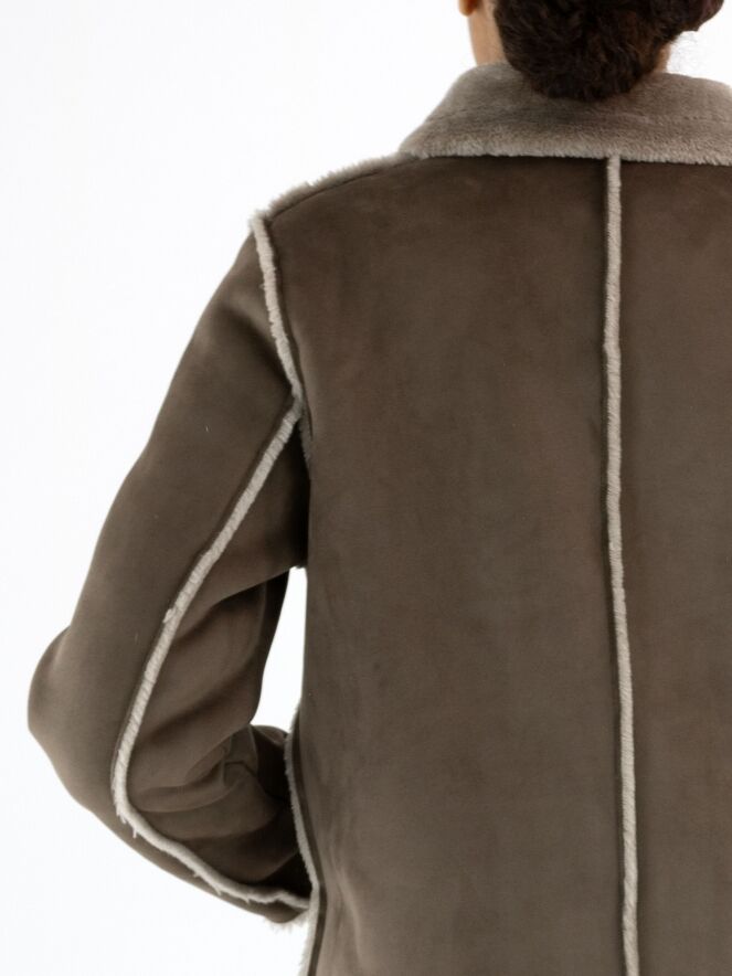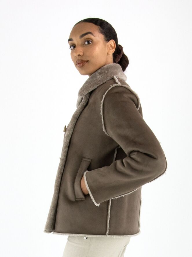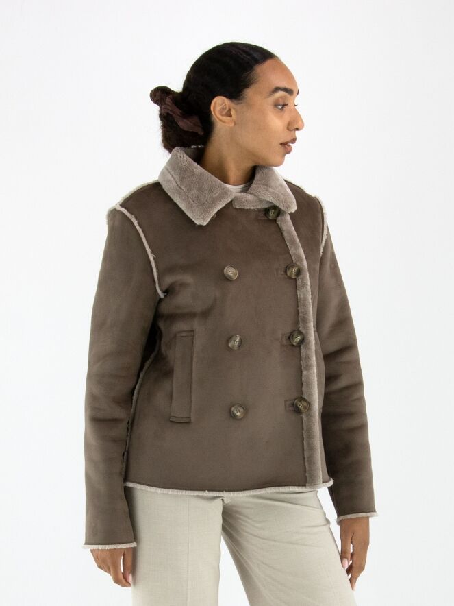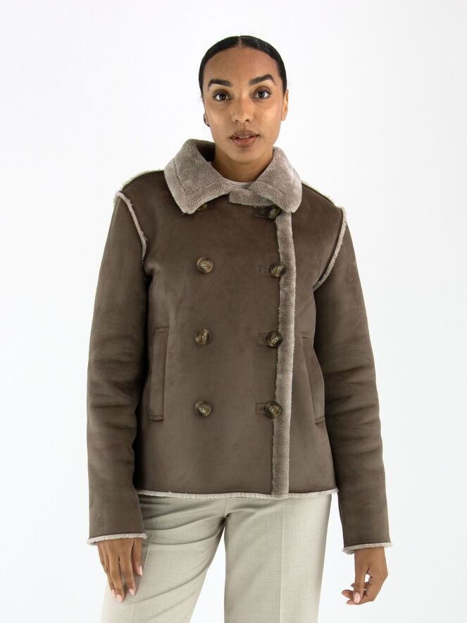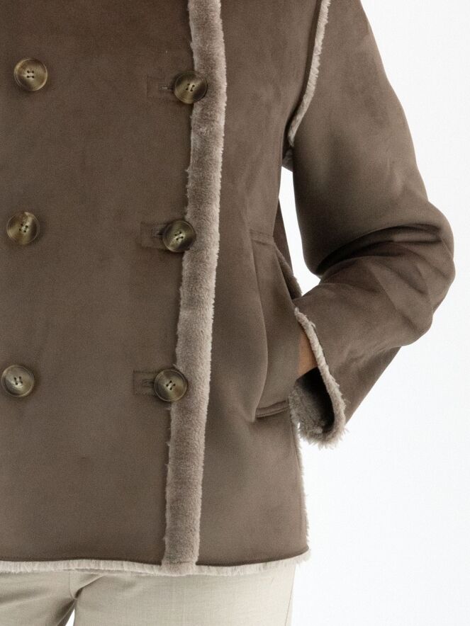 Een double breasted imitatie mouton van Fuchs Schmitt in een warme bruine kleur. De coat is ongevoerd en voorzien van steekzakken, wat zorgt voor een casual maar stijlvolle uitstraling. Deze mouton kan op 30 graden worden gewassen.