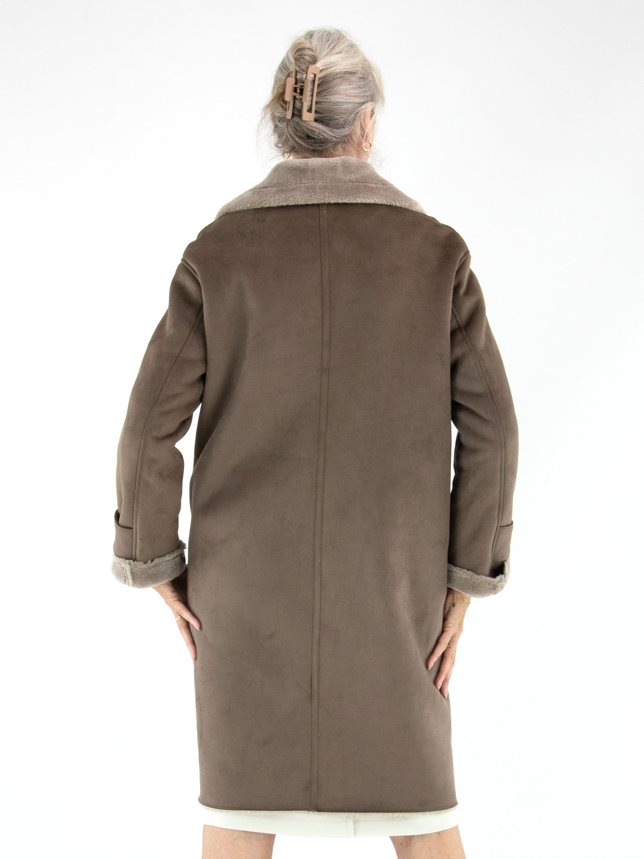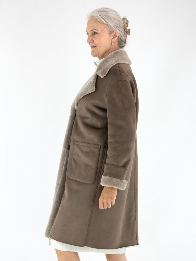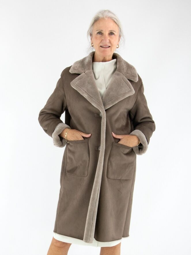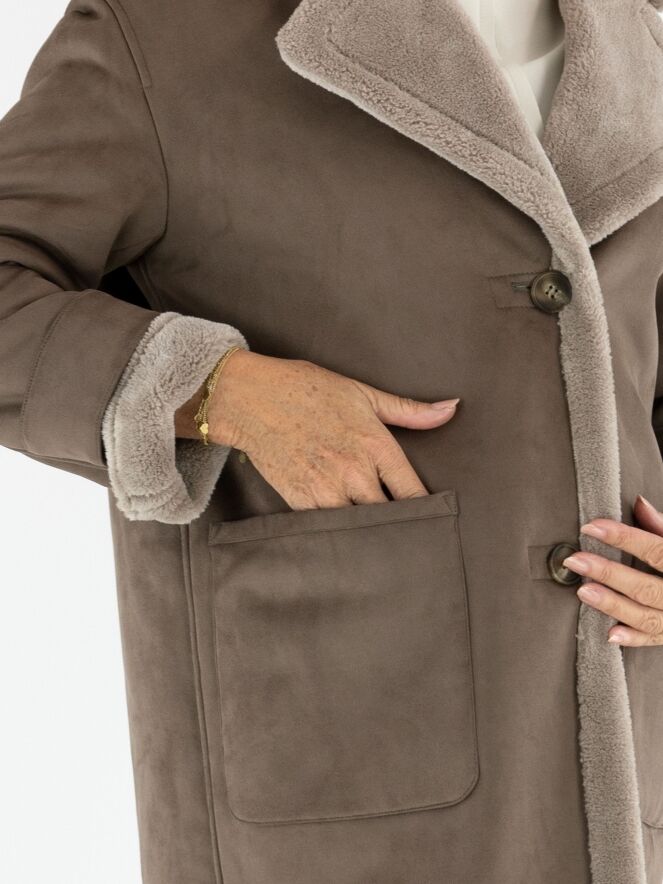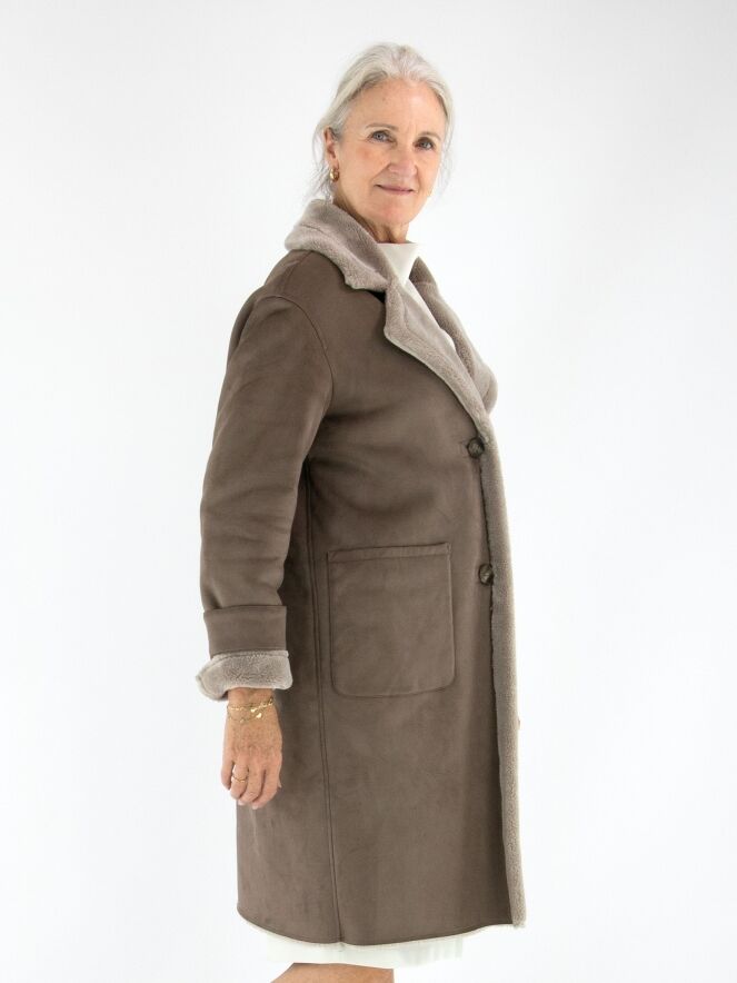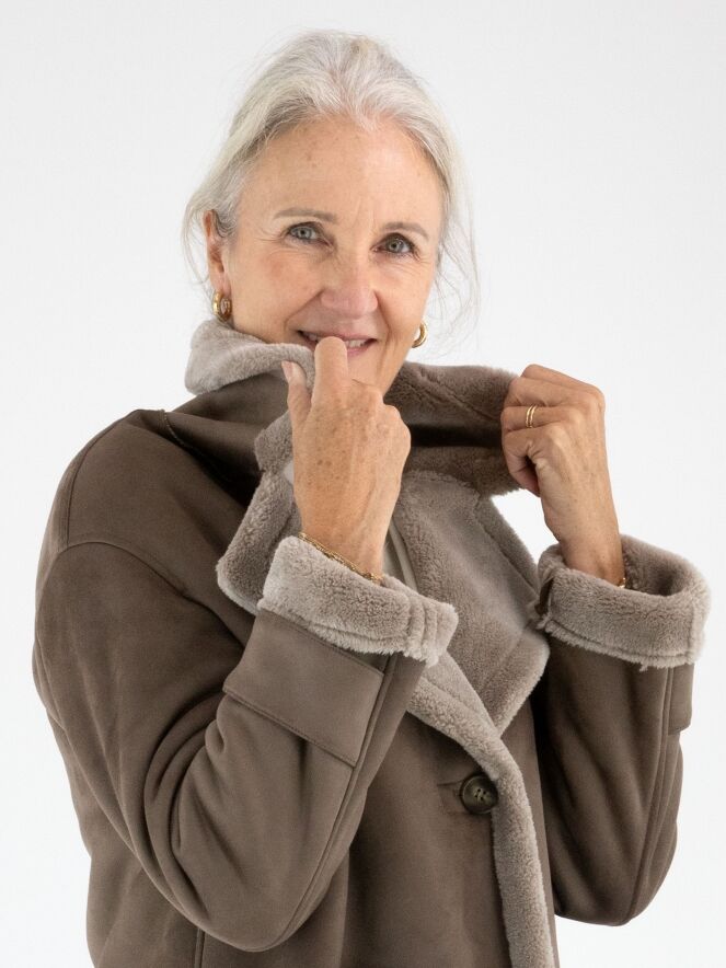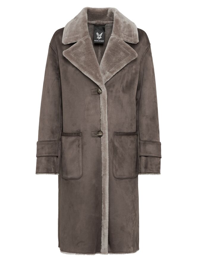 Een halflange imitatie-lammy van Fuchs Schmitt in een warme bruine kleur. De jas is ongevoerd en voorzien van steekzakken, wat zorgt voor een casual maar stijlvolle uitstraling. Deze mouton kan op 30 graden worden gewassen.