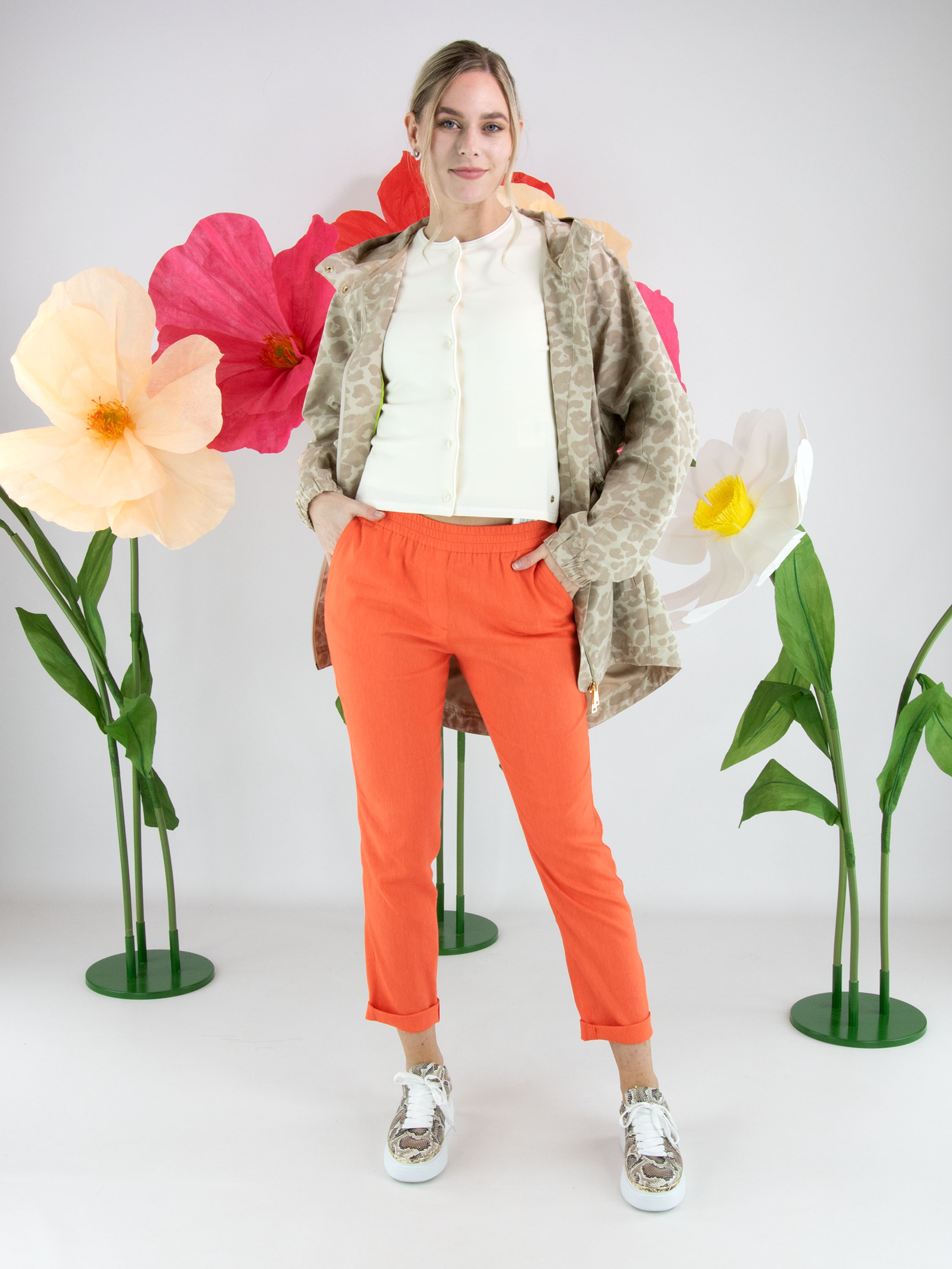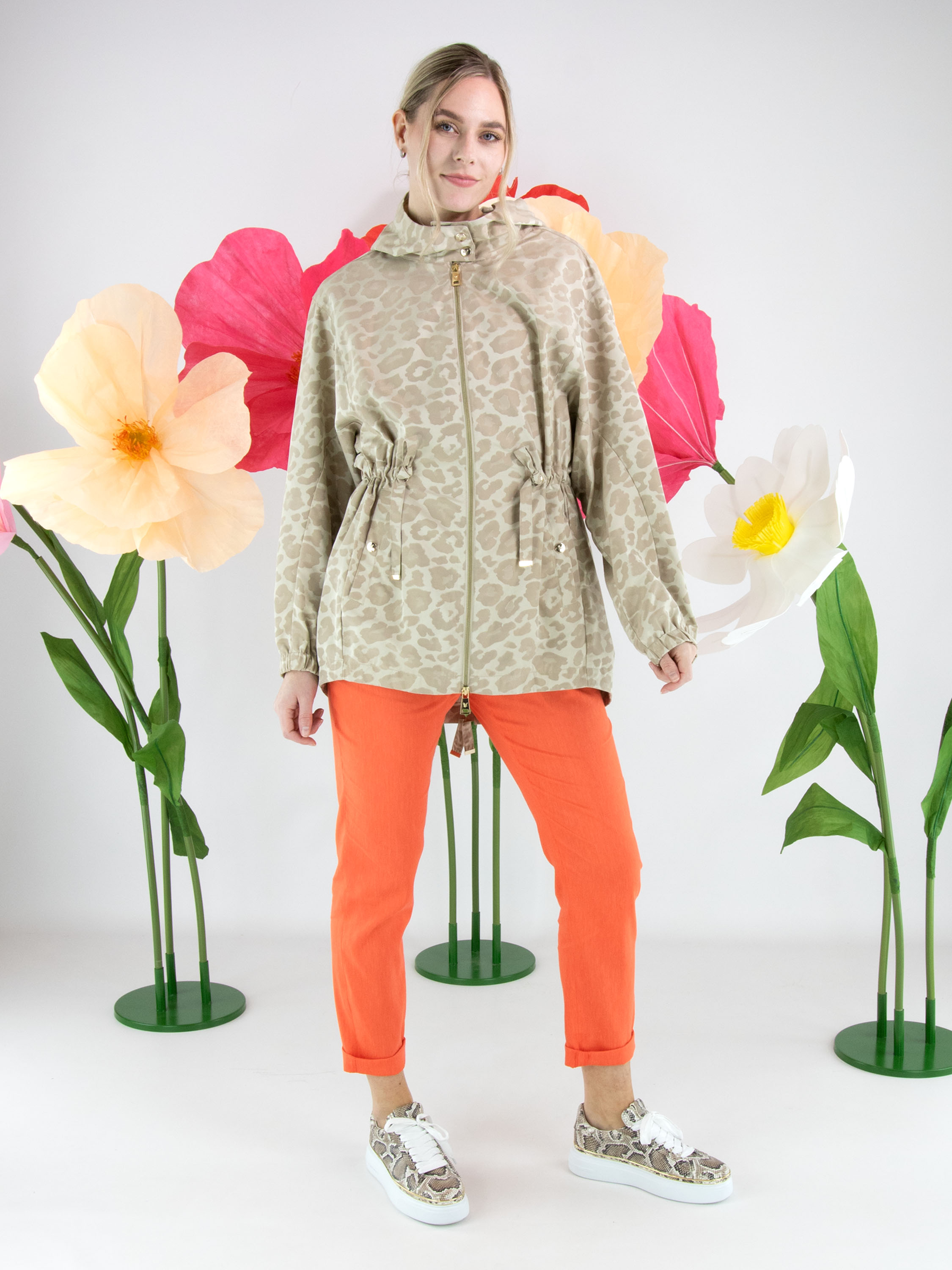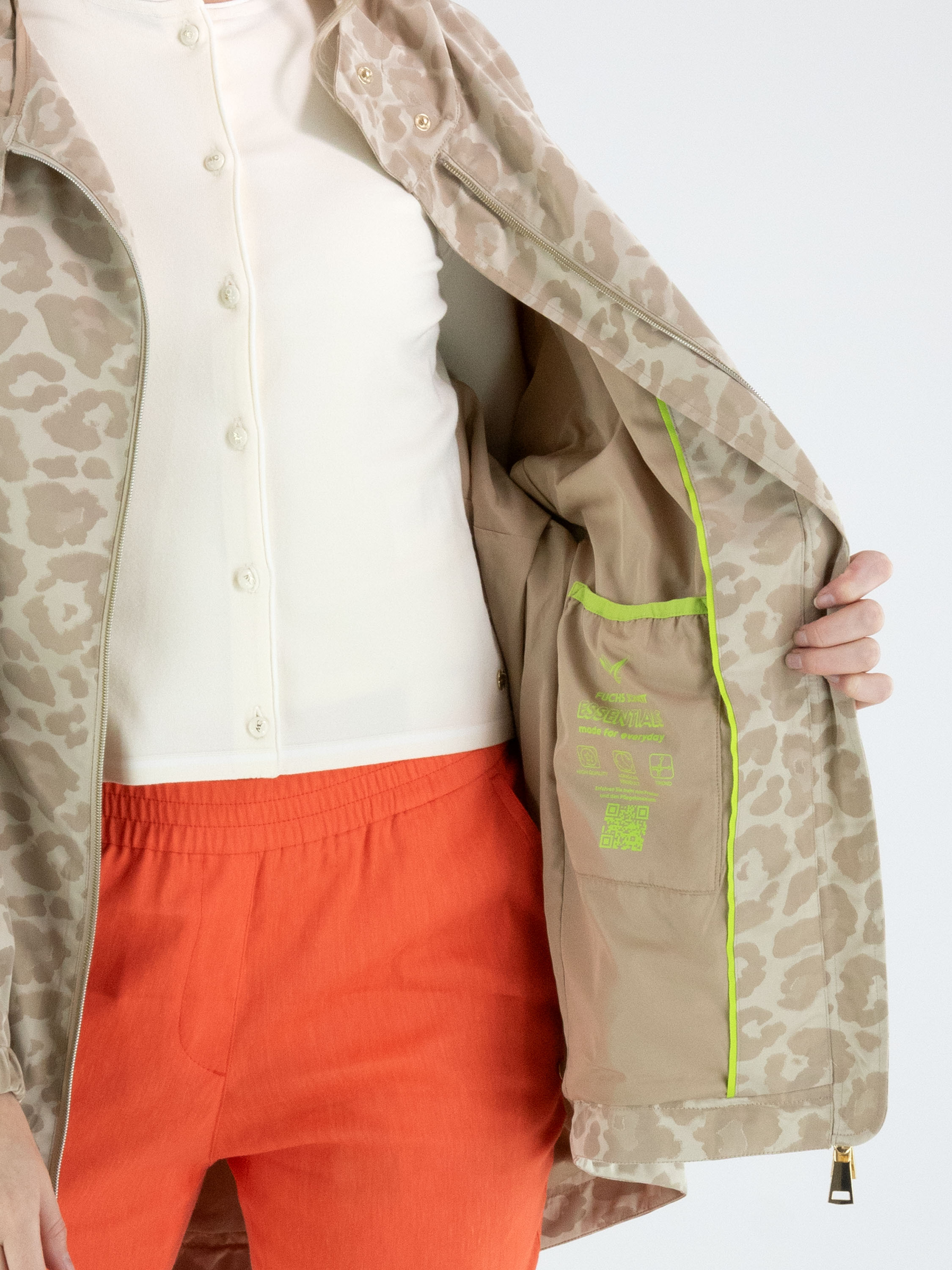 Parka van Fuchs Schmitt in een ton-sur-ton panterprint in meerdere tinten zand en beige. De parka is voorzien van een capuchon en een goudkleurige ritssluiting, wat zorgt voor een stijlvolle en eigentijdse uitstraling. Ter hoogte van de taille is een koord in tunnelverwerking aangebracht waarmee een subtiel plooieffect kan worden gecreëerd en de taille naar wens kan worden geaccentueerd. Onder dit koord bevinden zich steekzakken. De lange mouwen zijn afgewerkt met een elastische boord. Deze exclusieve parka coat kan op 30 graden worden gewassen.
