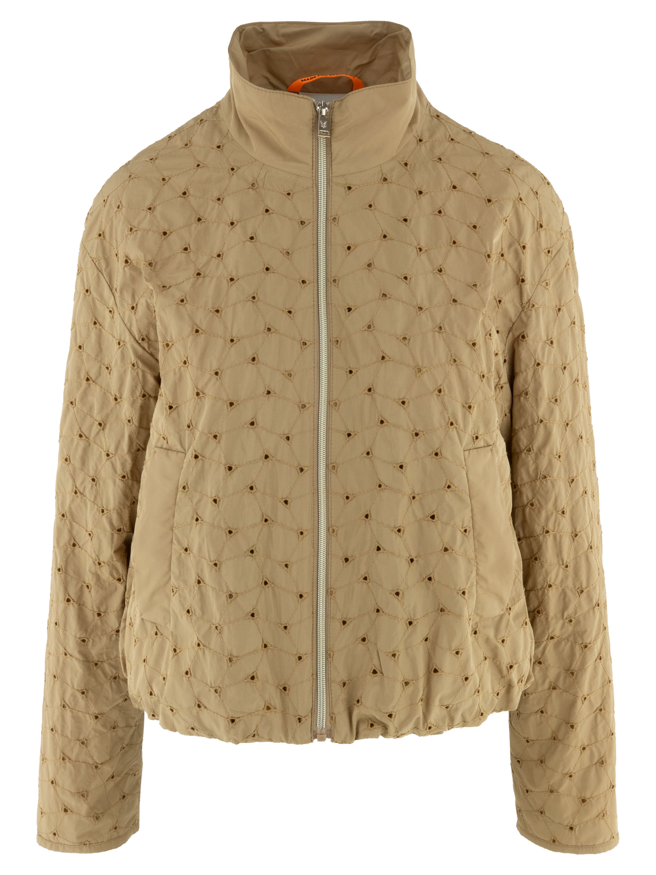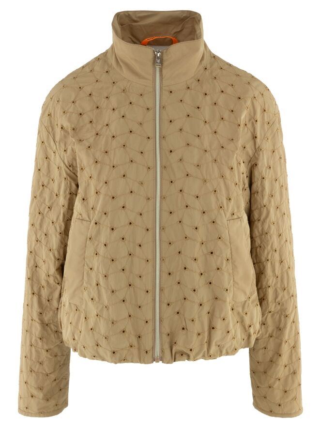 Zomercoat van Fuchs Schmitt in een warme cameltint. De stof is voorzien van decoratieve stiksels in een subtiel ruitpatroon en is geperforeerd op de kruispunten van de stiknaden, wat zorgt voor een luchtig en verfijnd effect. De coat heeft een zilverkleurige ritssluiting en praktische steekzakken. Deze exclusieve damescoat kan op 30 graden worden gewassen.