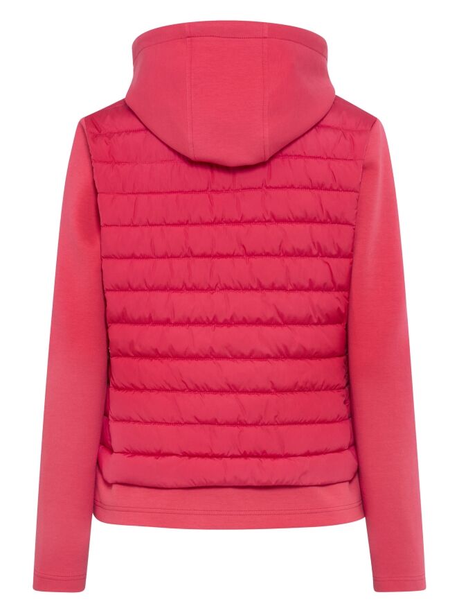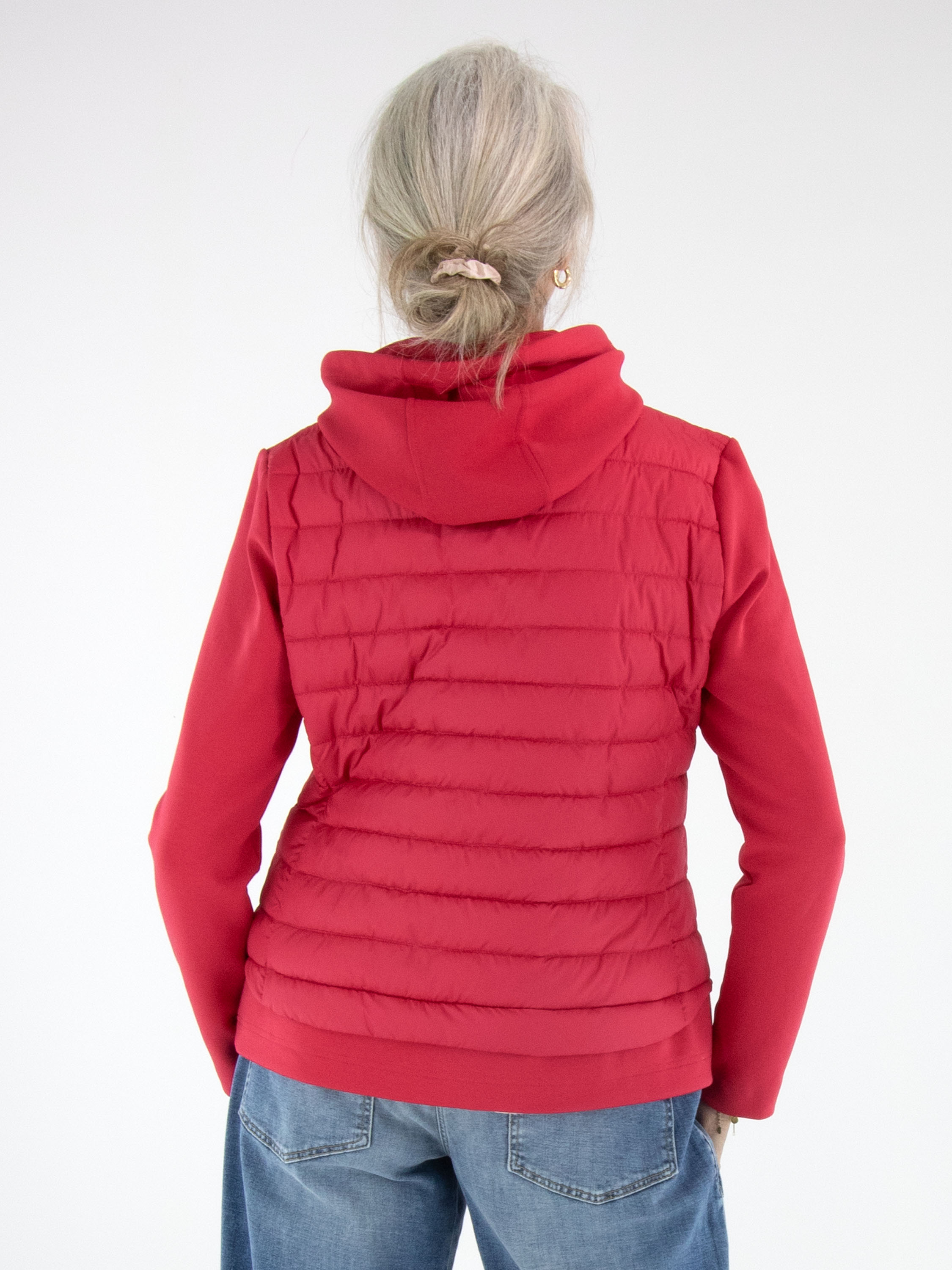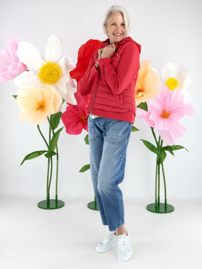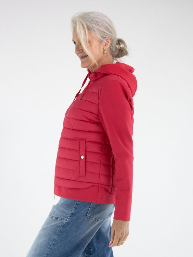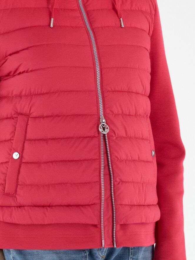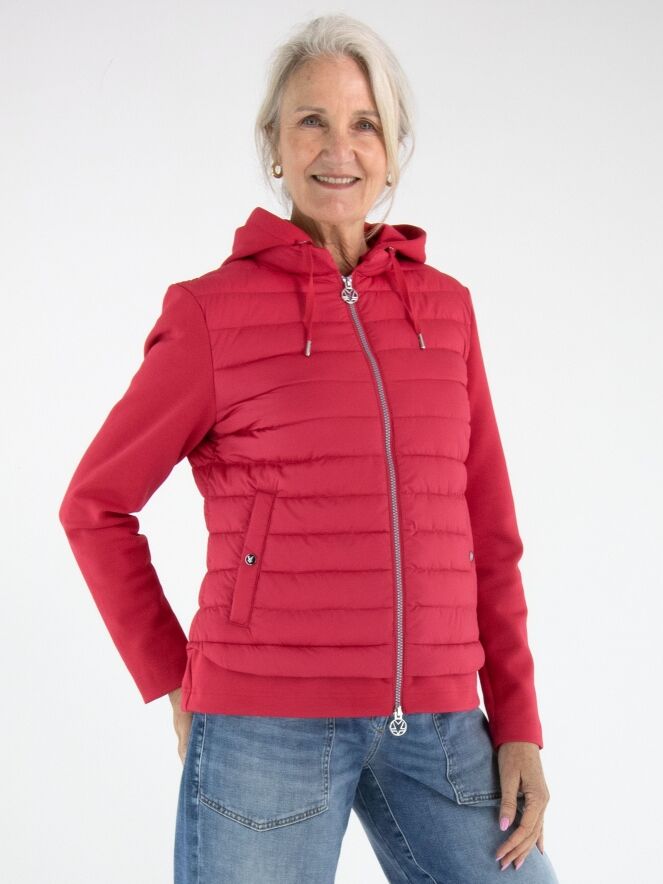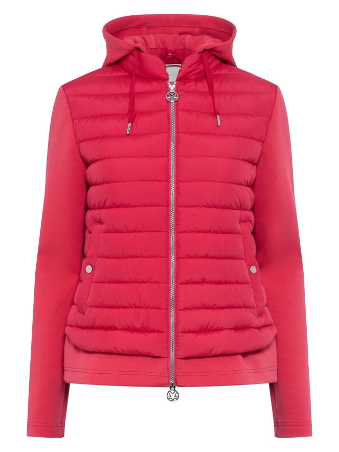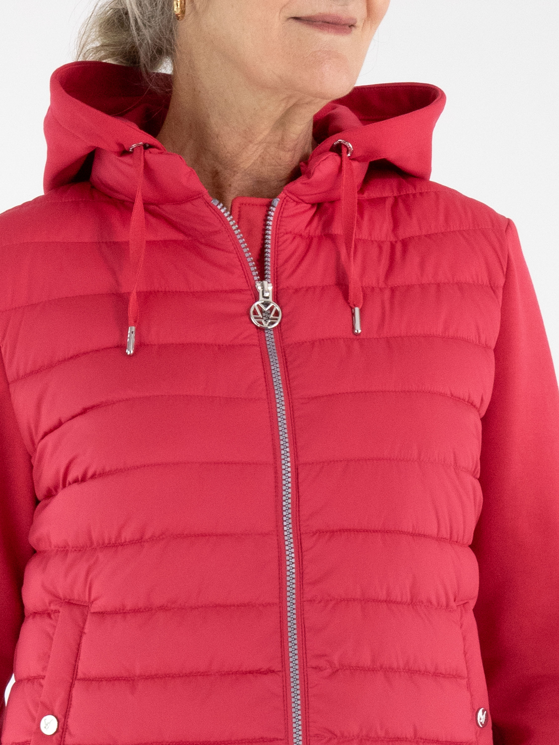 Gestepte coat van Fuchs Schmitt in een frisse rode tint. In de rand van de capuchon is een koord verwerkt dat naar wens kan worden aangetrokken voor extra bescherming en een persoonlijke pasvorm. De mouwen zijn uitgevoerd in een matte uni stof, wat zorgt voor een subtiel contrast met het gestepte gedeelte. Deze coat kan op 30 graden worden gewassen.