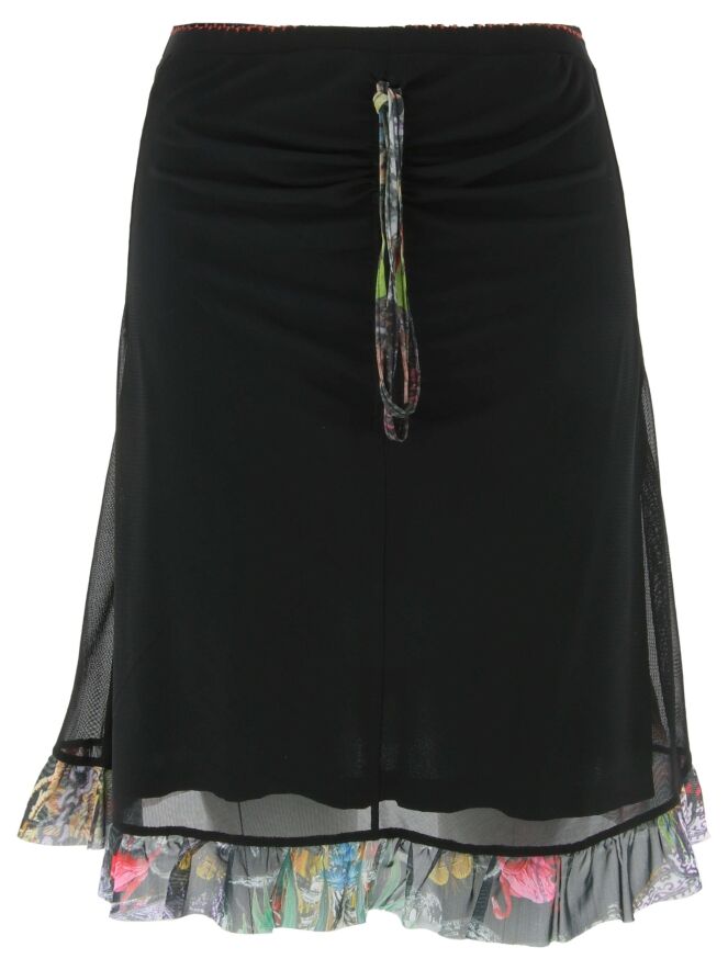 Een rok van Garella in de kleur zwart. In de taille is eemn elastieken band met een decoratieve rode stiknaad. De rok heeft een A - Lijn en aan de onderkant is een voile bies met een grafische multi color print. De rok is gevoerd en mag op 30 graden worden gewassen.
