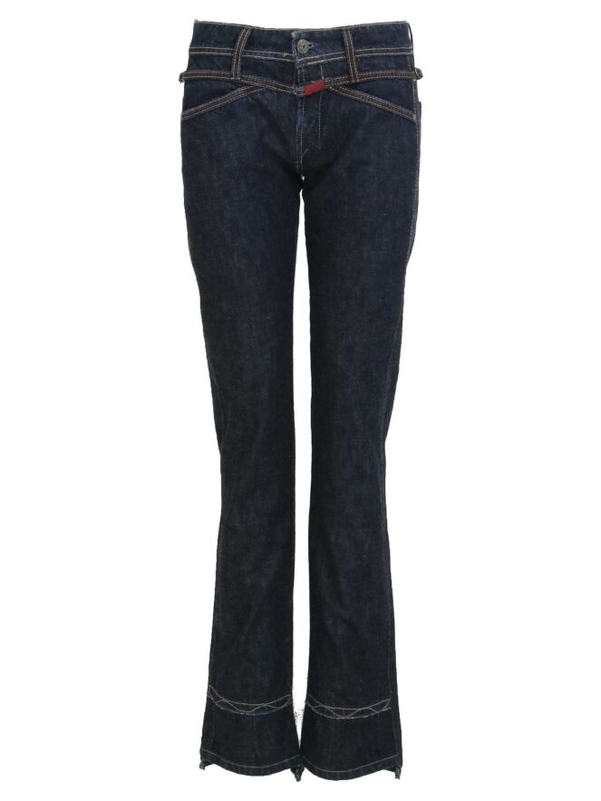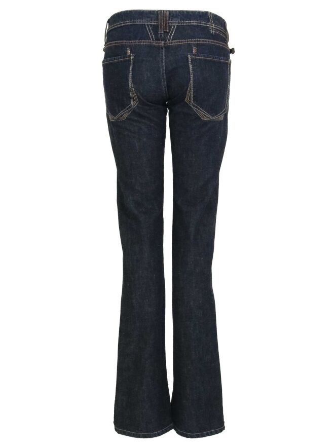Een jeans van Girbaud in een donkere jeans kleur. De jeans heeft steekzakken. Aan de onderkant van de pijpen is een stiknaad. De achtzijde van de ondrkant is iets langer als de voorzijde. deze jeans mag op 30 graden worden gewassen.