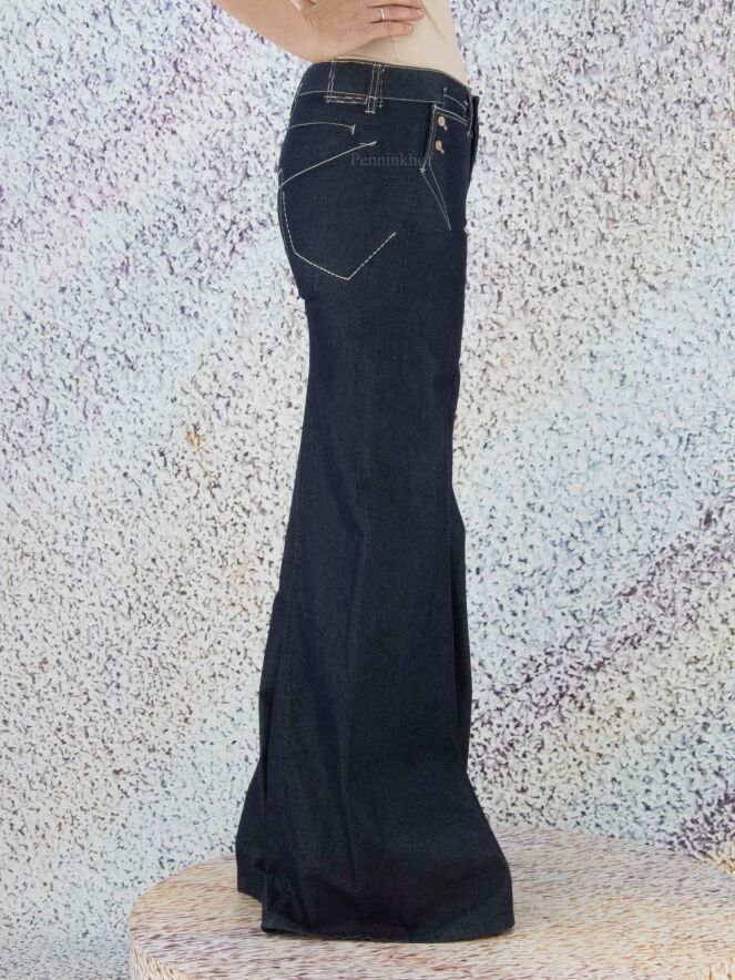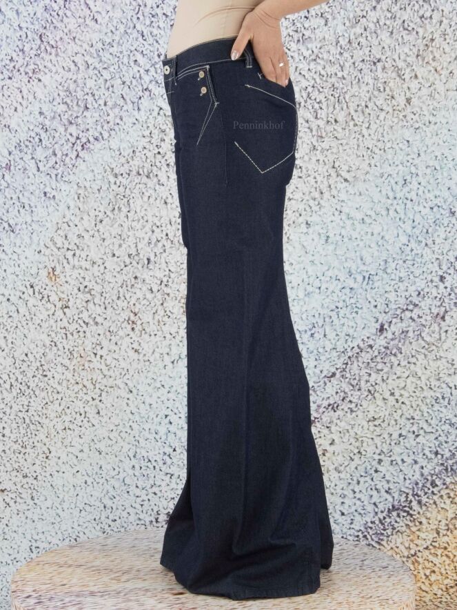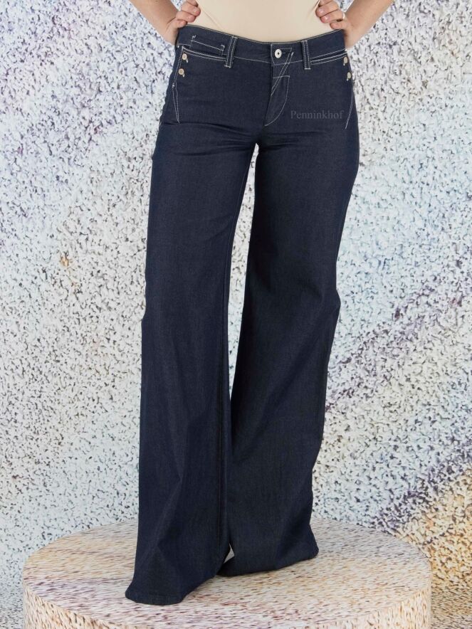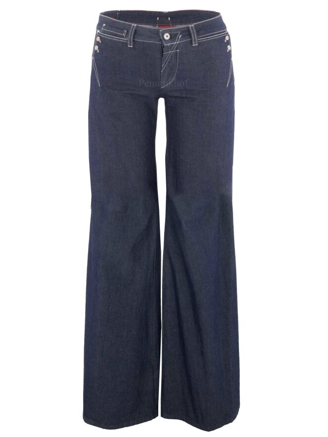 Een jeans van Girbaud in de kleur jeansblauw. De jeans is in een wijde flare model. Aan de achterkant hebben de diagonale zakken grove stiksels in een touw kleur. Deze jeans mag op 30 graden worden gewassen.