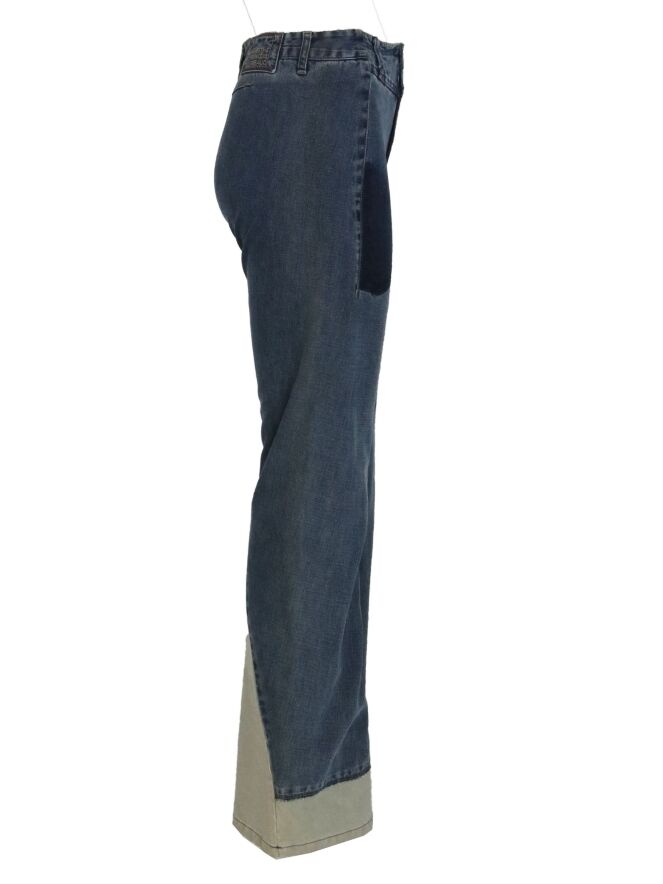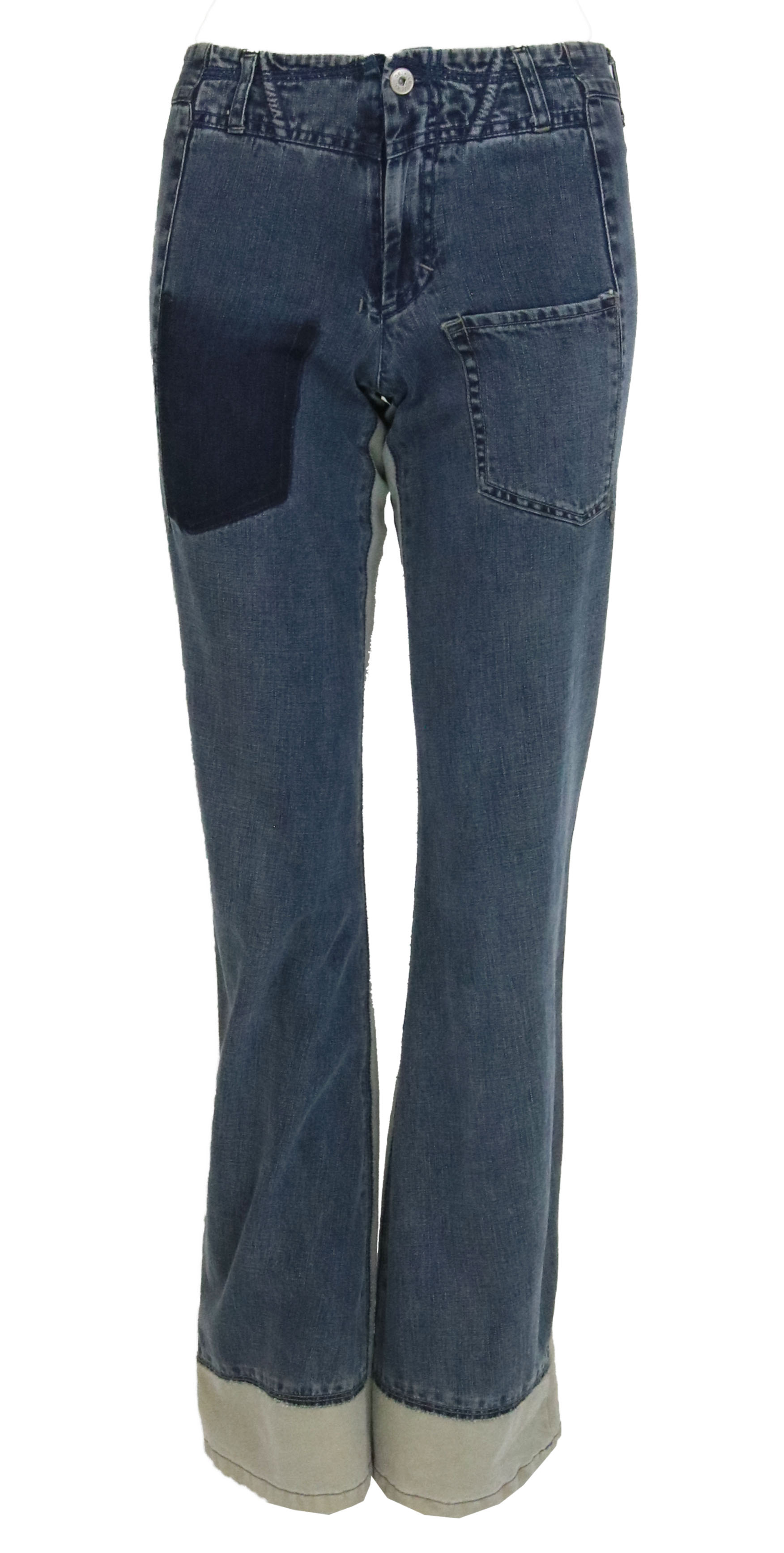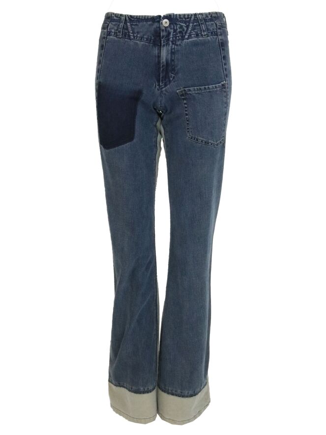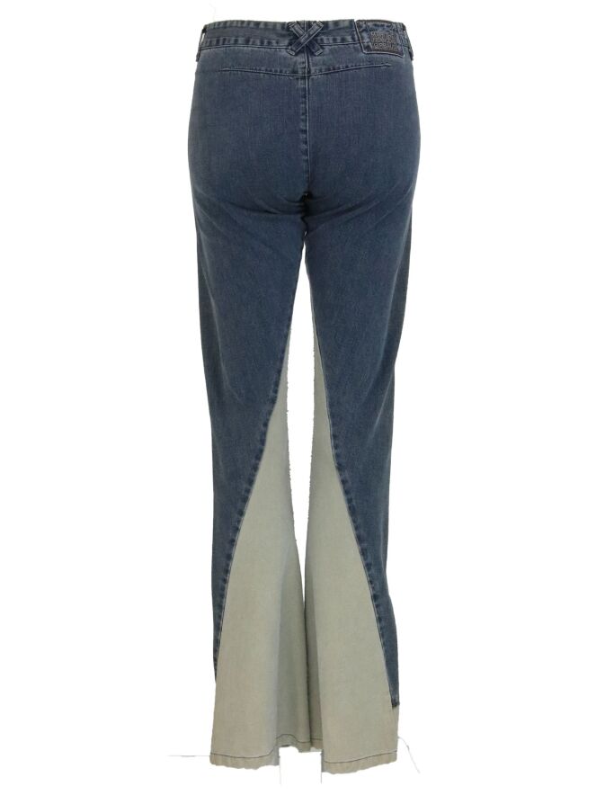 Een flared jeans van Girbaud in een vale jenas kleur. Aan de achterzijde en aan de onderkant van de pijpen zijn grijze delen jeans. Op de rechter kant van de pijpen is een geprinte zak en aan de linker zijde een korte steekzak. Deze jeans mag op 30 graden worden gewassen.