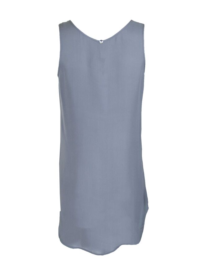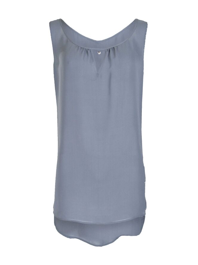 Een top van het merk High in een poeder grijs. De top is transparant en heeft een diep uitgesneden ronde hals welke in het midden enkele plooien heeft. Deze top mag op de hand worden gewassen.