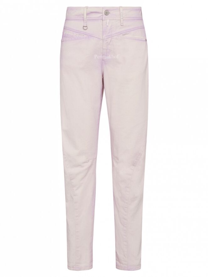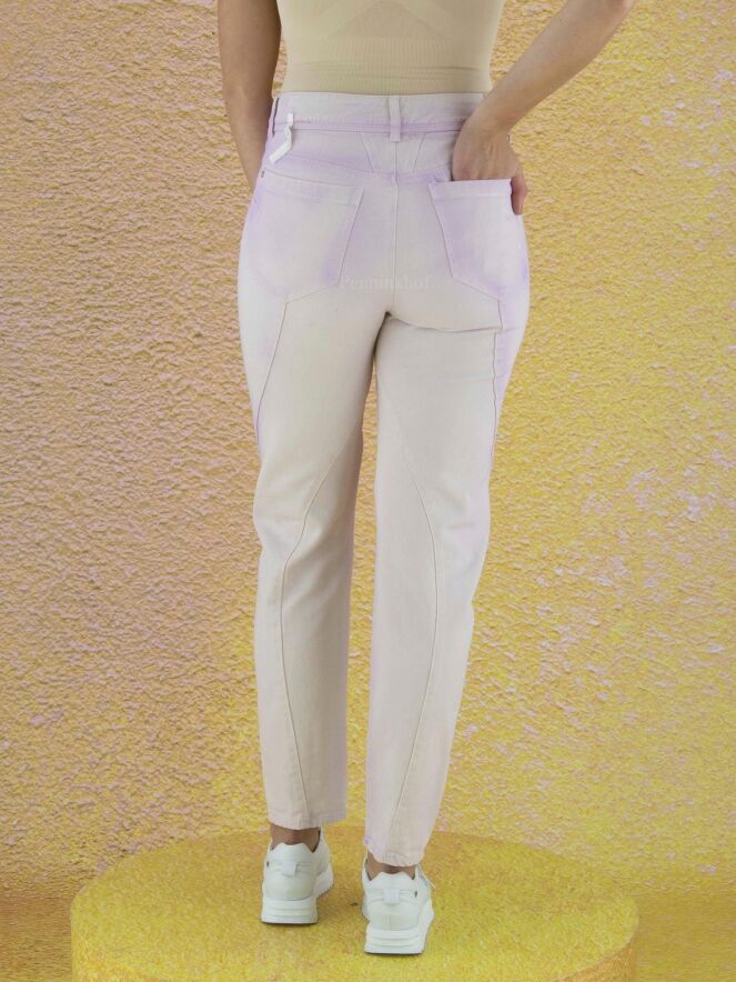 Een gewassen jeans van High in meerdere tinten roze met roomwit. De jeans is in een 5 pocket model en mag op 30 graden worden gewassen.