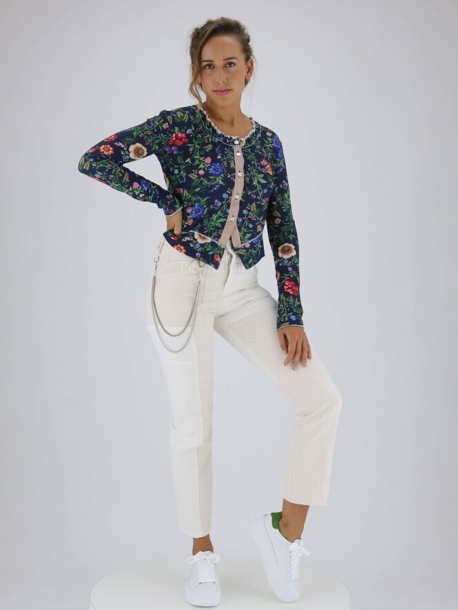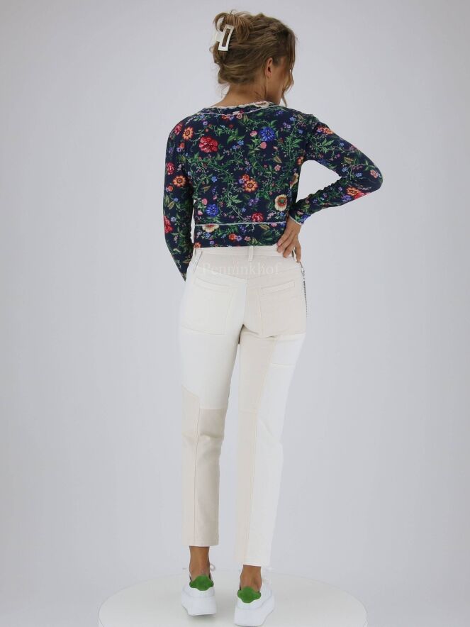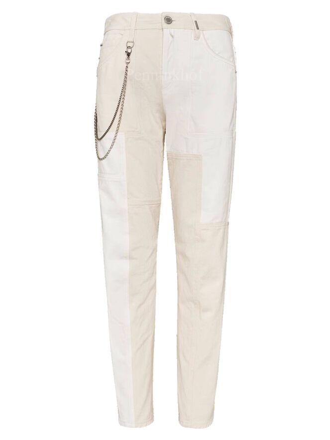 Een jeans van High in een beige kleur. Vanuit de taille is aan de rechterkant een dubbele zilver kleurige ketting die naar de achterkant loopt. Op de pijpen zijn meerdere decoratieve verticale en horizontale stiknaden. Deze jeans mag op 30 graden worden gewassen.