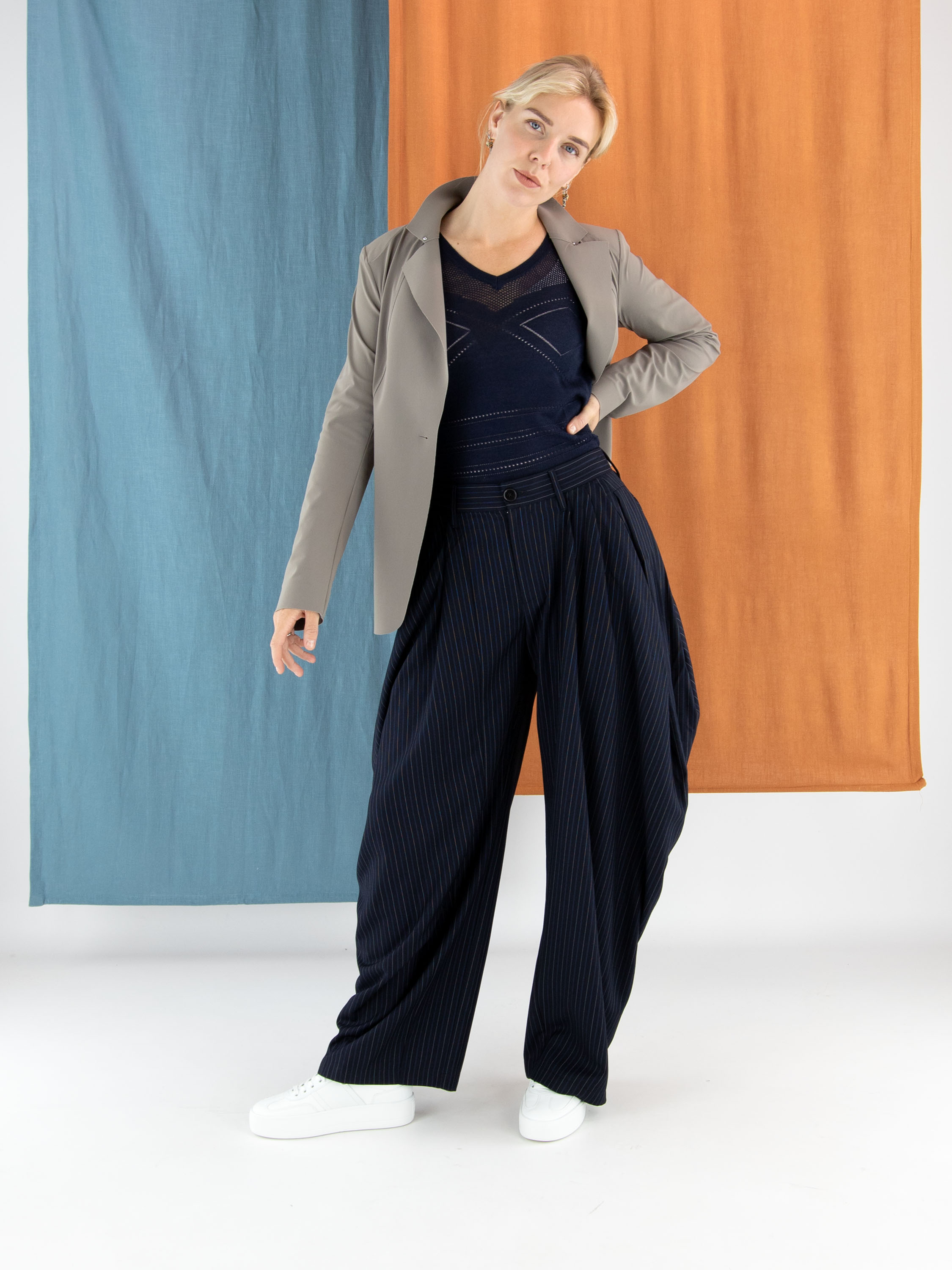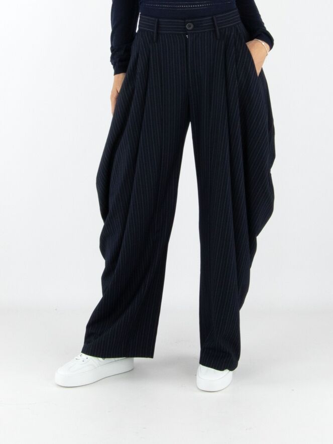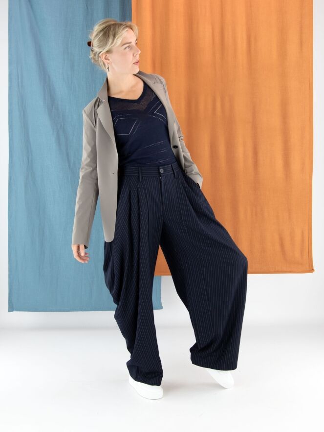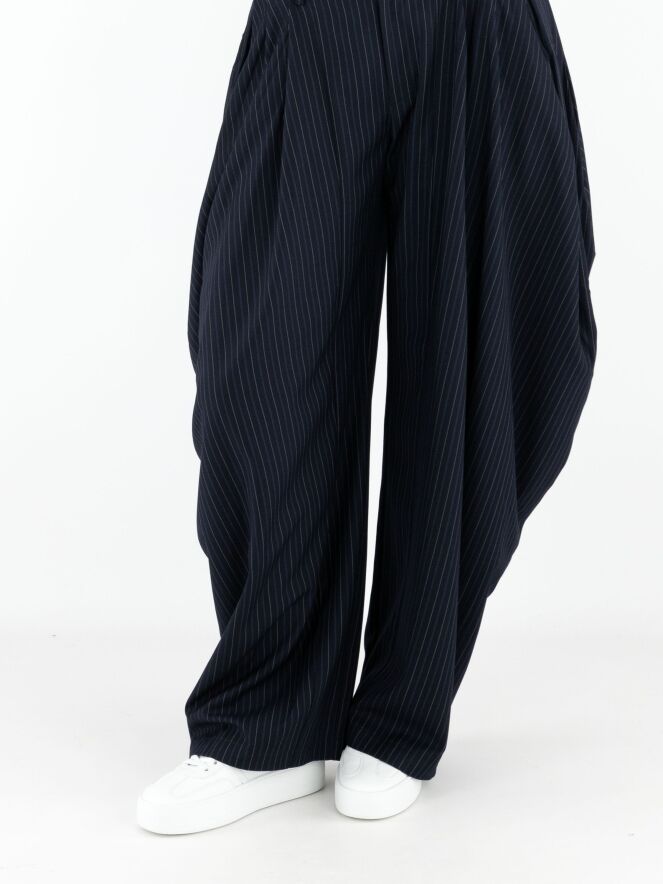 Een broek van High in een paardrij-inspiratie, uitgevoerd in een marineblauwe krijtstreep met blauwe en roomwitte strepen. Vanuit de taille lopen meerdere bandplooien, waarbij de extra brede plooien aan de zijkanten het ballon-effect versterken. De broek is voorzien van steekzakken en mag met de hand worden gewassen.