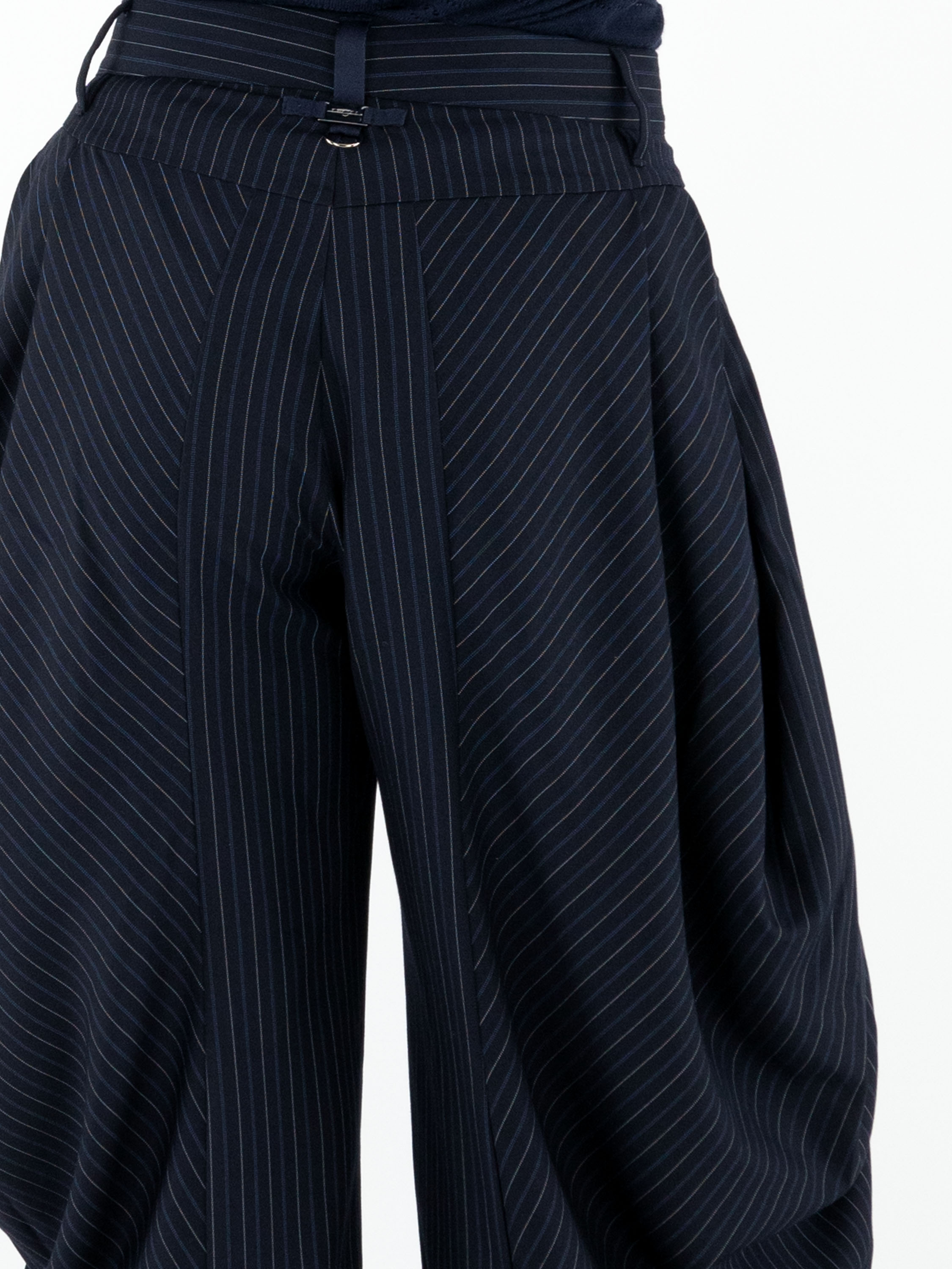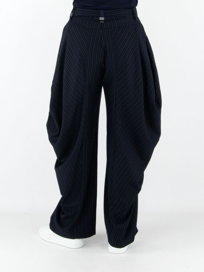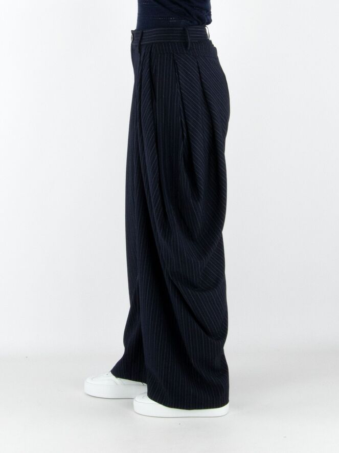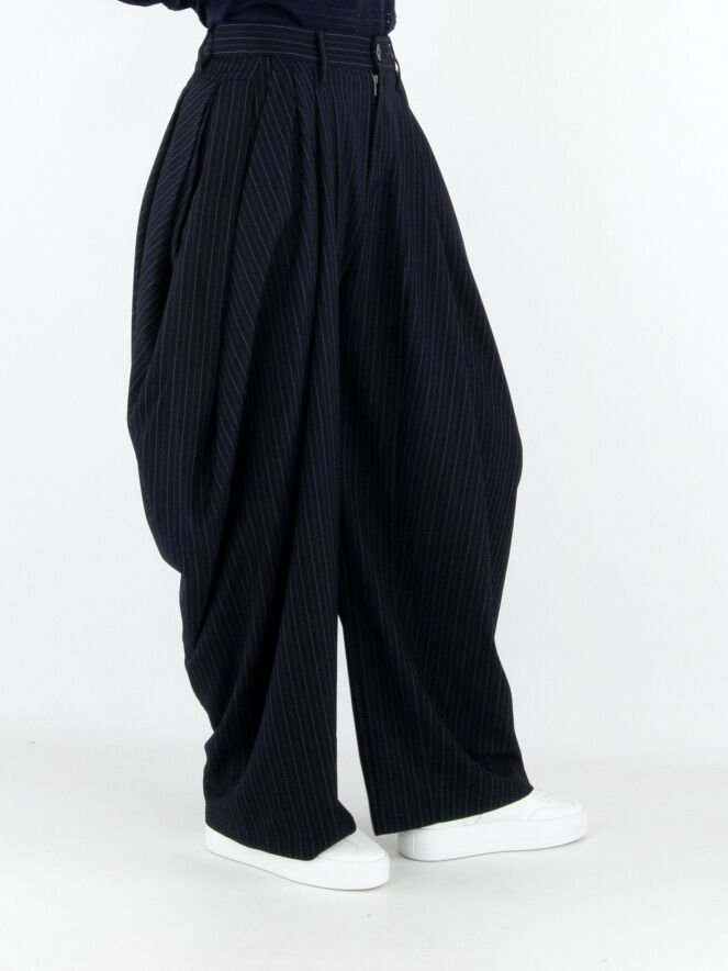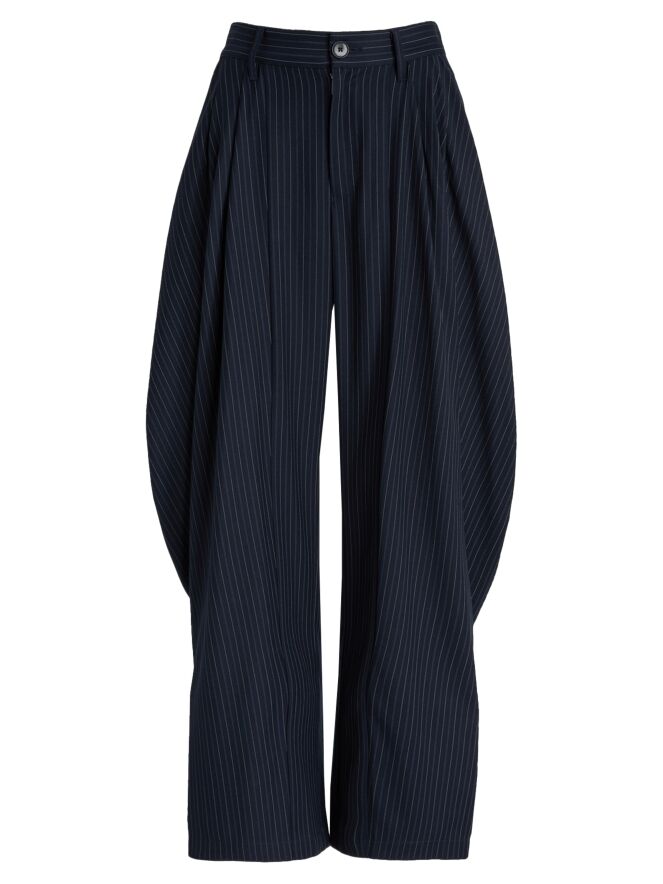 Een broek van High in een paardrij-inspiratie, uitgevoerd in een marineblauwe krijtstreep met blauwe en roomwitte strepen. Vanuit de taille lopen meerdere bandplooien, waarbij de extra brede plooien aan de zijkanten het ballon-effect versterken. De broek is voorzien van steekzakken en mag met de hand worden gewassen.