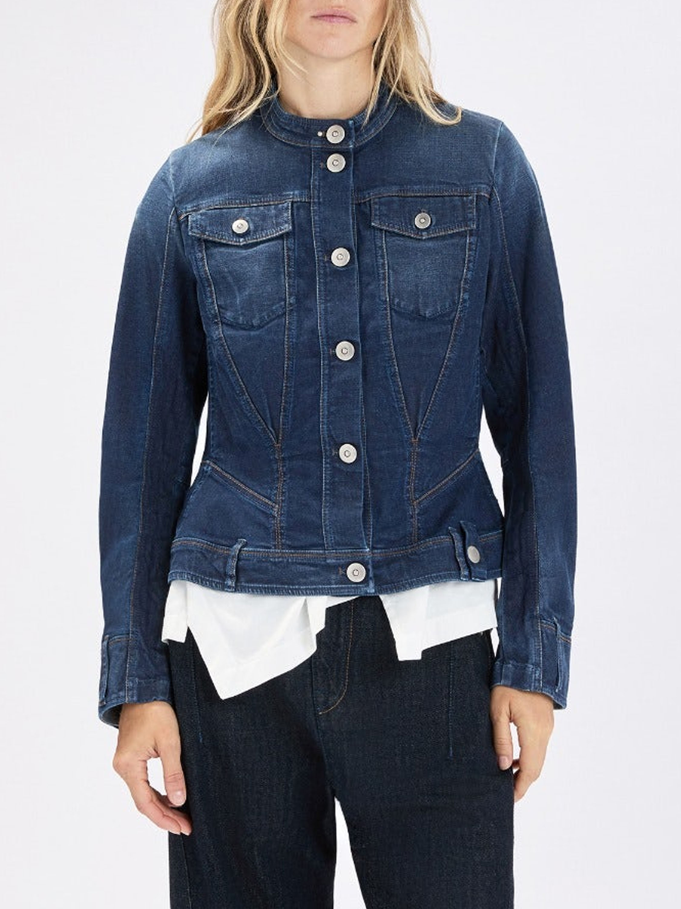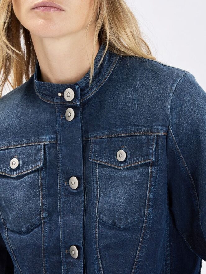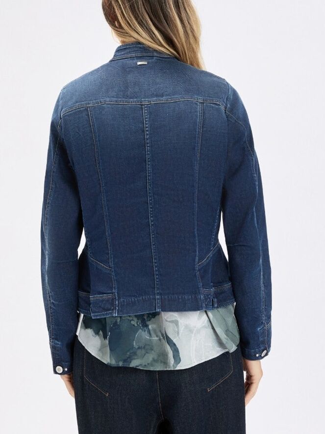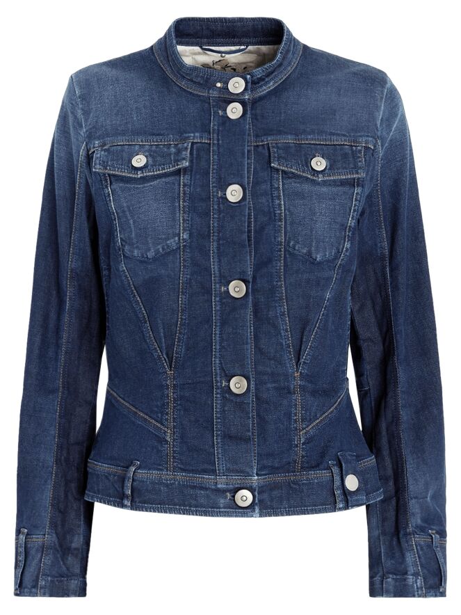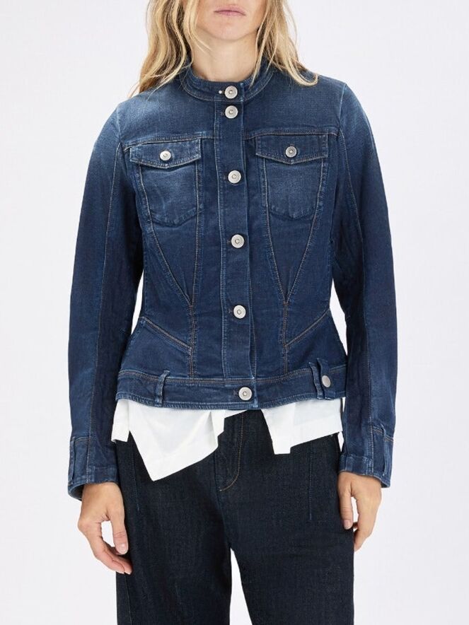 Jeansblazer van High in een volle jeansblauwe tint. De stiknaden zijn uitgevoerd in een contrasterende cognackleur, wat het ontwerp een warm en verfijnd accent geeft. De blazer is getailleerd en voorzien van steekzakken ter hoogte van de taille. De sluiting bestaat uit zes metaalgekleurde ronde knopen. Deze blazer kan op 30 graden worden gewassen.
