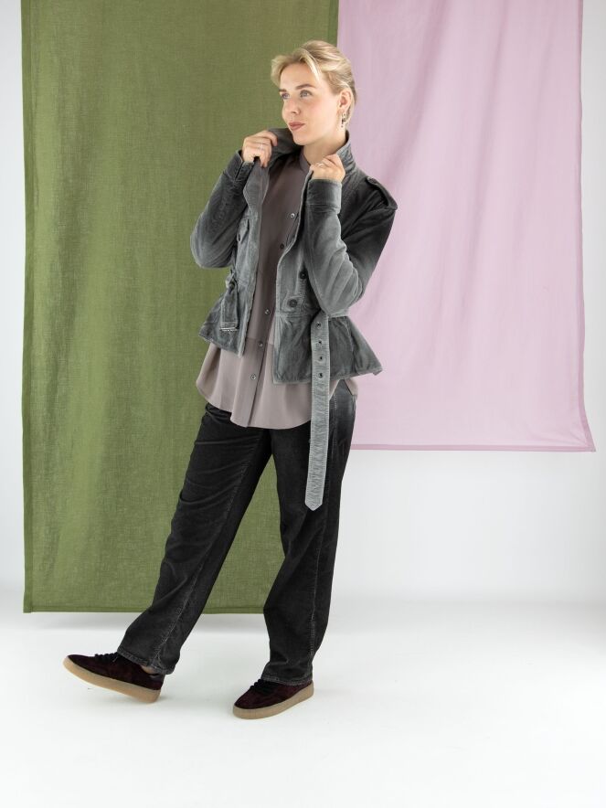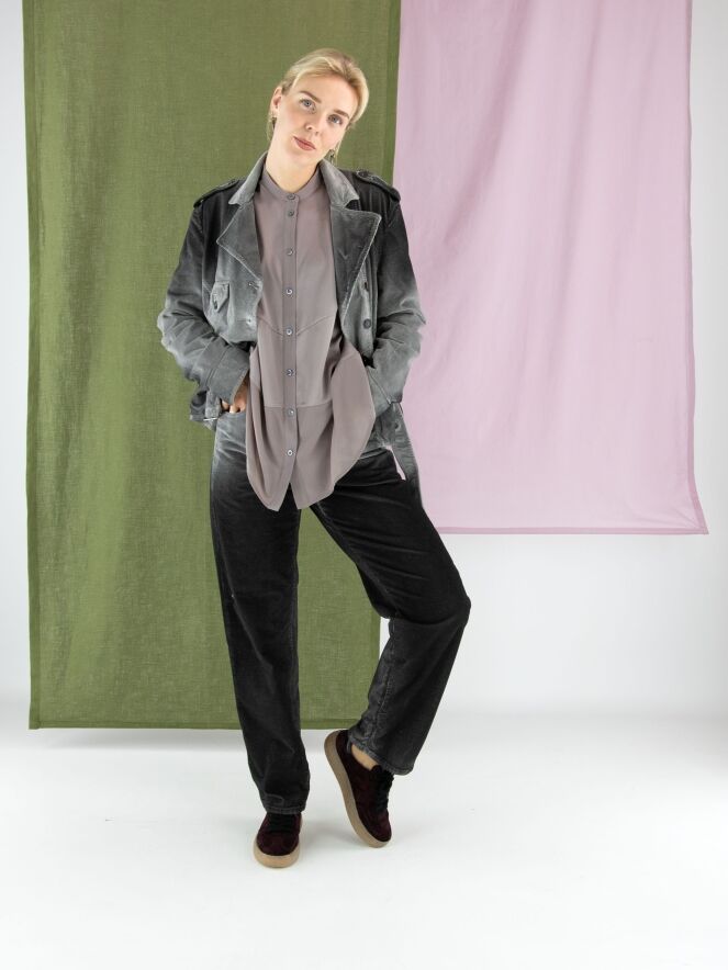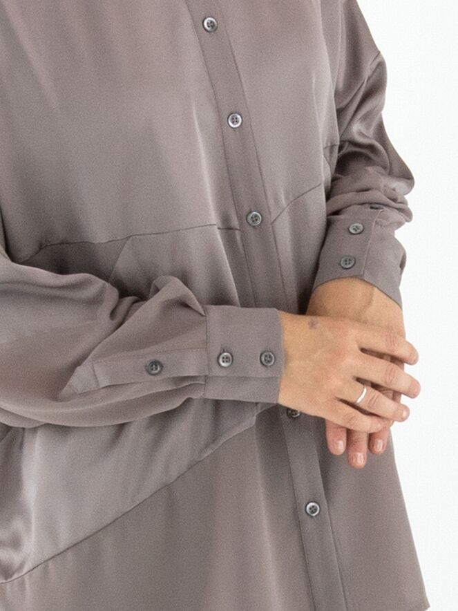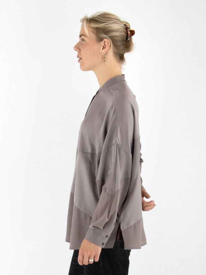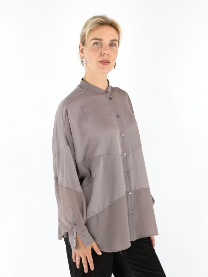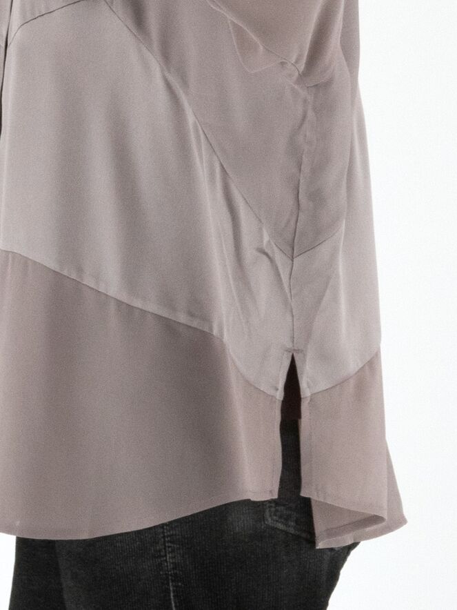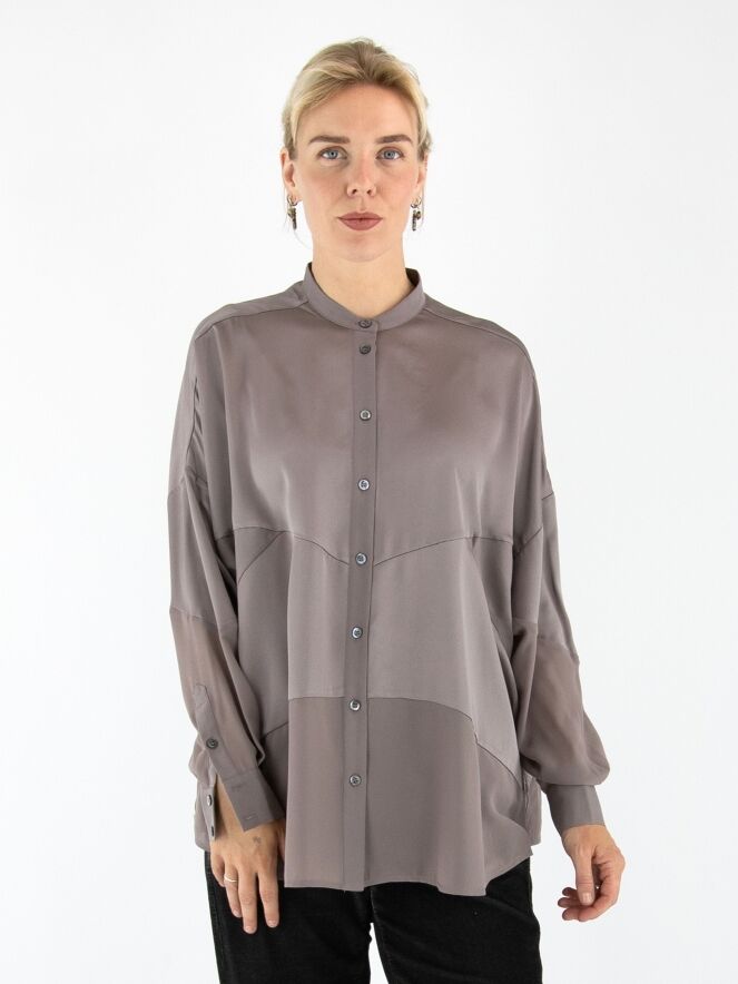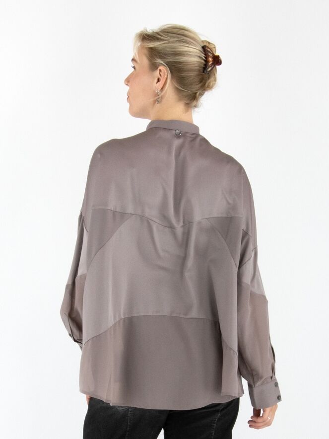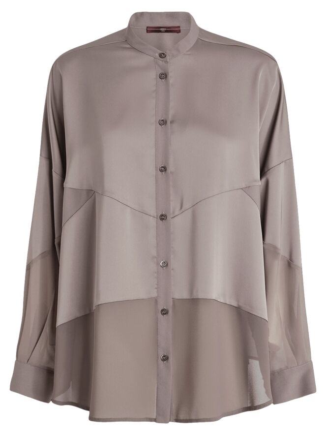 Een blouse van High in de kleur grijs. De blouse combineert delen in een matte satijnen stof met delen in een licht transparante, matte stof. Deze blouse mag op 30 graden worden gewassen.