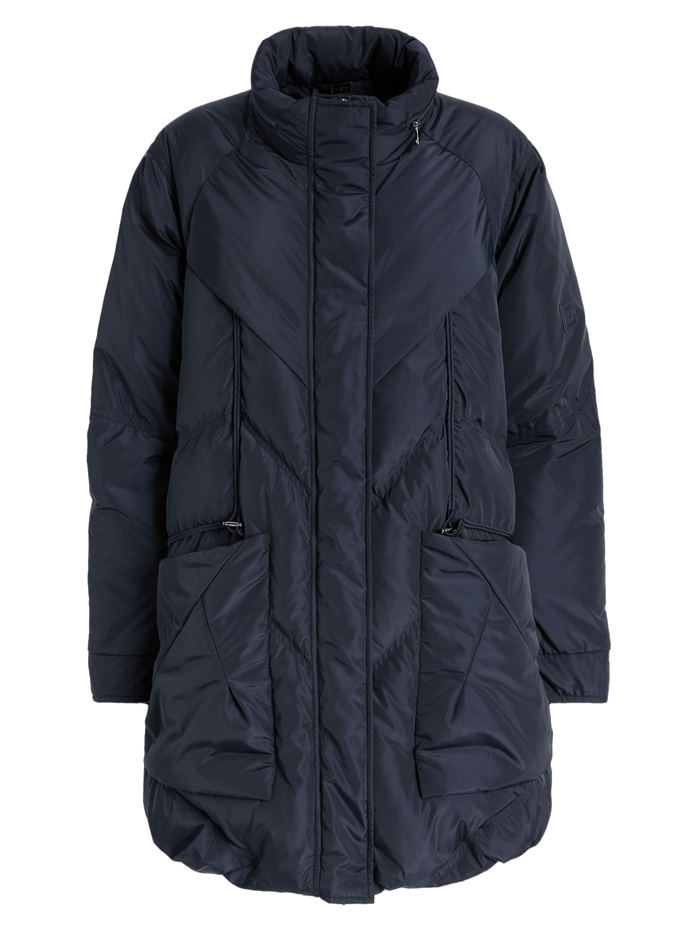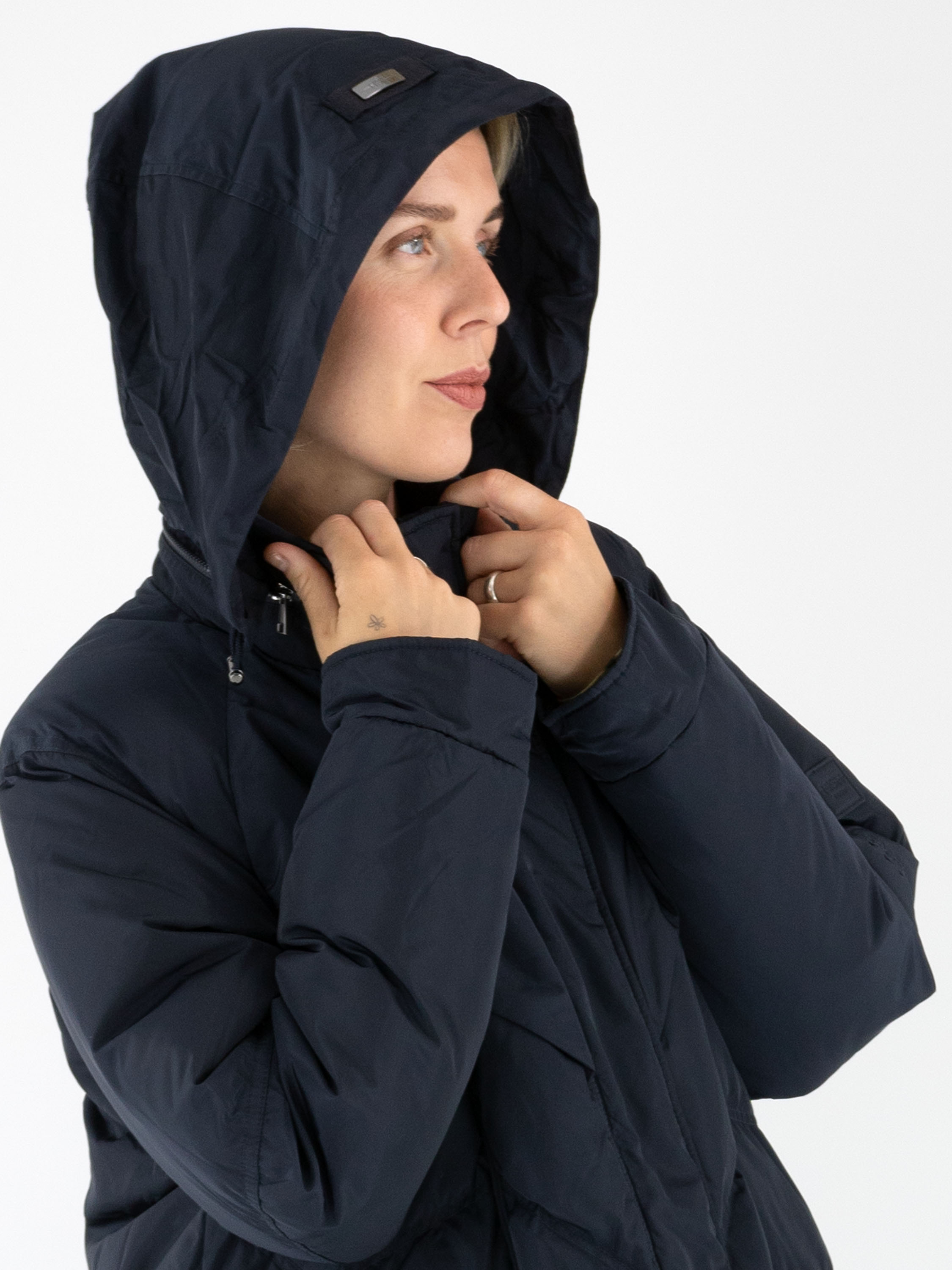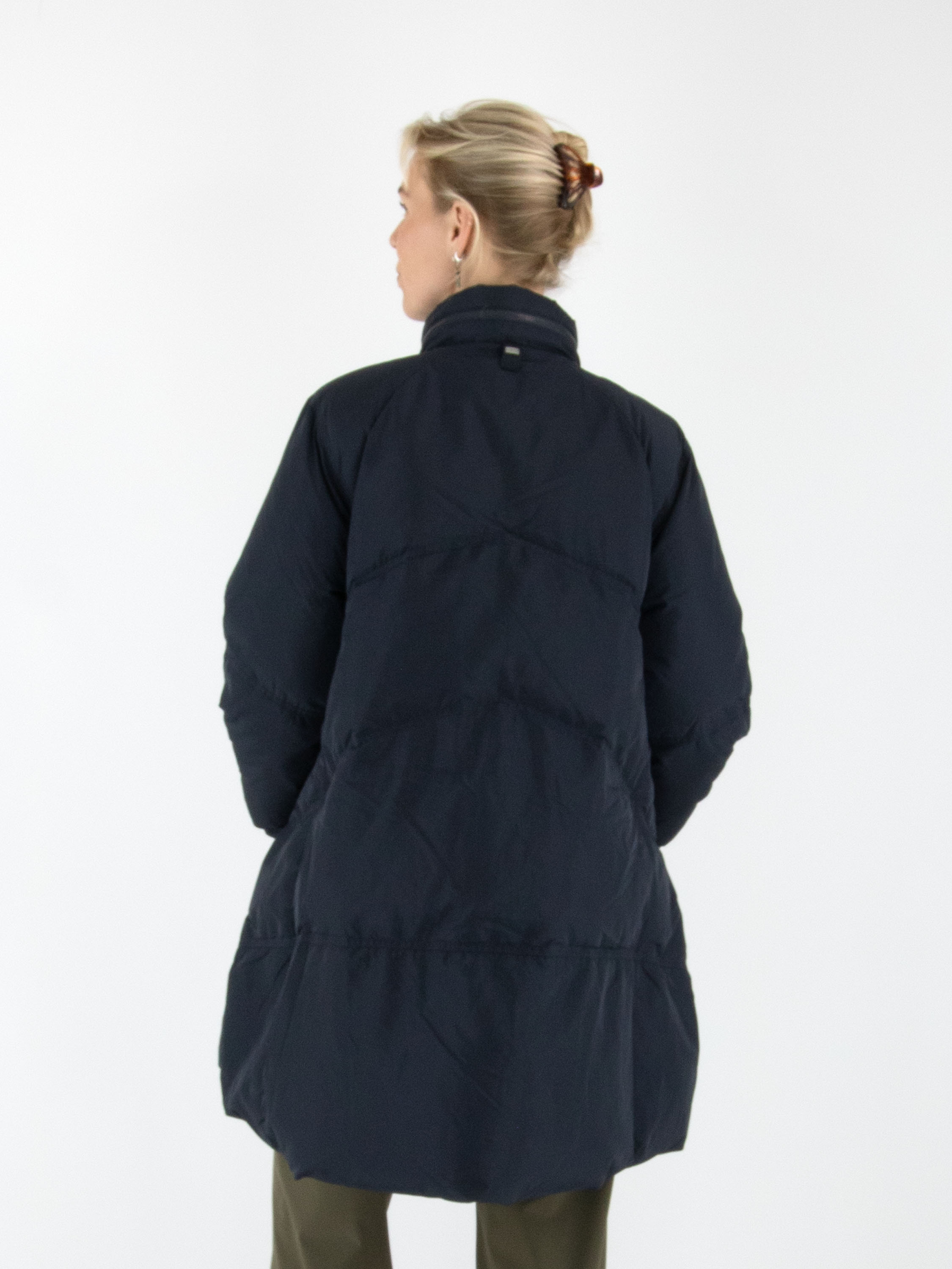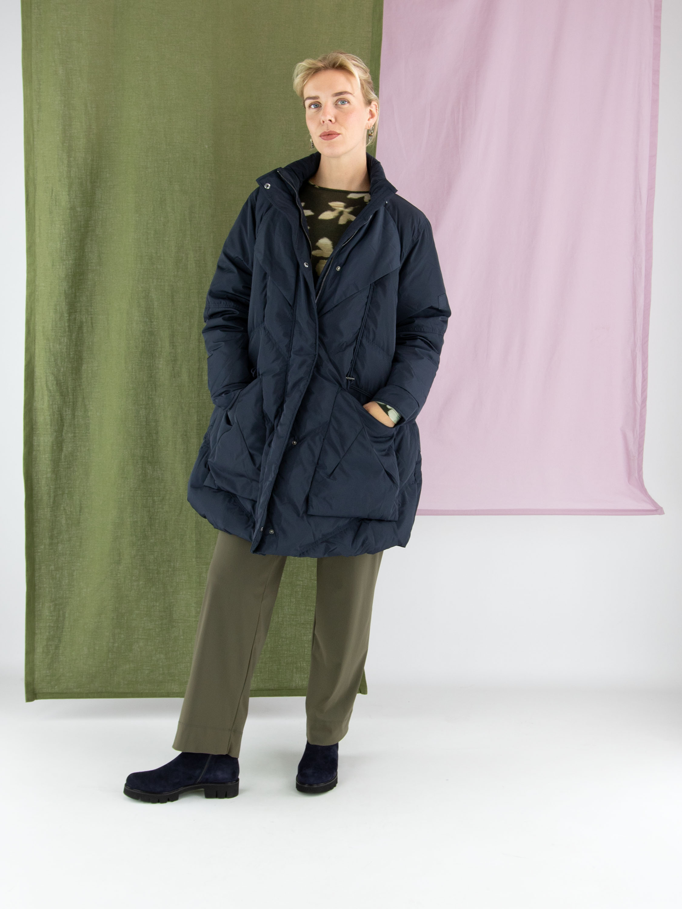 Een halflange coat van High in een diepe marineblauwe kleur. In de kraag bevindt zich een rits waarachter een verborgen capuchon schuilgaat. Over de ritssluiting loopt een tweede sluiting met drukknopen. De coat heeft ruime zakken en is afgewerkt met meerdere diagonale stiknaden in de stof. Deze coat mag op 30 graden worden gewassen.