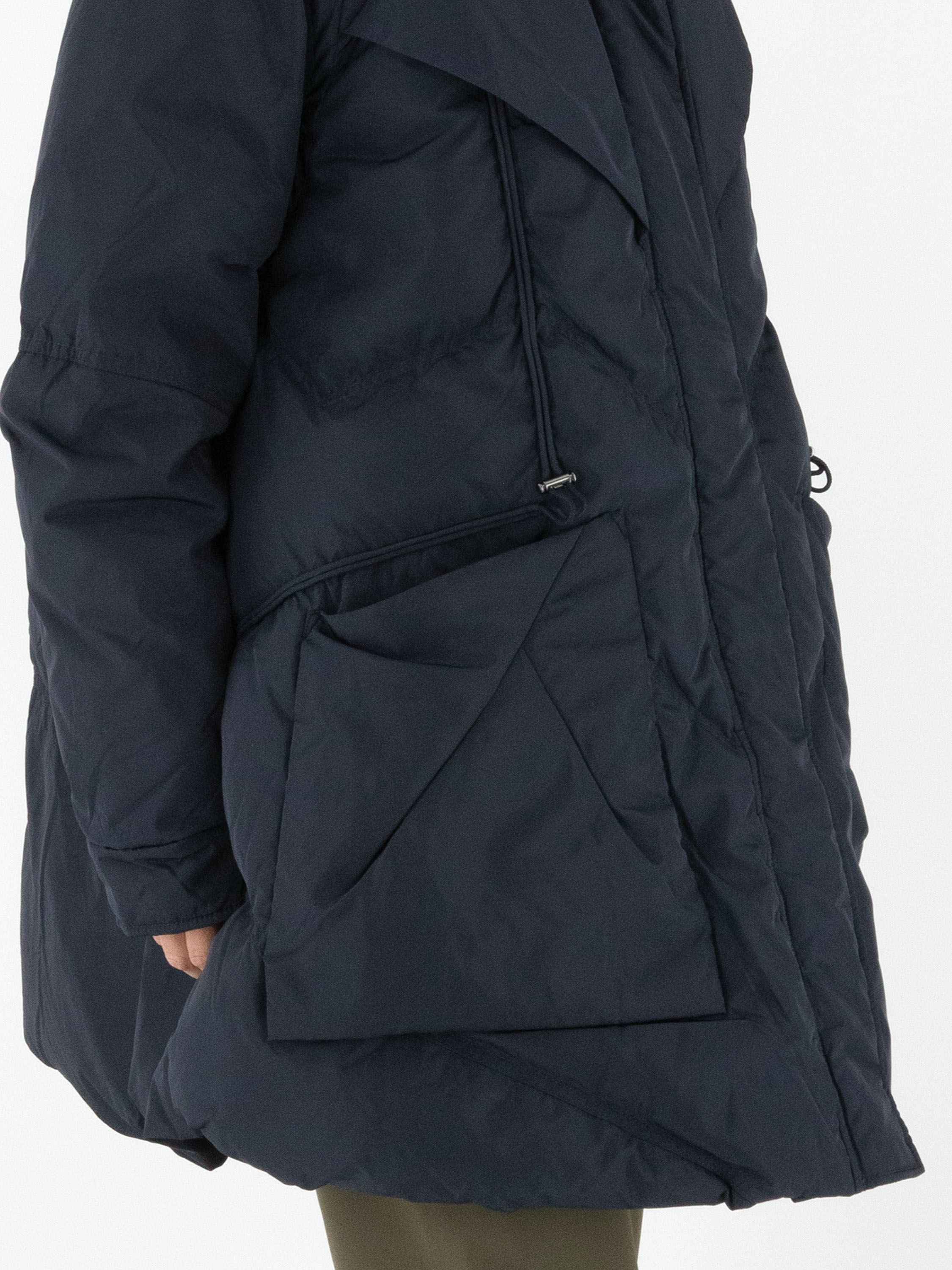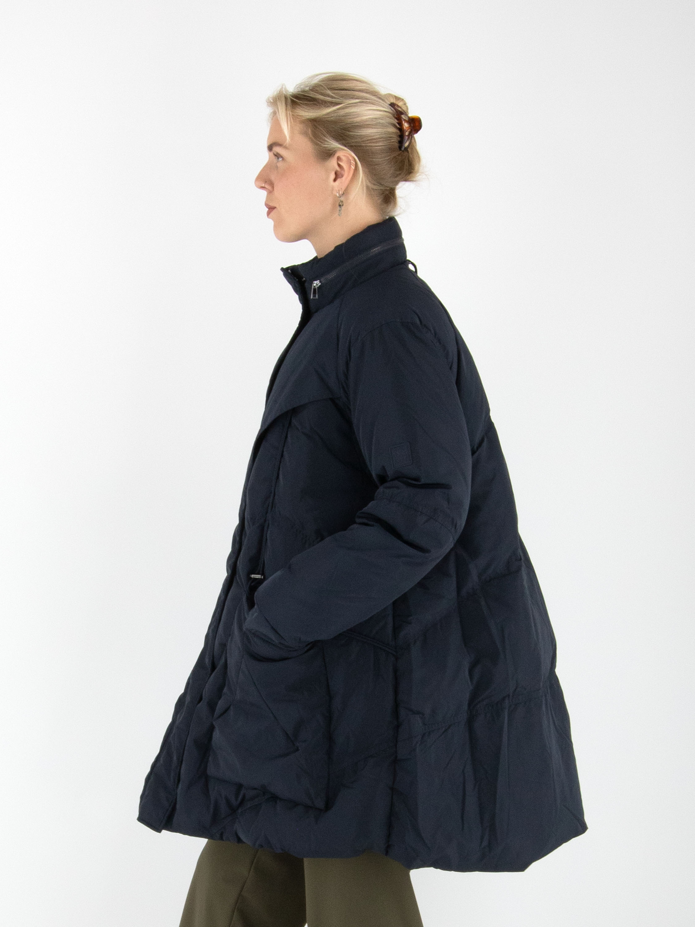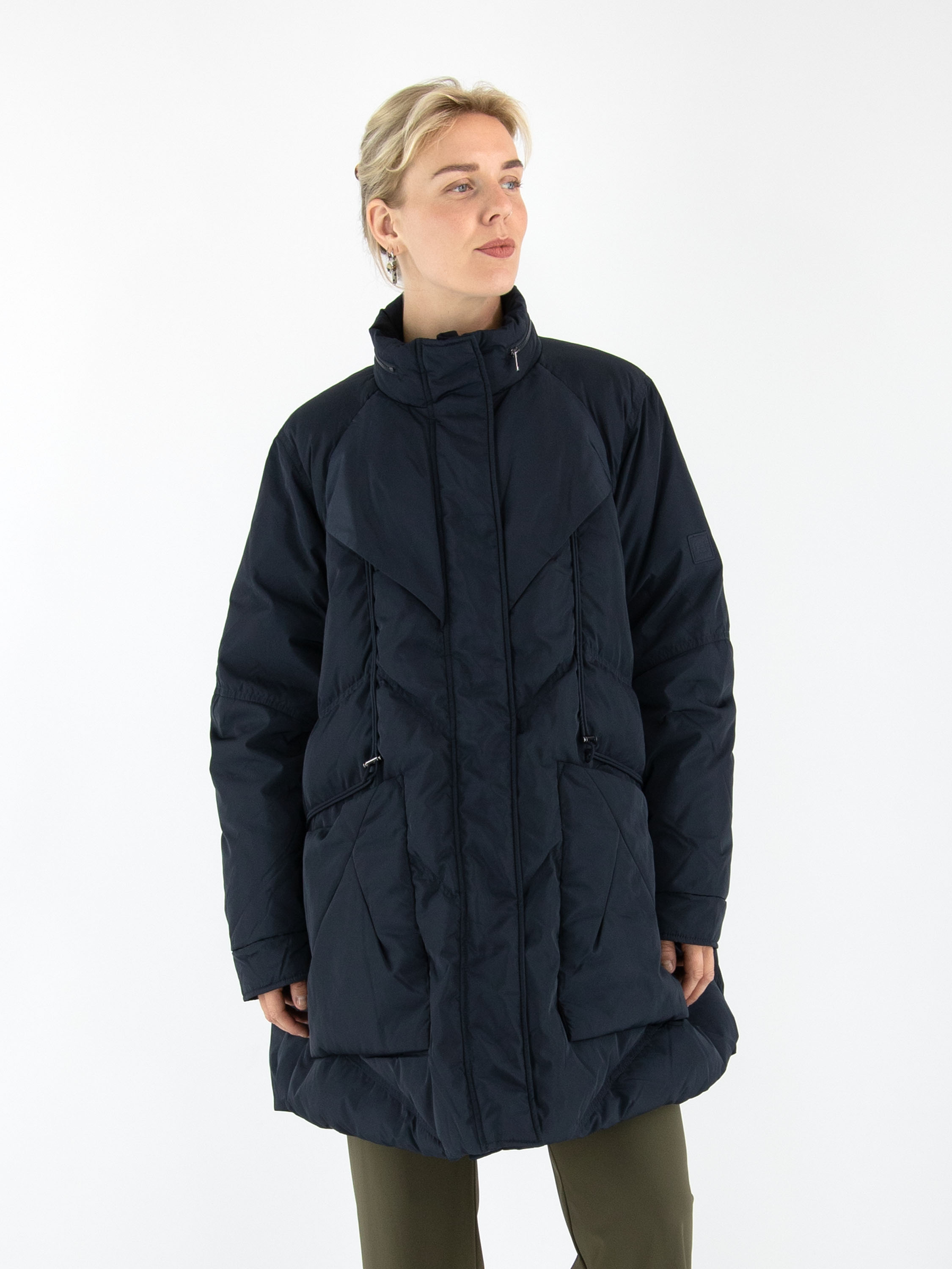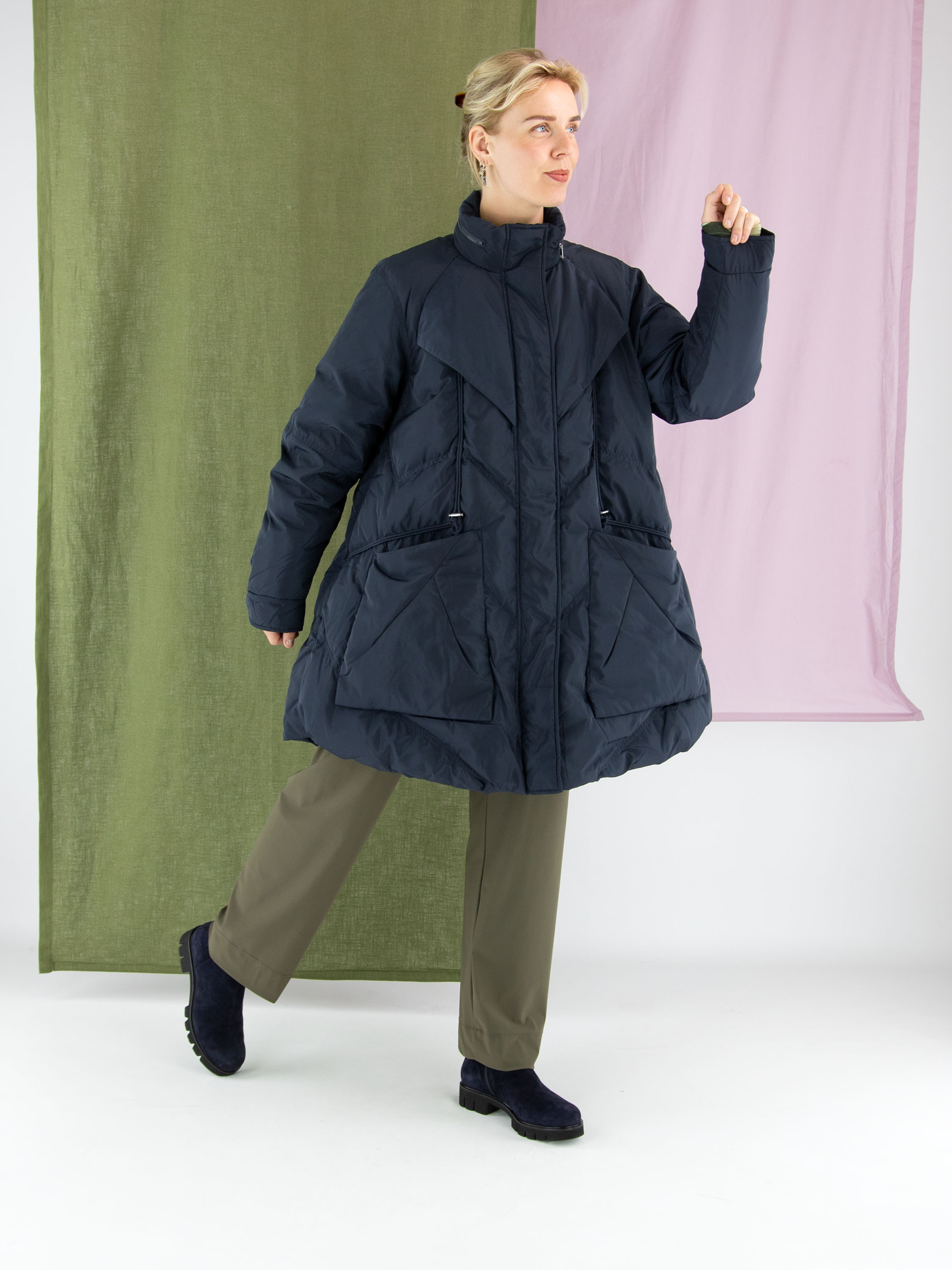 Een halflange coat van High in een diepe marineblauwe kleur. In de kraag bevindt zich een rits waarachter een verborgen capuchon schuilgaat. Over de ritssluiting loopt een tweede sluiting met drukknopen. De coat heeft ruime zakken en is afgewerkt met meerdere diagonale stiknaden in de stof. Deze coat mag op 30 graden worden gewassen.