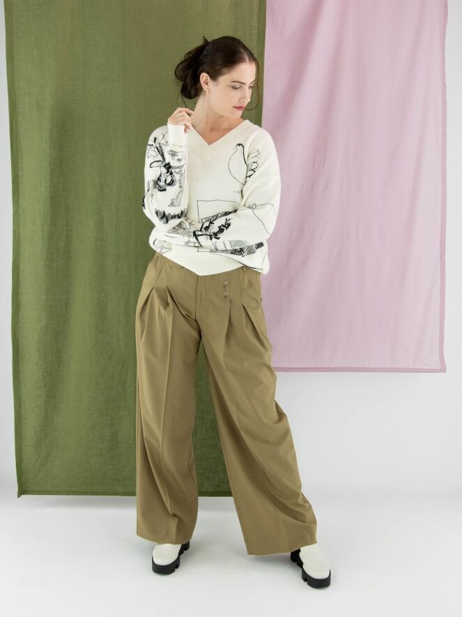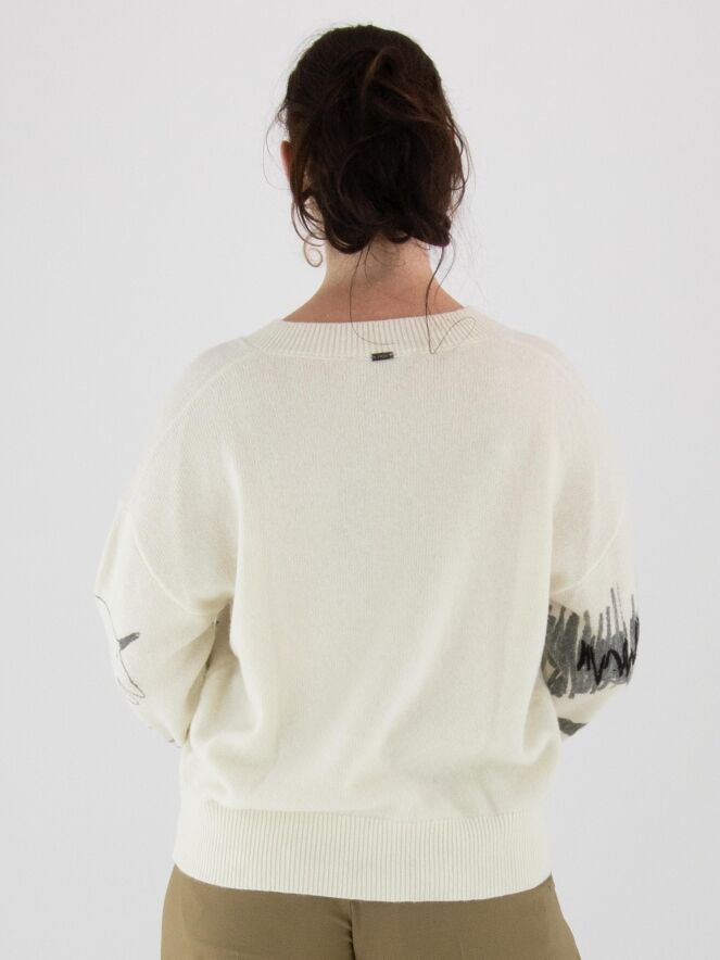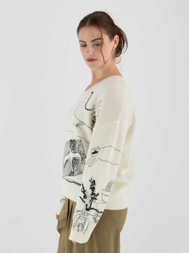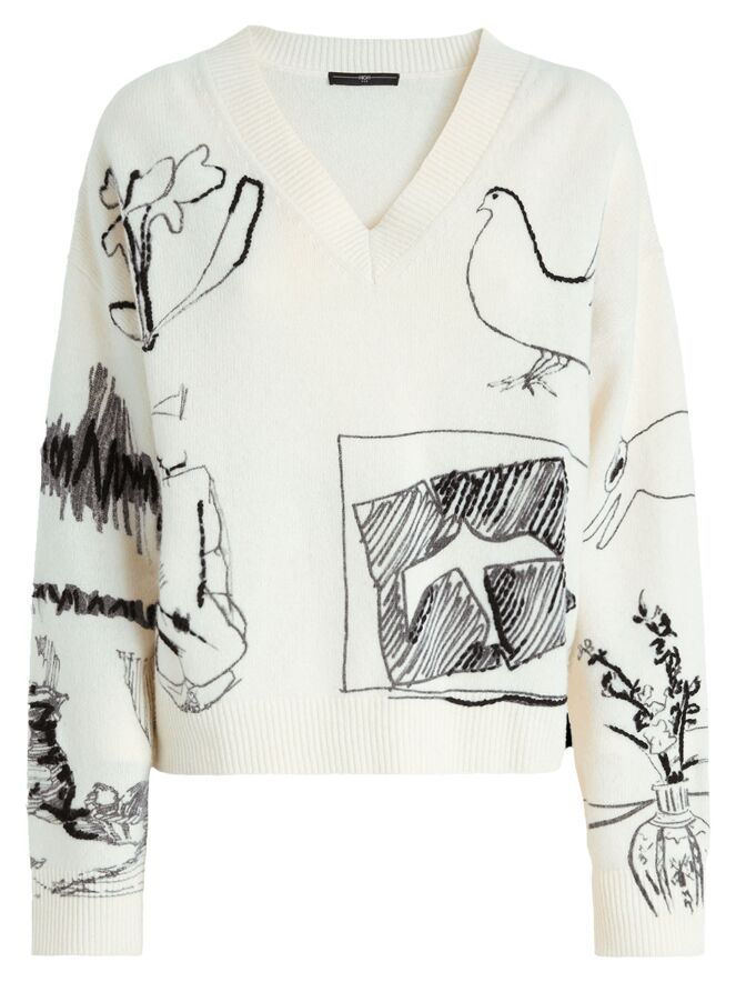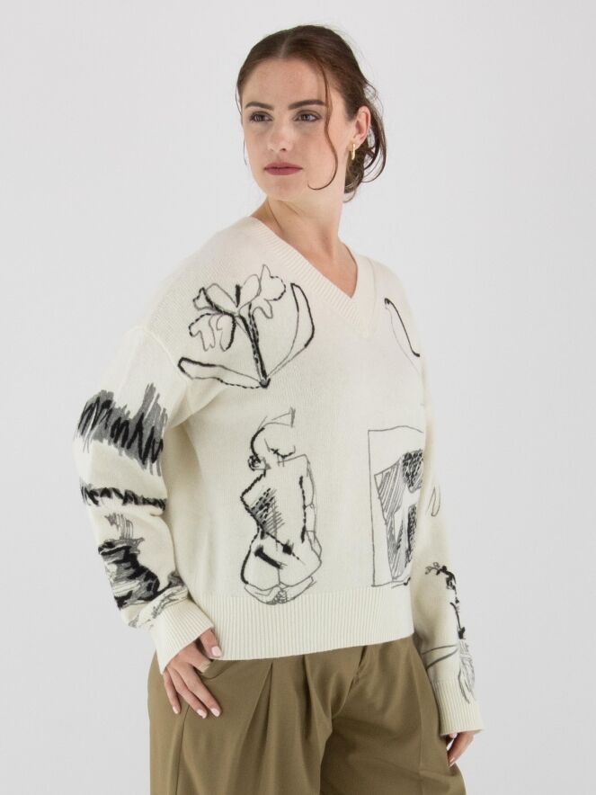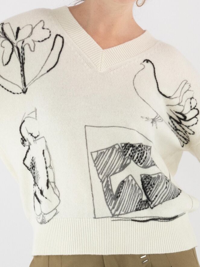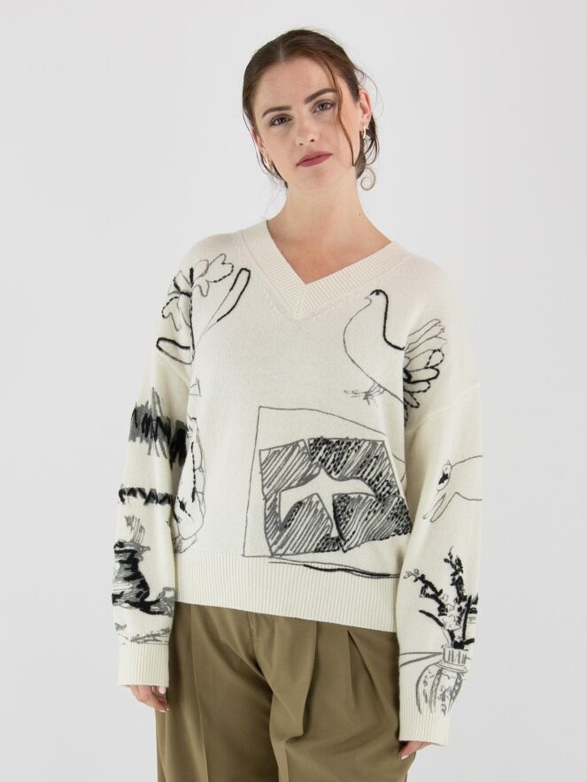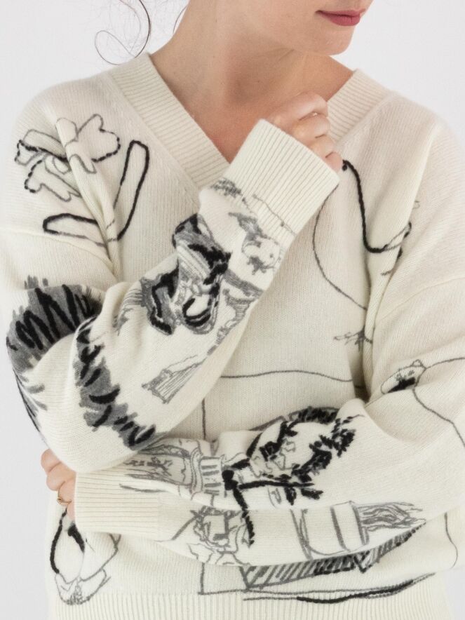 Een pullover van High met aan de voorkant naïeve schetsen in het zwart op een roomwitte achtergrond. De achterkant is uitgevoerd in een uni roomwitte kleur. De pullover heeft een V-hals met langs de rand een fijn geribbelde tricot boord. Deze pullover mag met de hand worden gewassen.