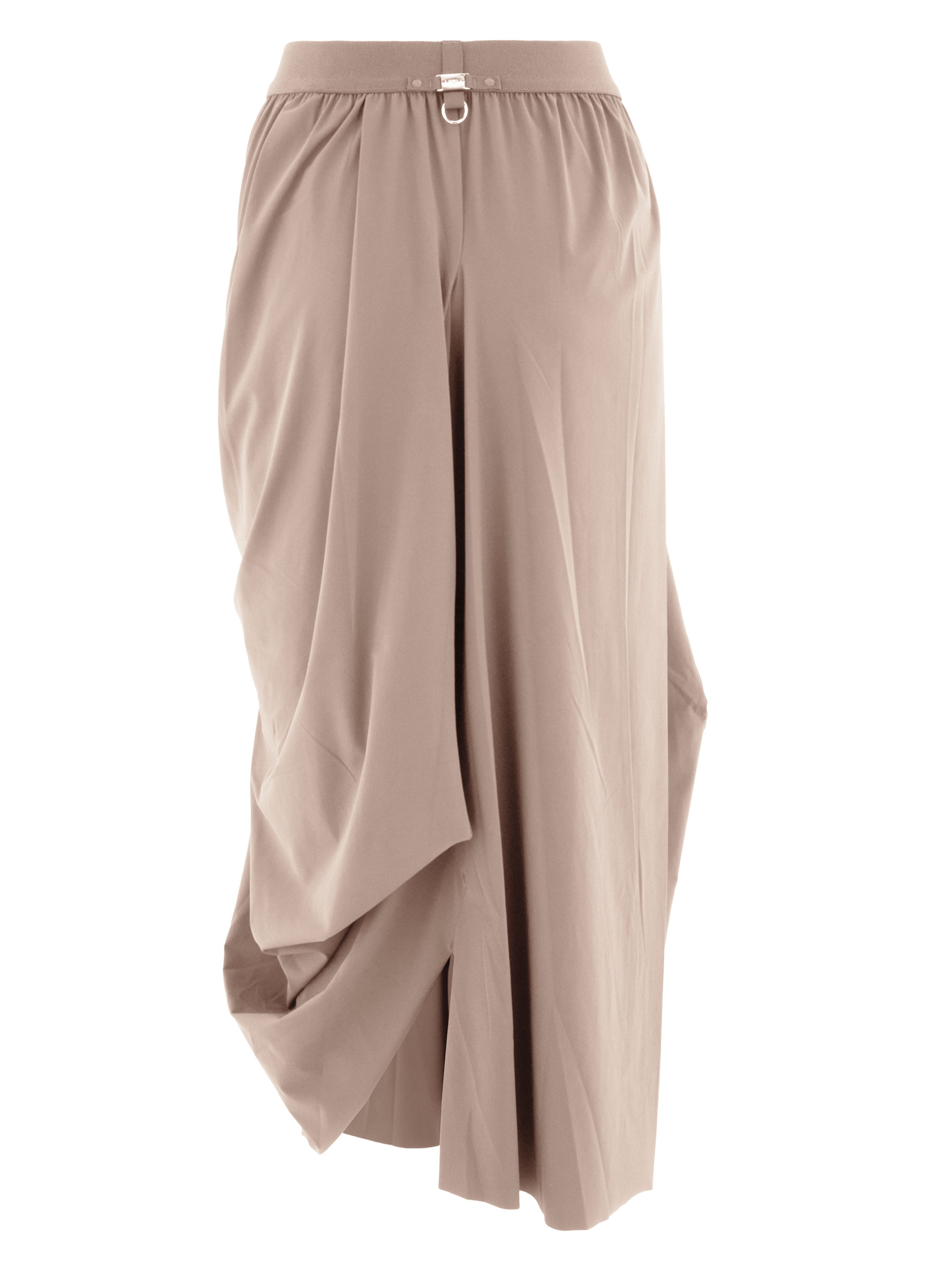 Een rok van High Tech in een nude of pastelroze kleur. In de taille is een elastieken band. Vanuit de tailleband zijn aan de rechterzijde meerdere plooien aangebracht die naar beneden toe een drapeereffect geven. Ter hoogte van de knie is aan de linkerzijde een ophaal verwerkt dat een plooieffect creëert. Deze rok mag op 30 graden worden gewassen.