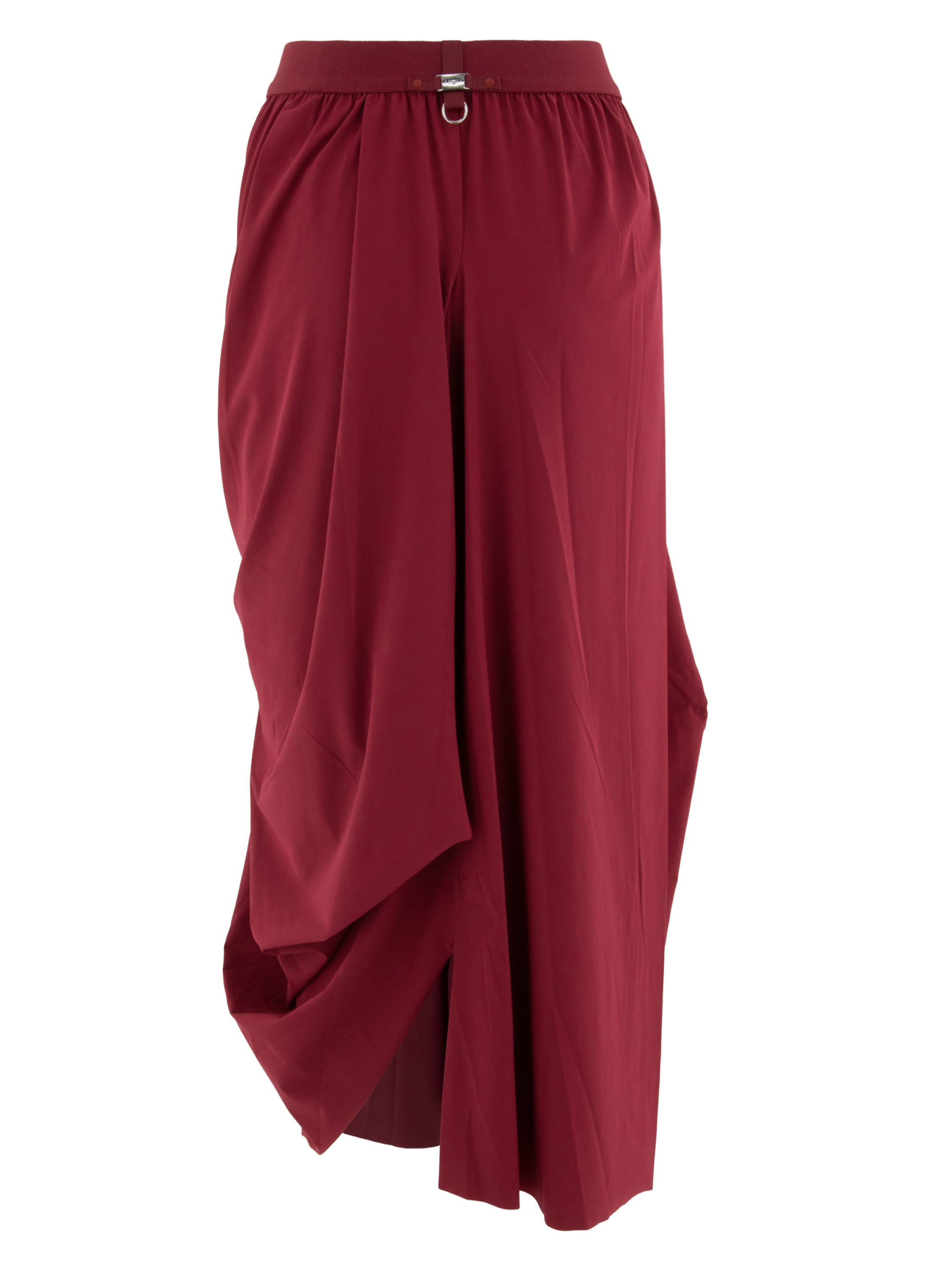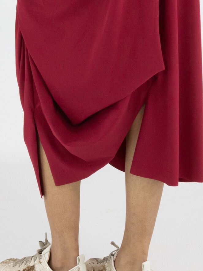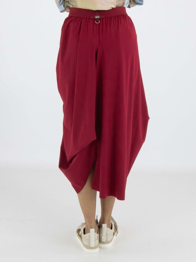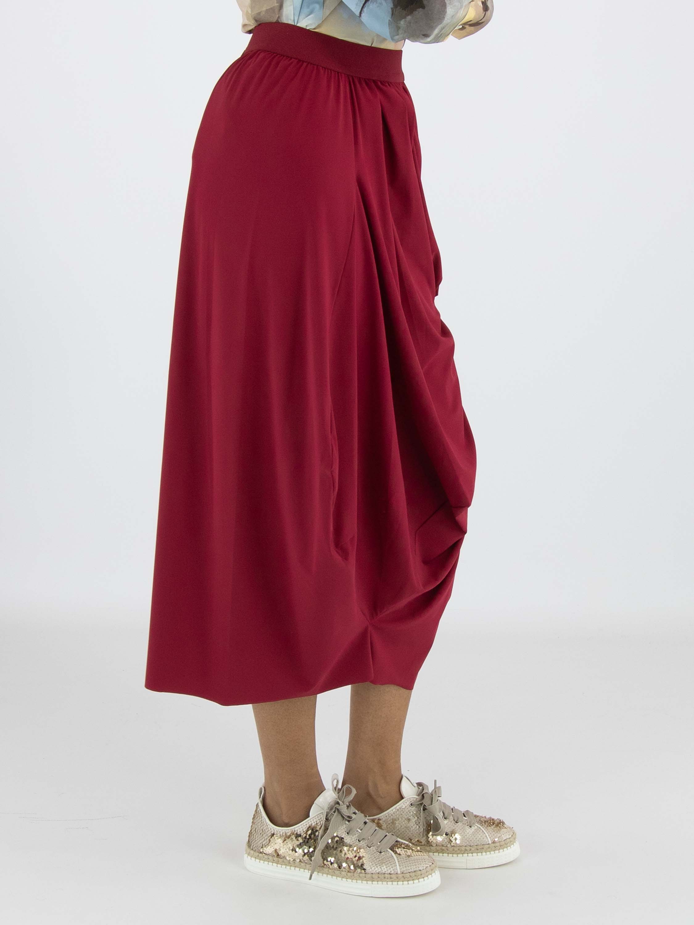 Een rok van High Tech in een framboosrode kleur. In de taille is een elastieken band. Vanuit de tailleband zijn aan de rechterzijde meerdere plooien die naar beneden toe een drapeereffect geven. Ter hoogte van de knie is aan de linkerzijde een ophaal verwerkt dat een plooi-effect creëert. Deze rok mag op 30 graden worden gewassen.