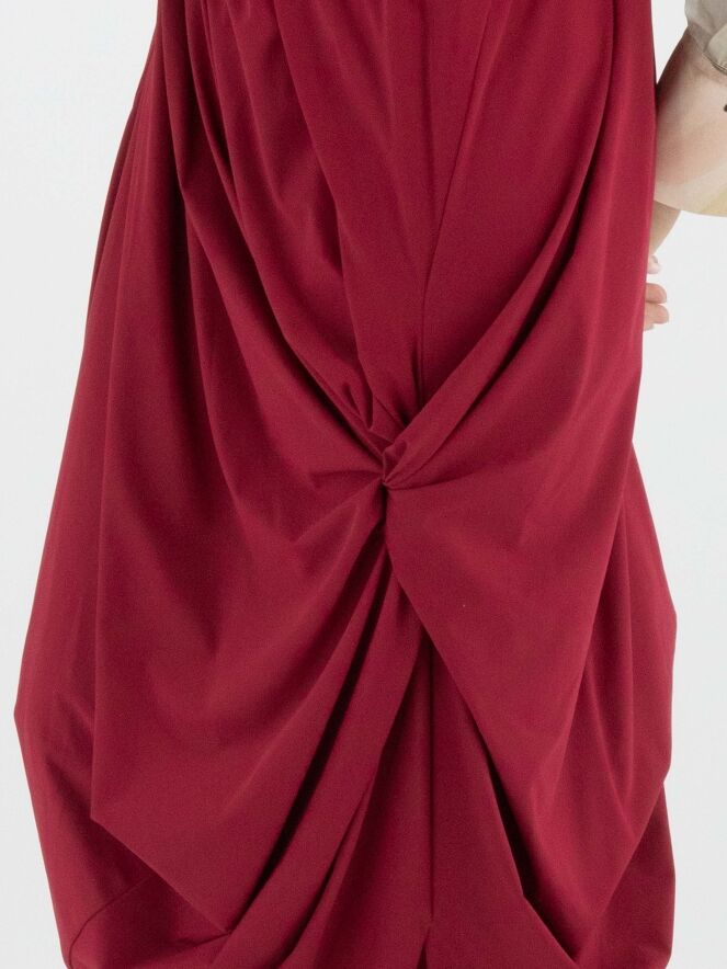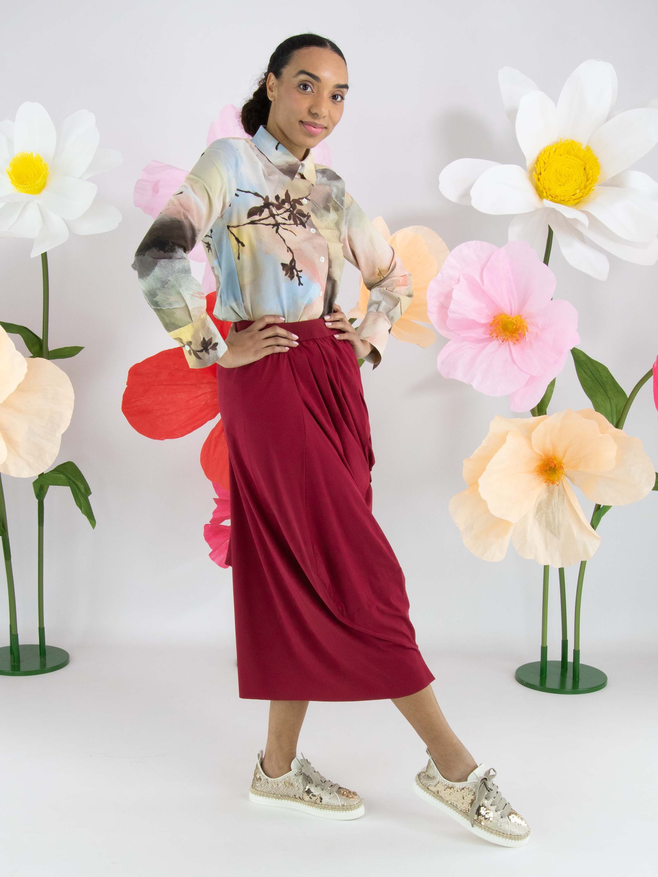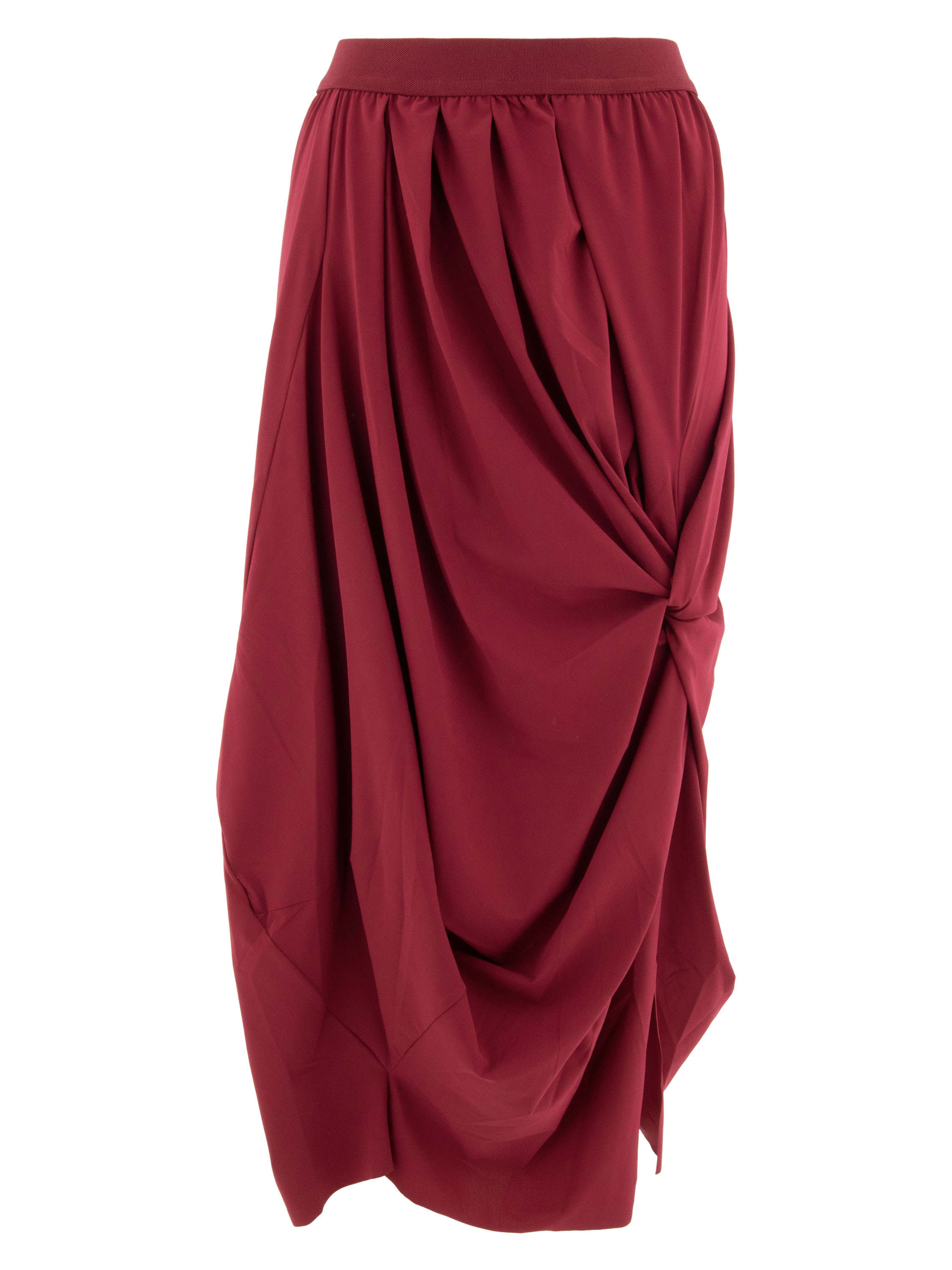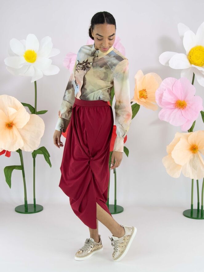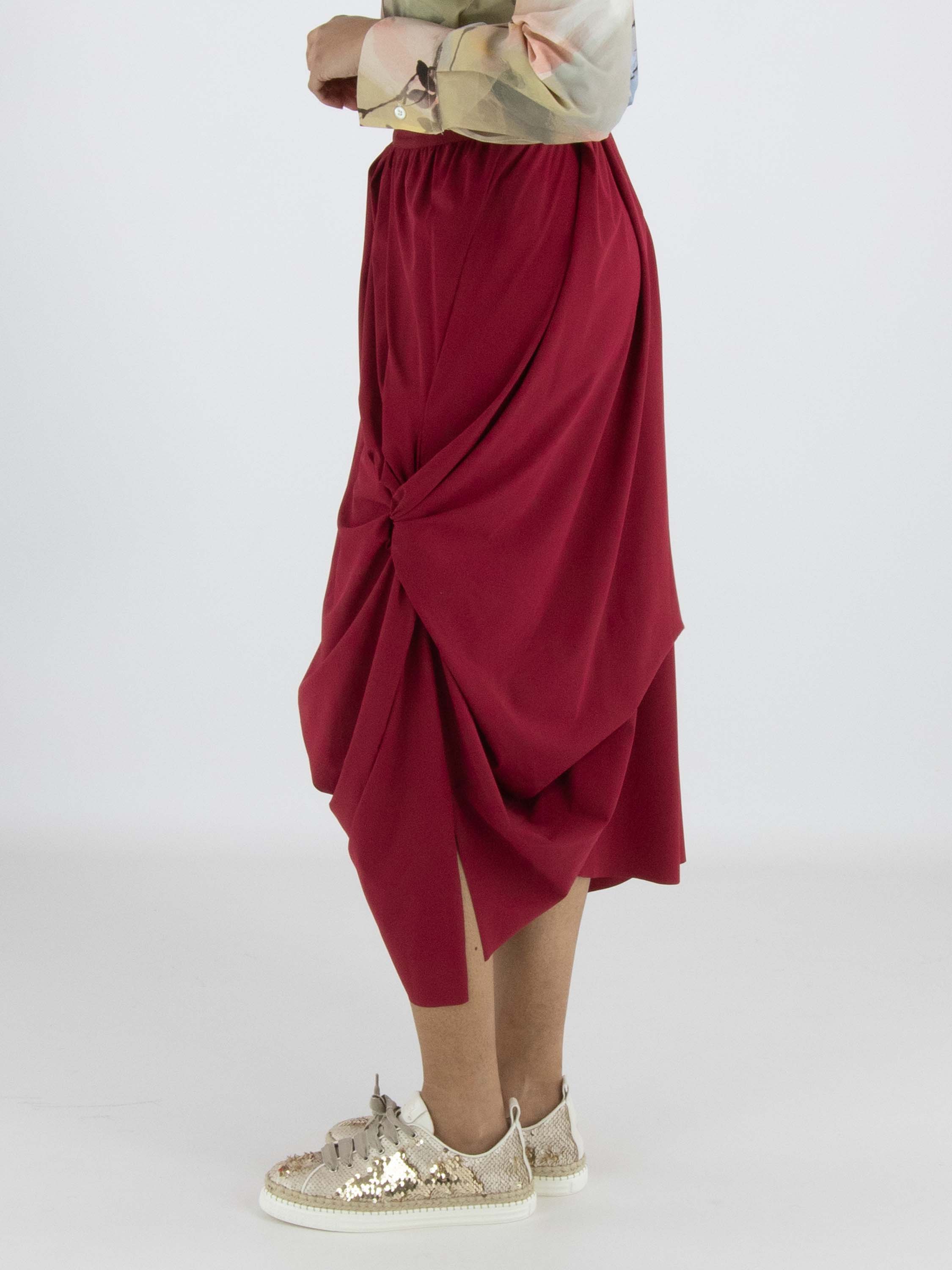 Een rok van High Tech in een framboosrode kleur. In de taille is een elastieken band. Vanuit de tailleband zijn aan de rechterzijde meerdere plooien die naar beneden toe een drapeereffect geven. Ter hoogte van de knie is aan de linkerzijde een ophaal verwerkt dat een plooi-effect creëert. Deze rok mag op 30 graden worden gewassen.