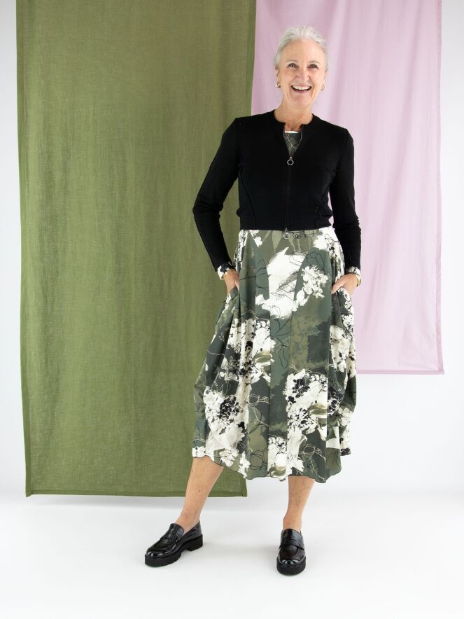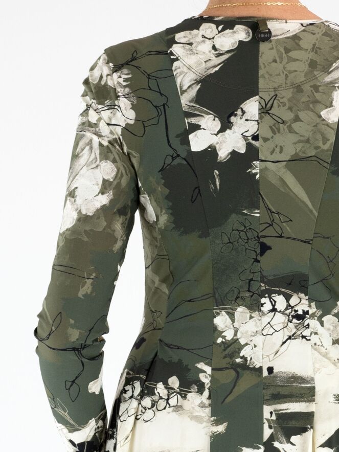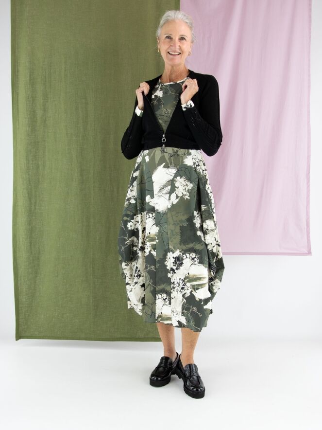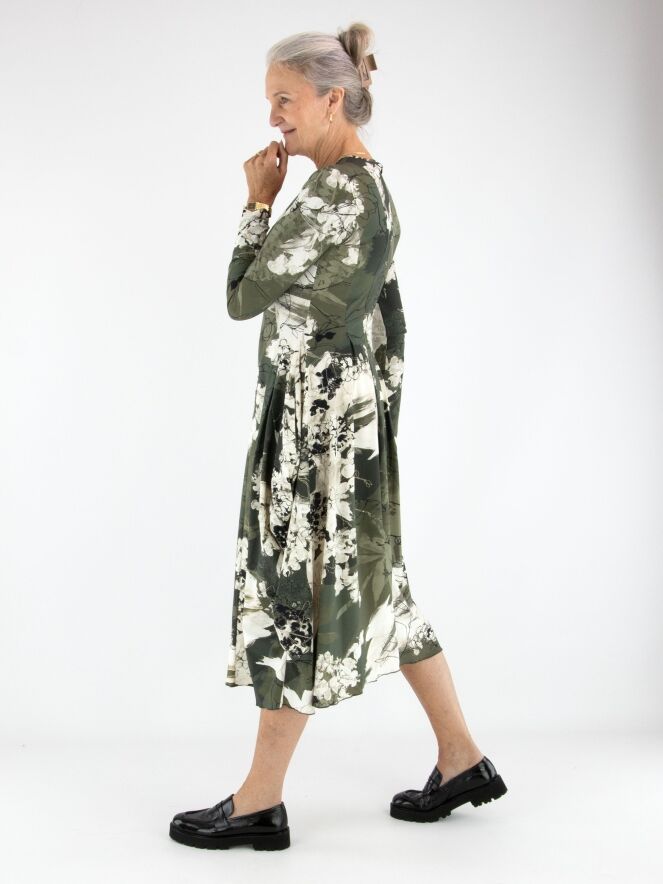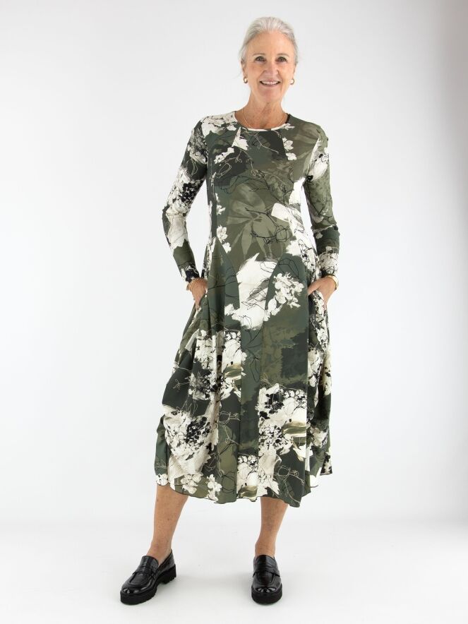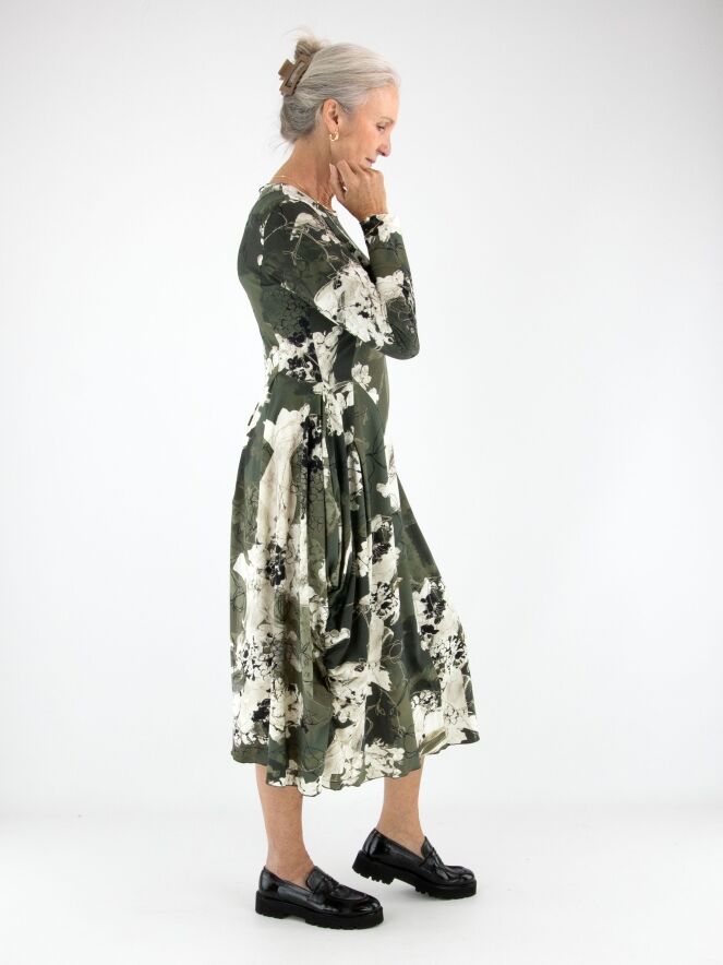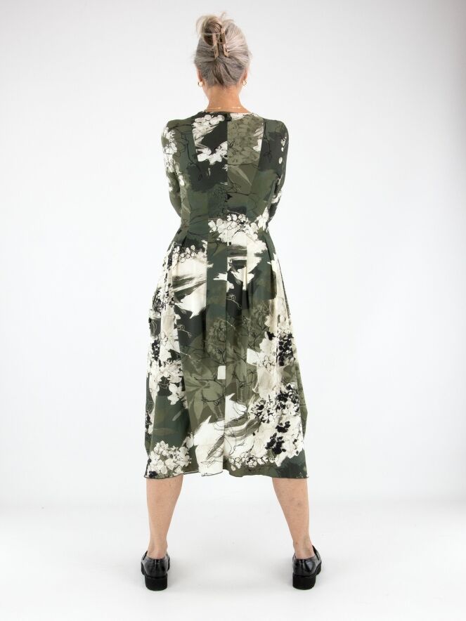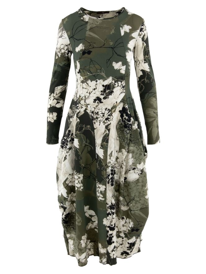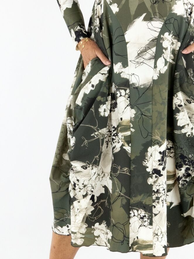 Jurk van High met een grafische bloemenprint in tinten zwart en olijfgroen op een roomwitte achtergrond. De jurk heeft een ronde hals en lange mouwen, met steekzakken verwerkt ter hoogte van de taille. Vanaf de taille loopt het ontwerp uit in een elegant balloneffect, wat zorgt voor een eigentijdse en vrouwelijke uitstraling. Deze exclusieve designerjurk kan op 30 graden worden gewassen.