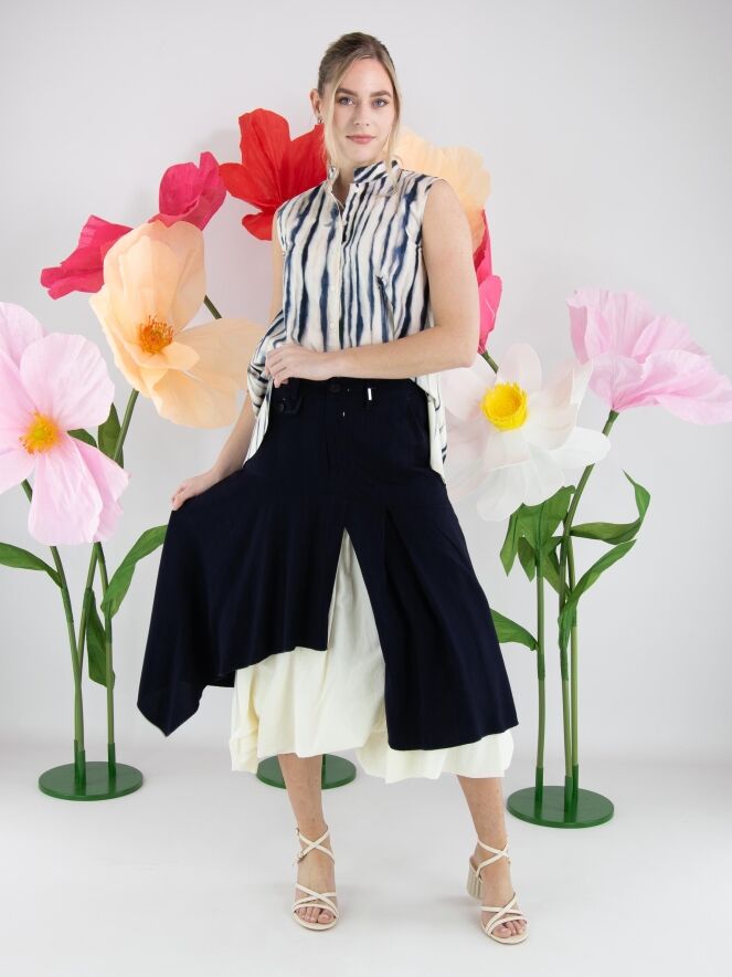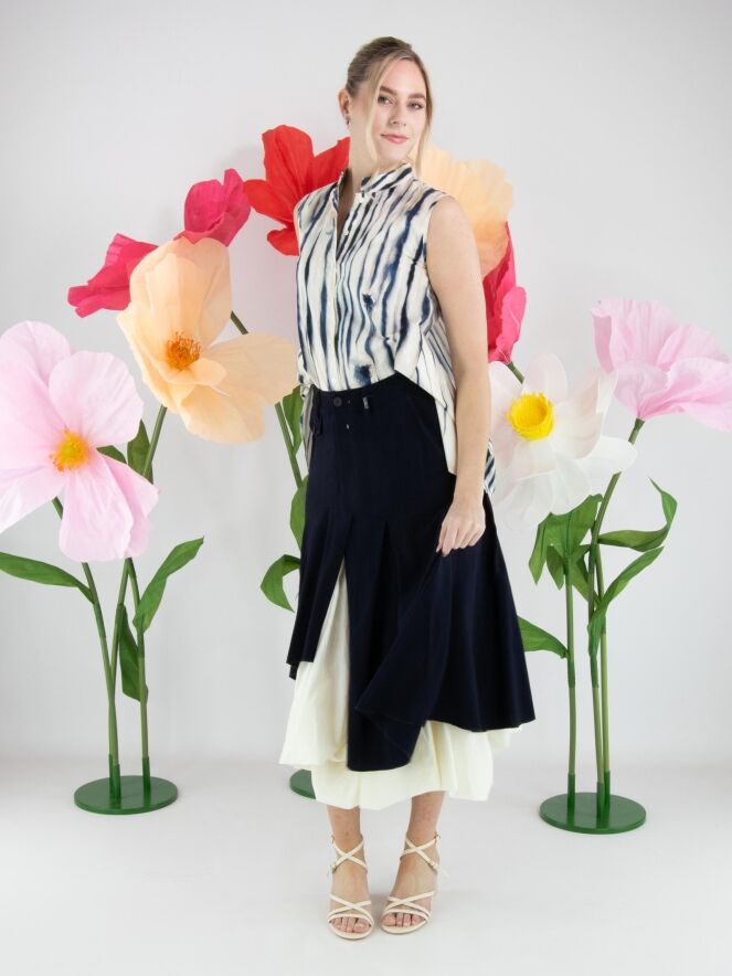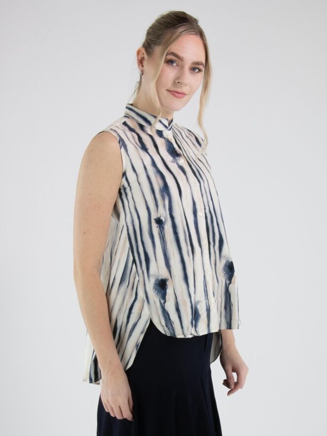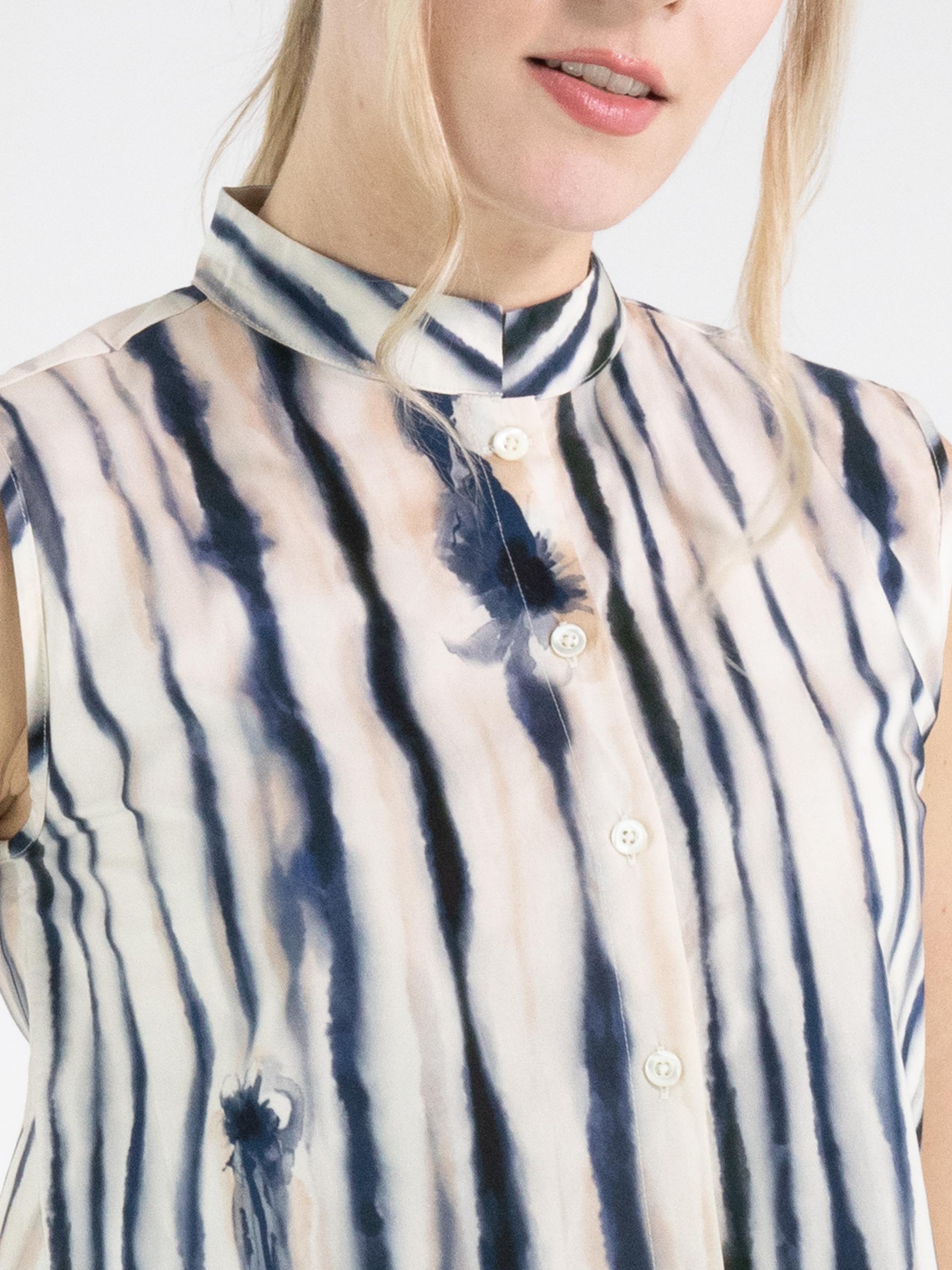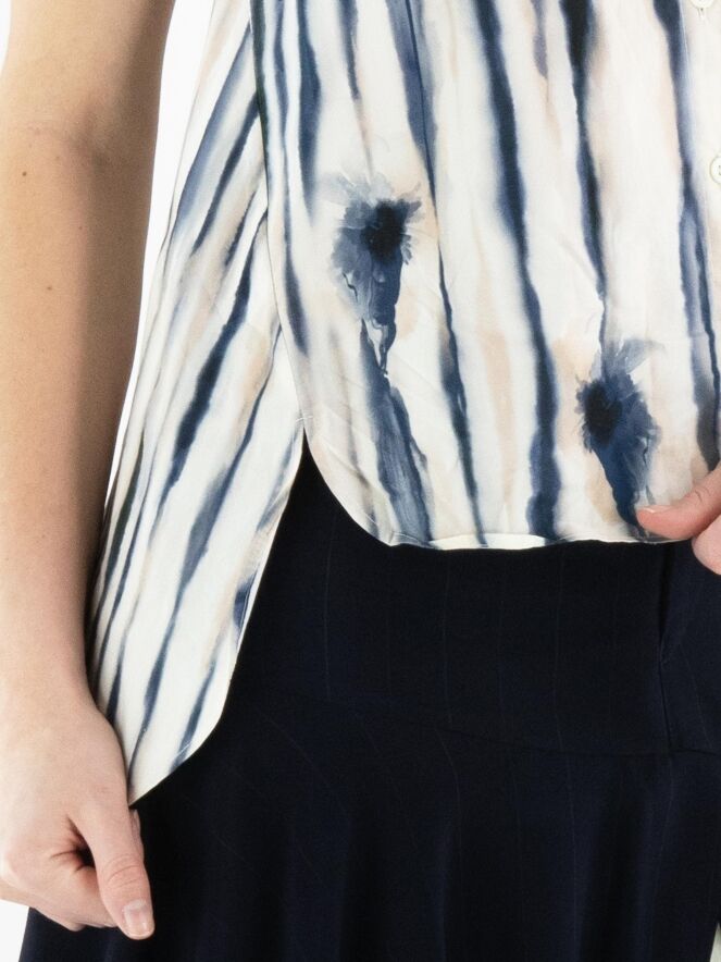 Top van High in een grafische paintprint met verticale lijnen in meerdere tinten blauw op een roomwitte achtergrond. De top heeft een knoopsluiting en is licht uitgevoerd in een A-lijn, wat zorgt voor een vloeiend en eigentijds silhouet. Deze exclusieve designer top kan op 30 graden worden gewassen.