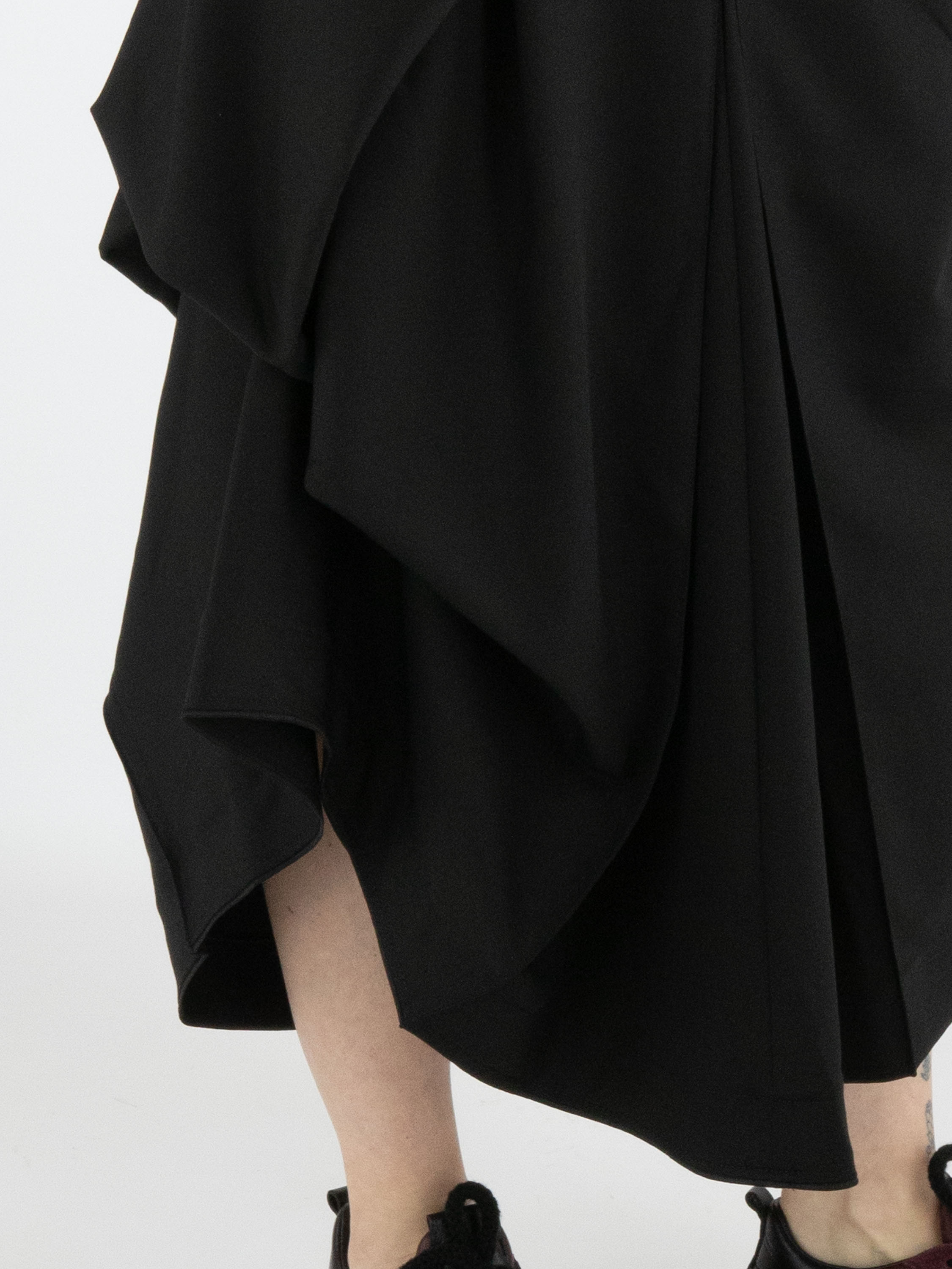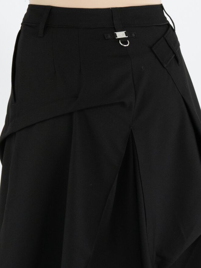 Een rok van High Tech in de kleur zwart. Onder de taille bevindt zich aan de rechter voorzijde een overslagplooi die doorloopt naar de achterkant. In het midden van de voor- en achterkant ontstaat onder de heup een plooivorming vanuit de middennaad. Ter hoogte van de heup is aan de linker zijkant de stof vastgezet, wat een extra plooieffect geeft. De rok heeft aan de linkerzijde een steekzak. Deze rok mag op de hand worden gewassen.