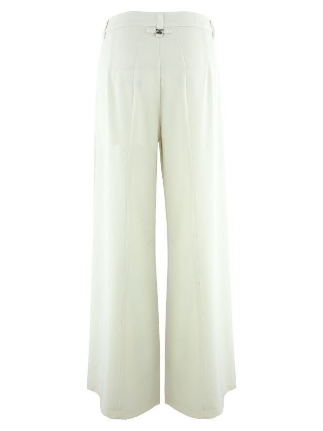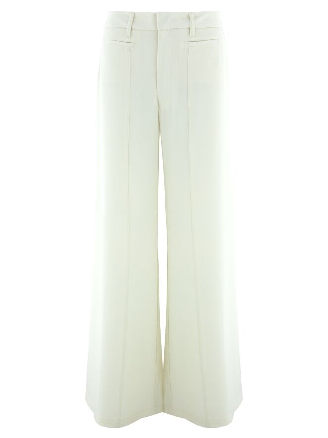 Wijde broek van High in een volle roomwitte tint. Aan de voorzijde, net onder de taille, zijn twee decoratieve zakken aangebracht die het ontwerp een karakteristiek detail geven. Vanuit het midden loopt aan de voorzijde een stiknaad over de gehele lengte van de pijpen, wat zorgt voor een slank en modern silhouet. Deze broek mag niet worden gewassen.