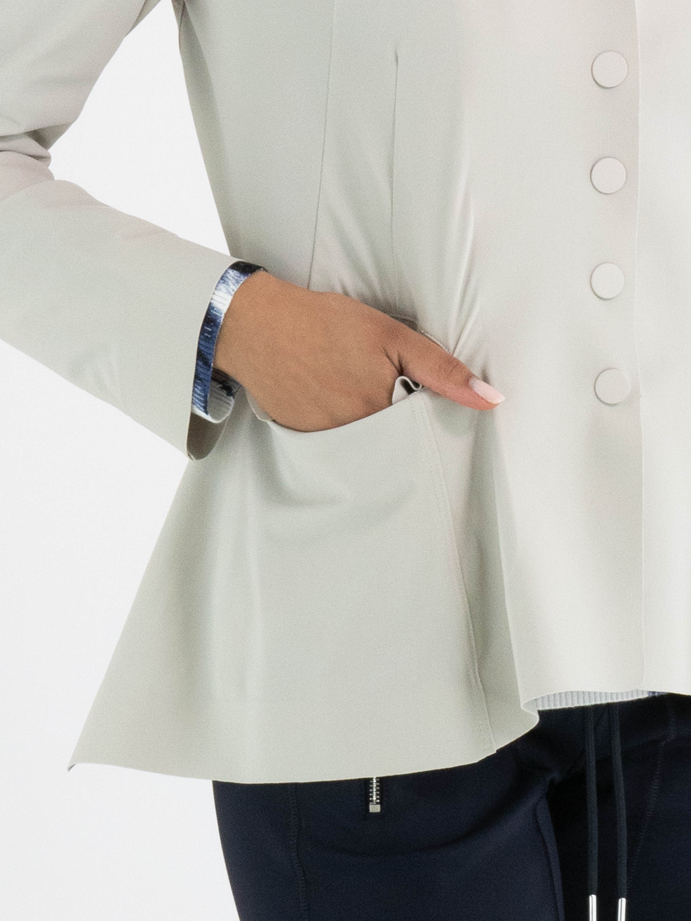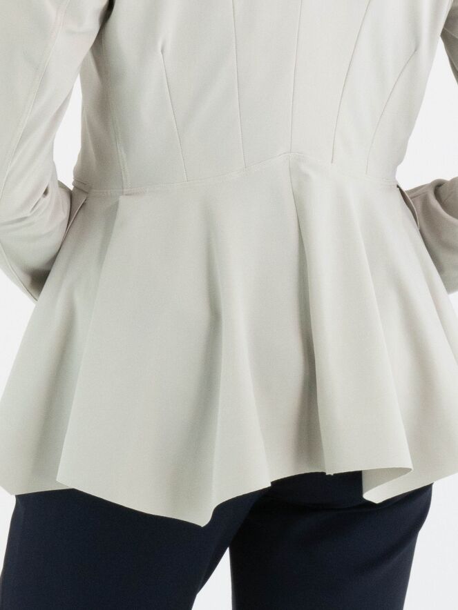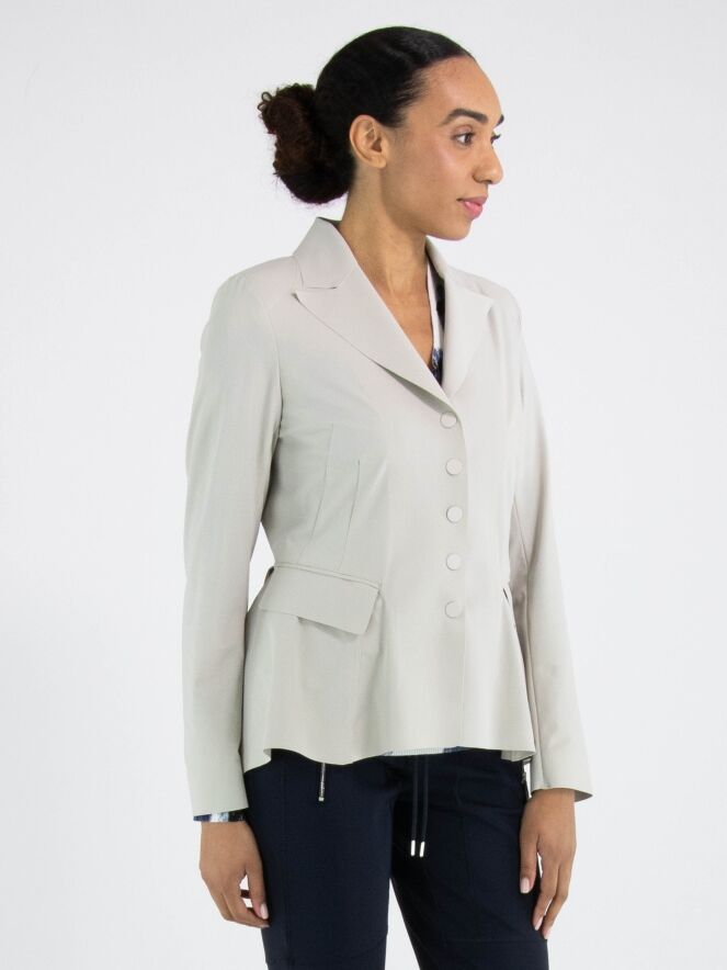 Een blazer van High Tech in een kitkleur. De blazer heeft een sluiting met 5 drukknopen. Aan de achterkant is ter hoogte van de taille een stiknaad van waaruit de stof naar beneden golvend is geplooid, en boven deze stiknaad bevinden zich meerdere taillenaden. De blazer is ongevoerd en mag op de hand worden gewassen.